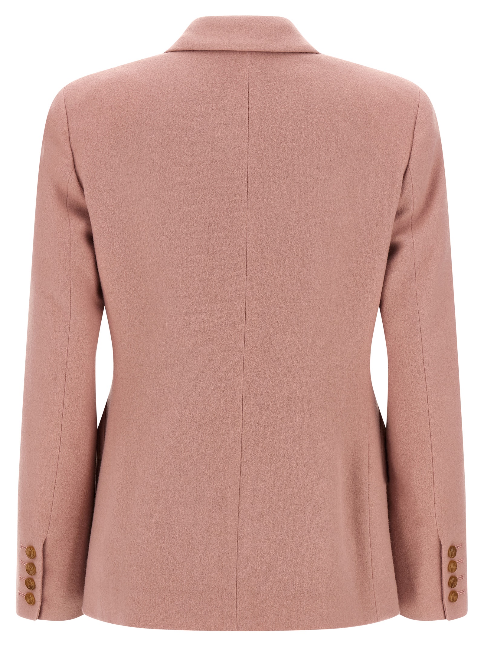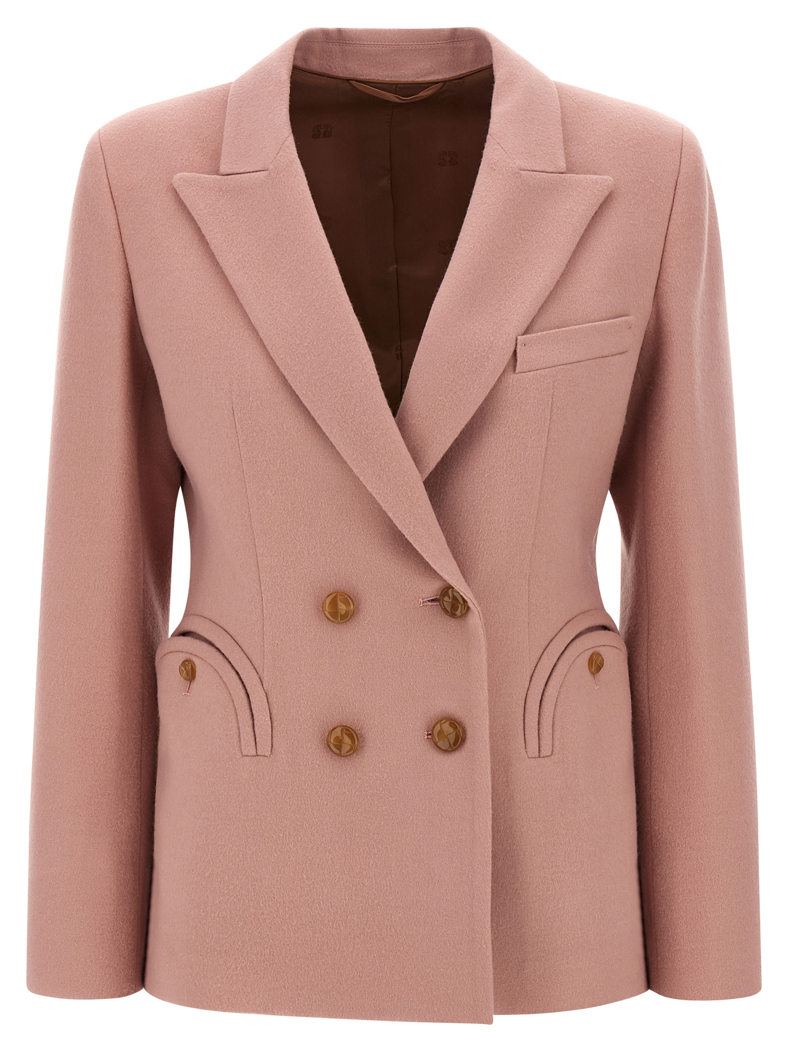 ‘Mystere Charmer’ double-breasted hourglass blazer in wool and cashmere with front button closure, peak lapels, breast pocket, ‘Smiley’ pockets, long sleeves, structured shoulder strap, monogram viscose lining.