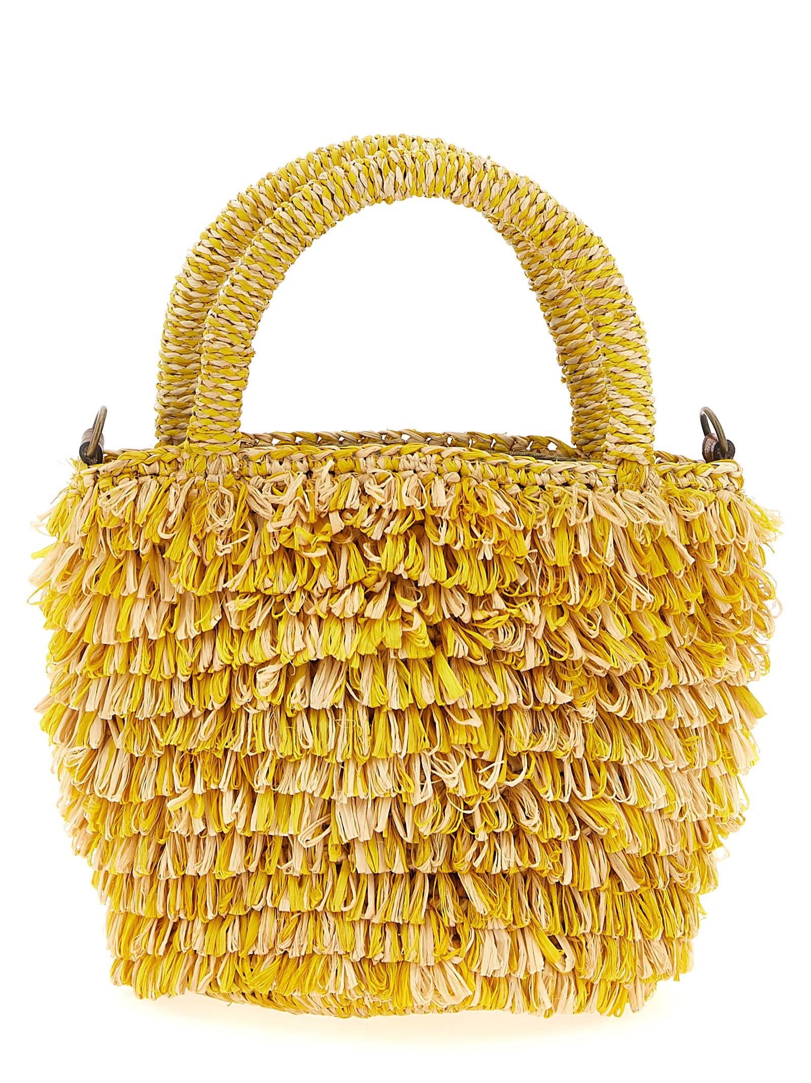 ‘Naka’ handbag in natural raffia with drawstring pouch closure, double fixed handle, removable woven leather shoulder strap.