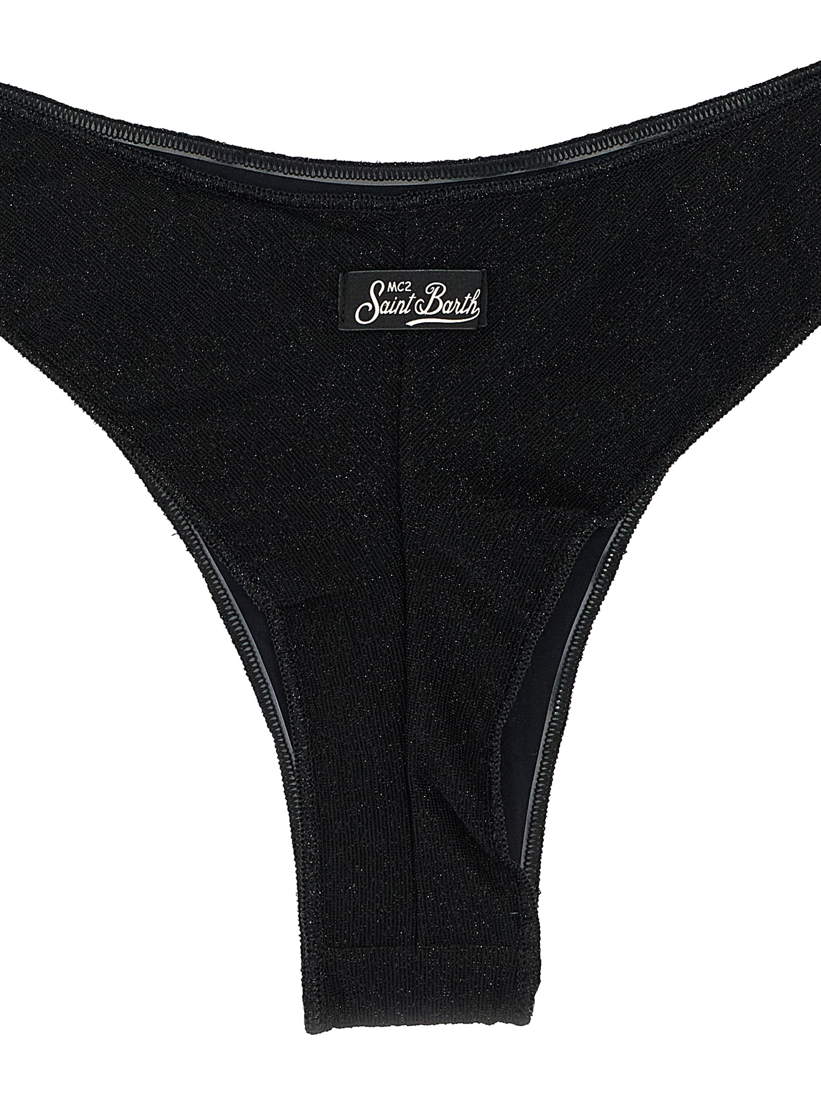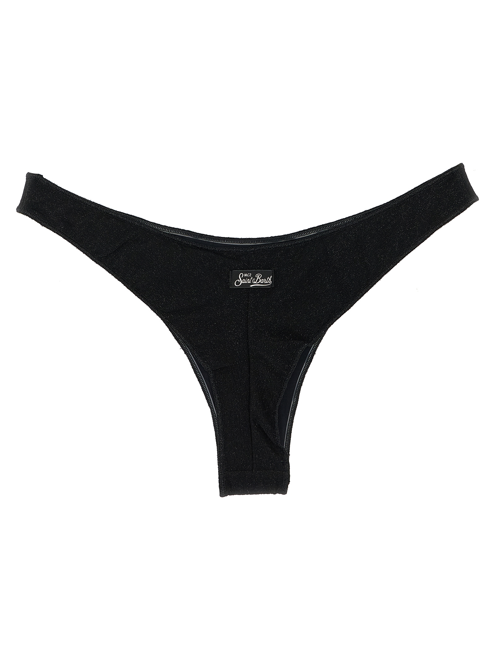 ‘Naomi’ bikini bottoms in crinkle lurex fabric, cheeky model with reduced coverage and back logo patch.