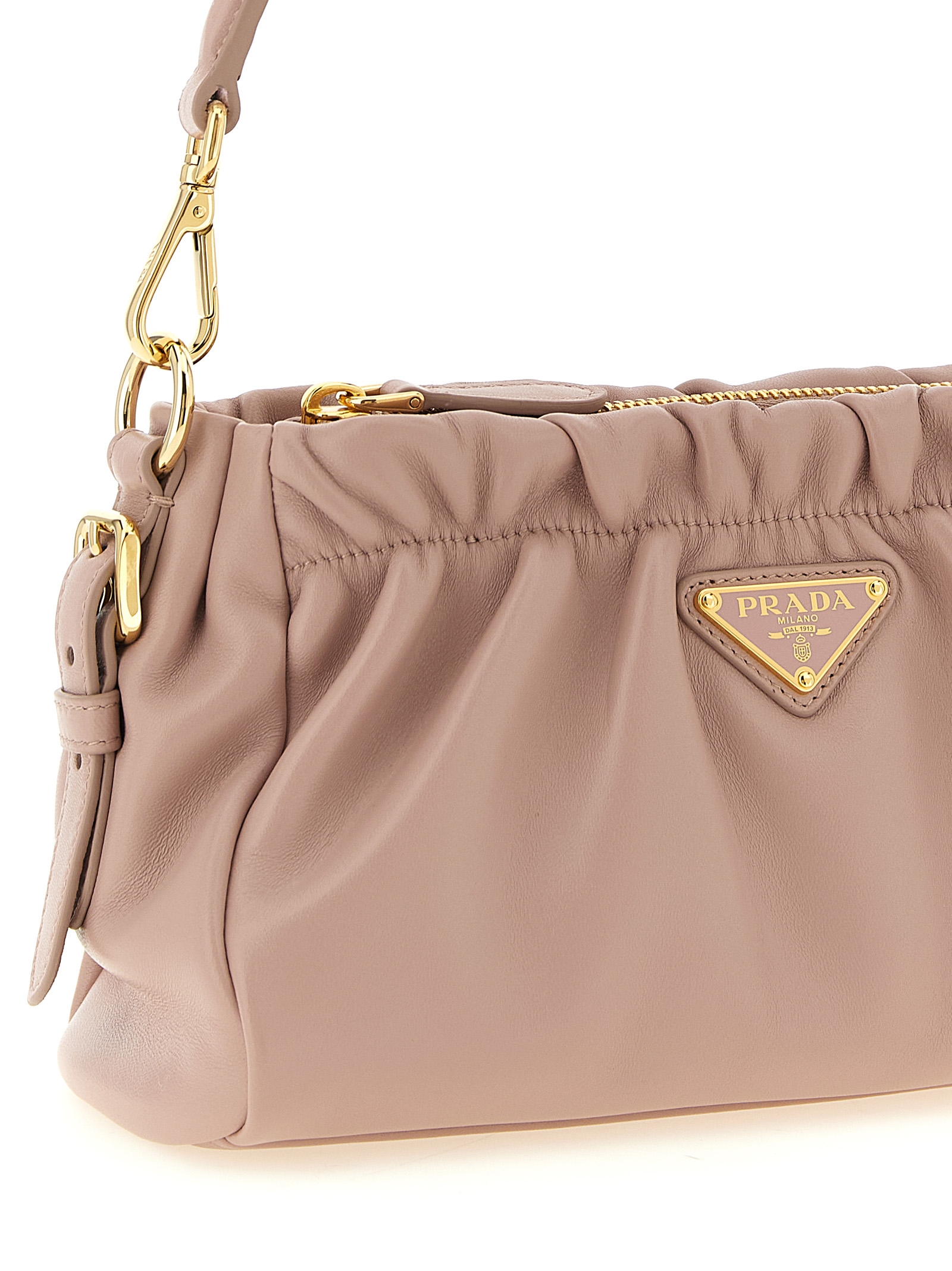 Nappa crossbody bag, curled with zip closure, side buckle straps, front enameled metal logo, removable leather handle and adjustable and removable leather shoulder strap.