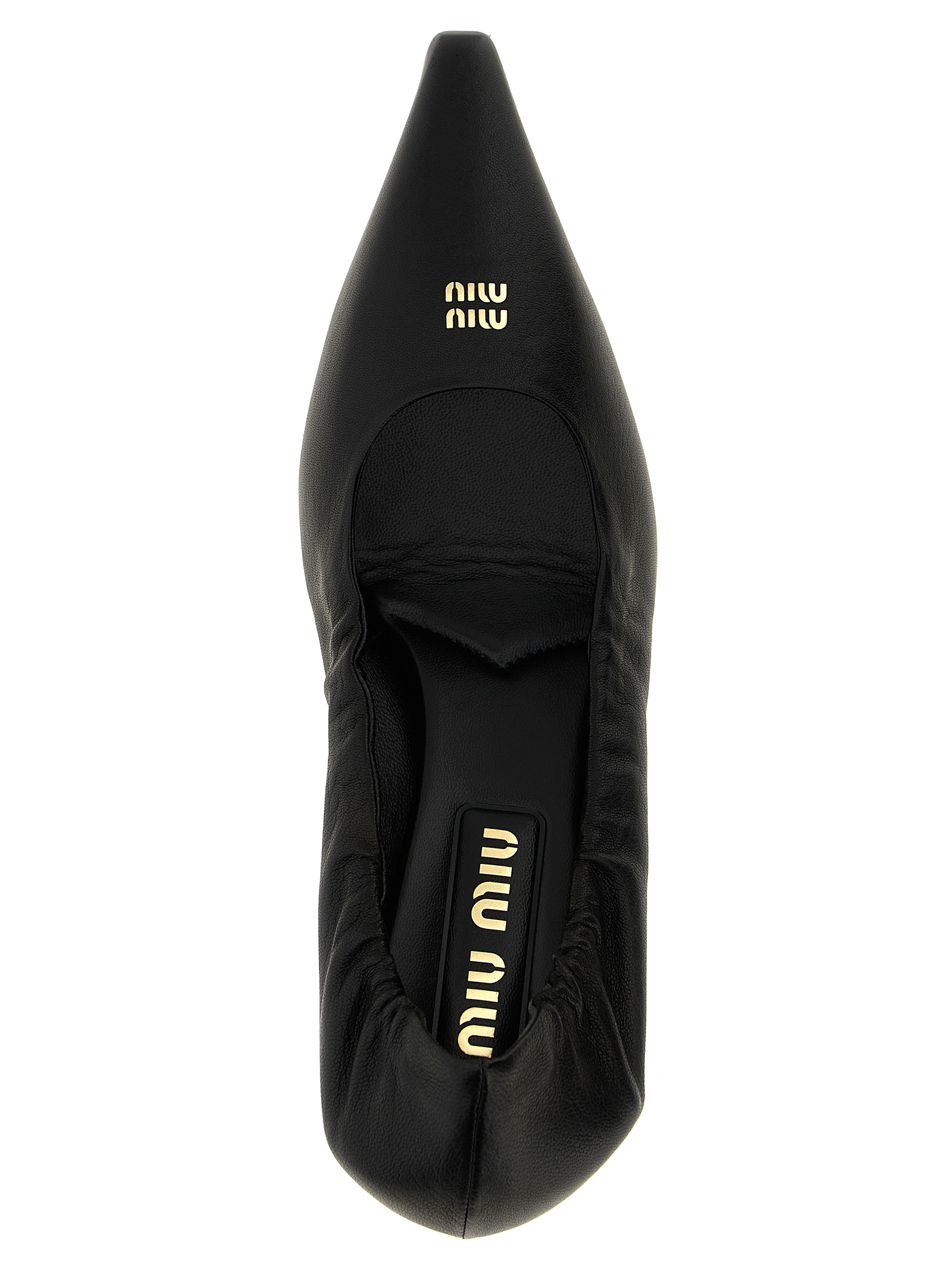Nappa décolleté, square toe with front logo, elastic back, heel, leather sole.