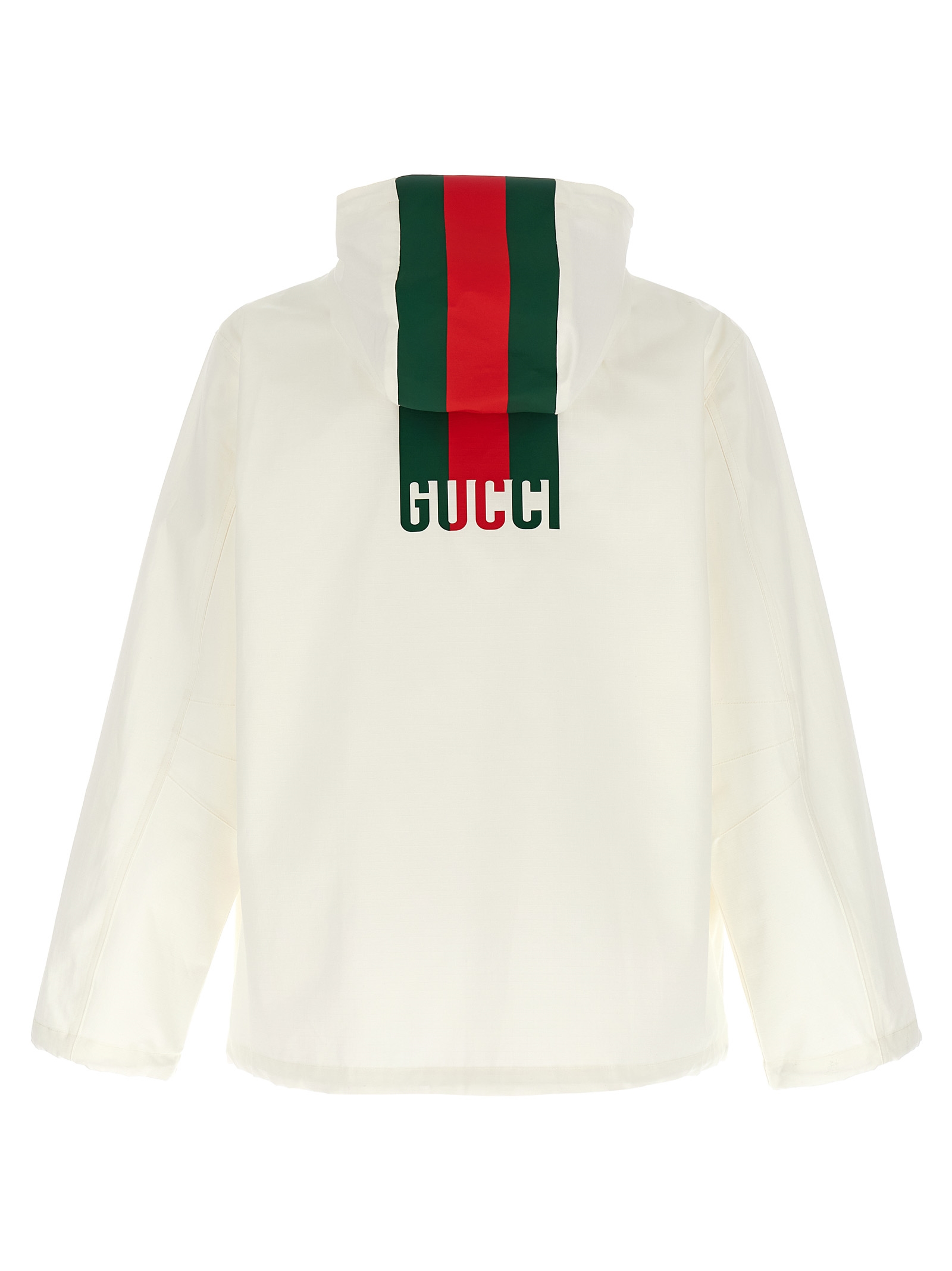 Water-repellent cotton jacket with drawstring hood, tone-on-tone logo patch on the front, pockets, long sleeves, drawstring at the hem, print