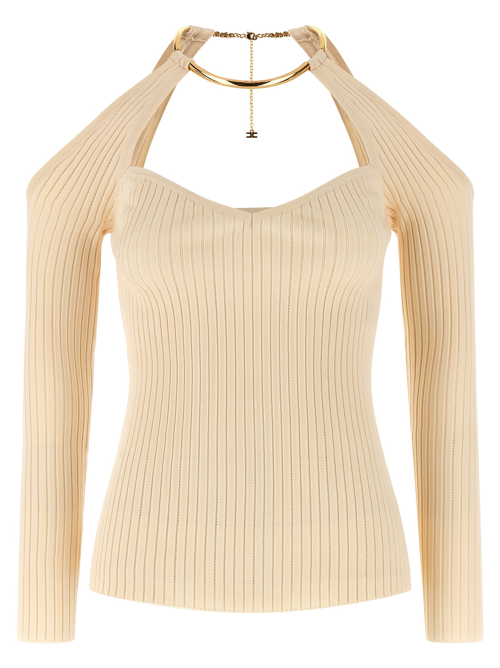 Off-the-shoulder stretch viscose blend sweater with adjustable semi-rigid metal necklace with snap hook closure and cut-out front and back, front heart-shaped neckline and long sleeves.