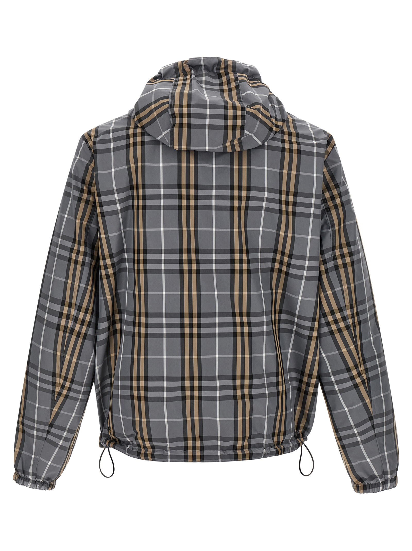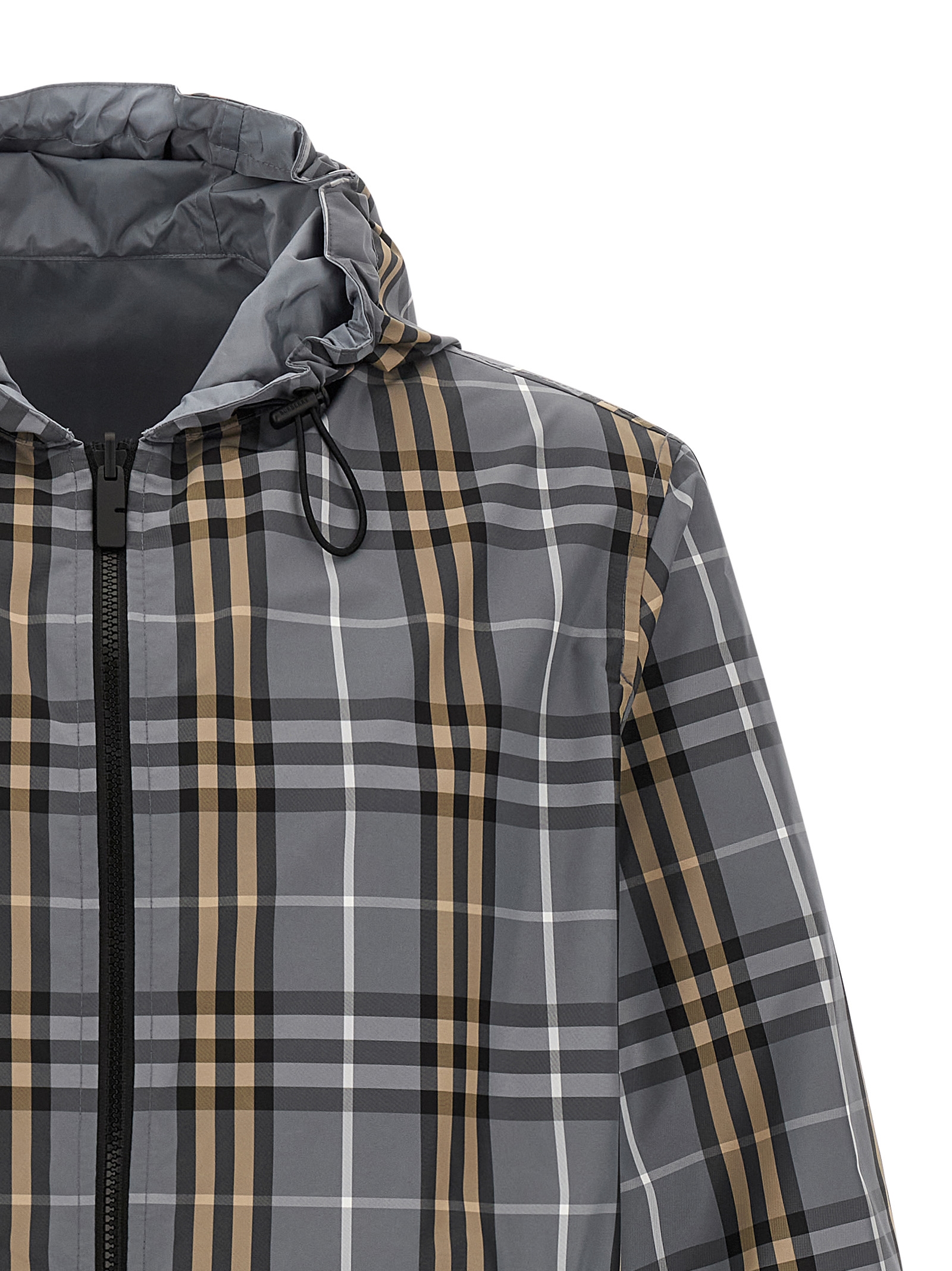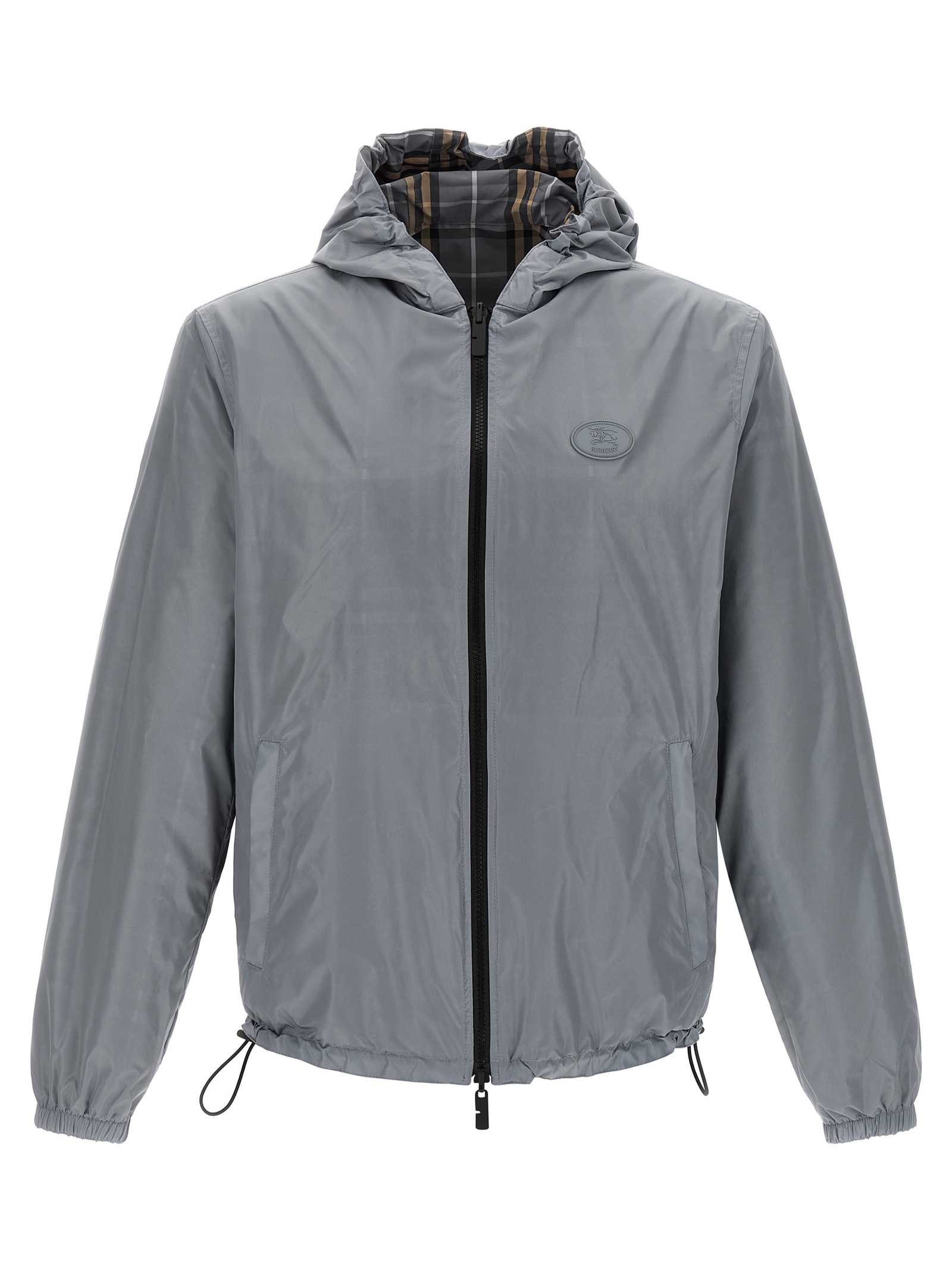 Solid and woven nylon ‘Newport’ reversible jacket with Burberry Check, adjustable hood, tonal ‘Knight Stamp’ patch, high neck, front zip closure, pockets, long sleeves with elastic cuffs, drawstring at the hem.