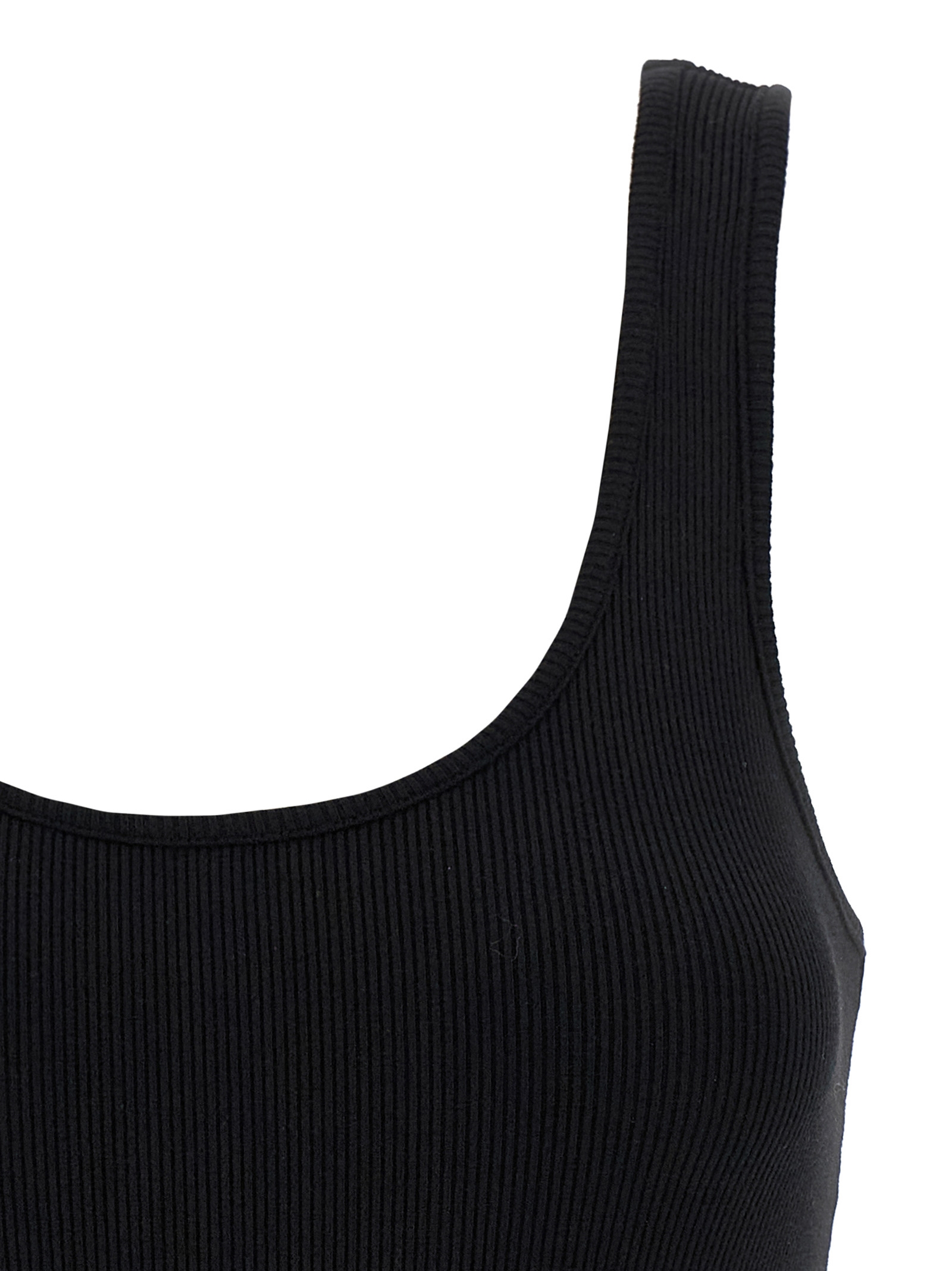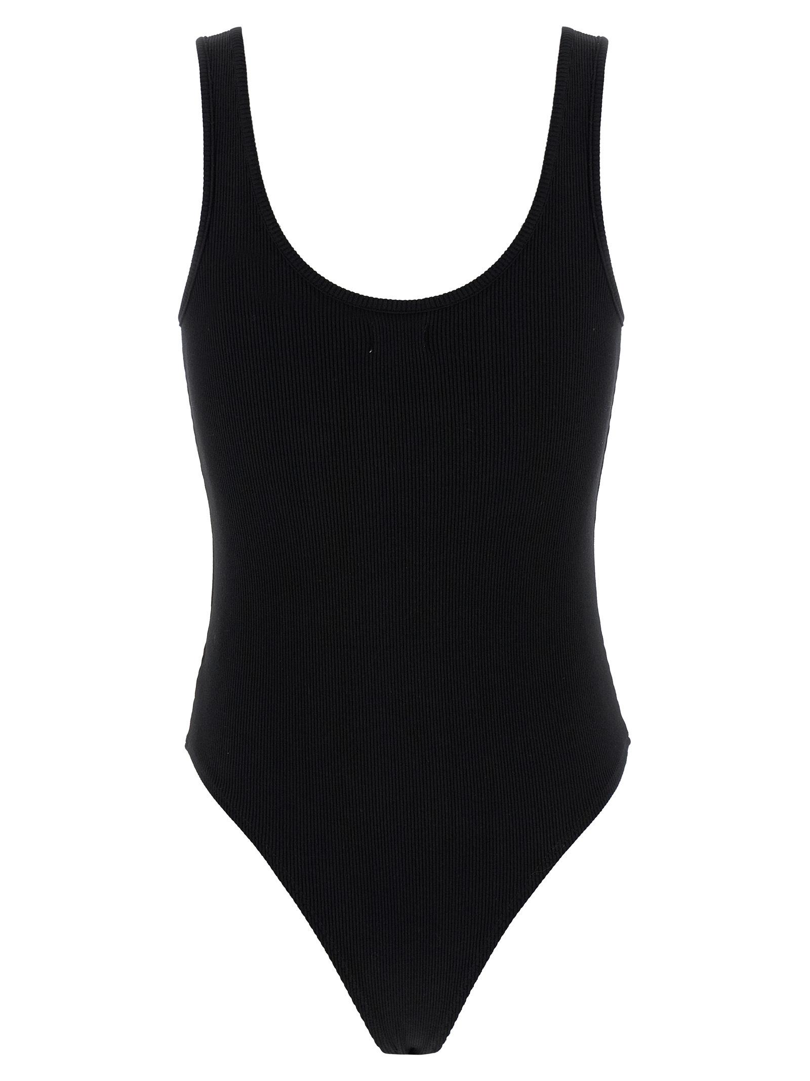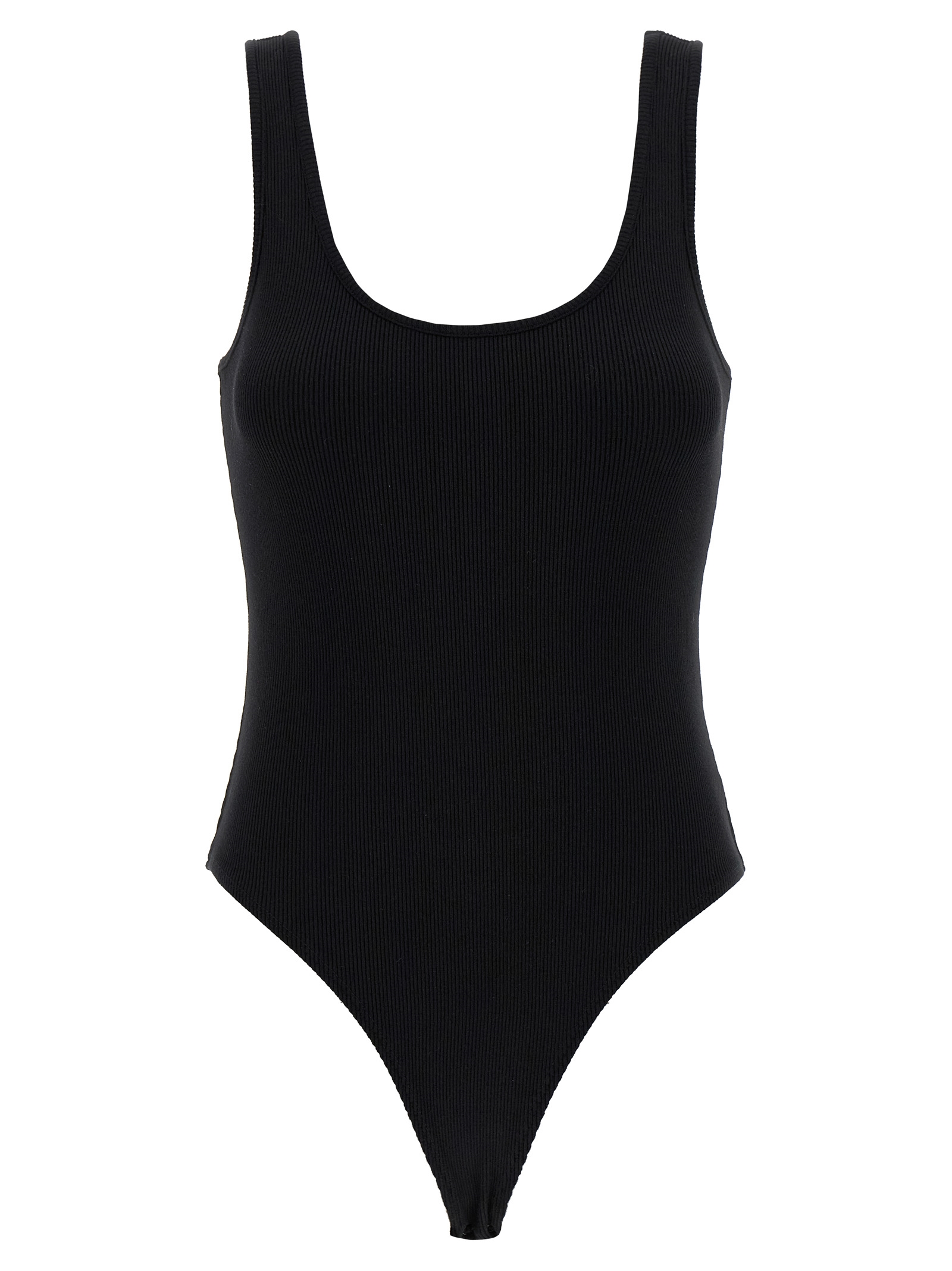 ‘Nica’ sleeveless bodysuit in premium stretch cotton knit with wide round neckline at the front and back, snap buttons on the hem.