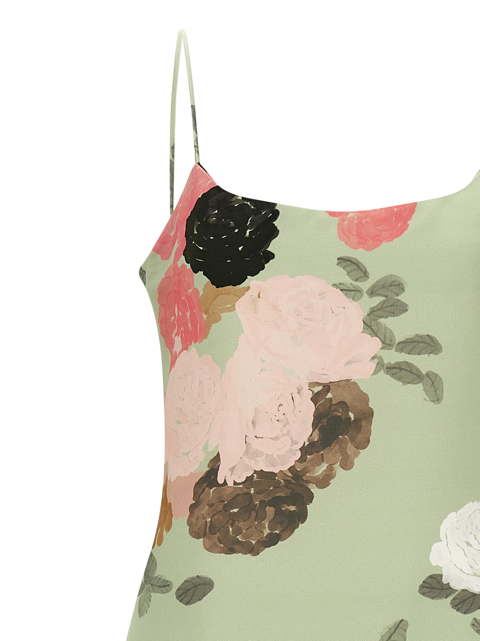 Nicole’ long dress in sturdy fabric with an Auscot Rose print satin silk feel, flared silhouette with wide skirt, wide neckline at the front and back, thin straps, side zip closure, pockets, lining.