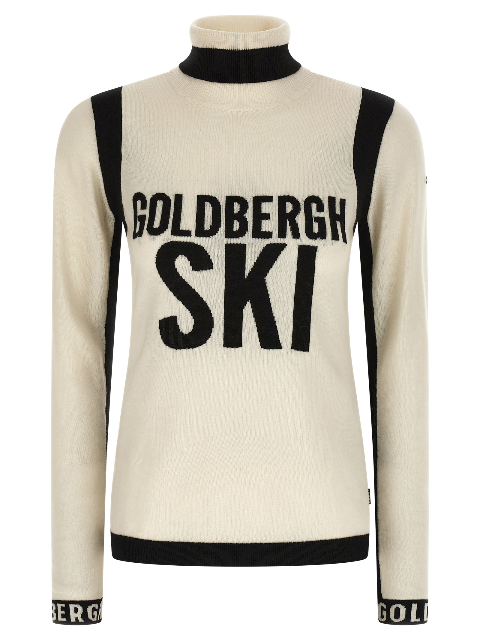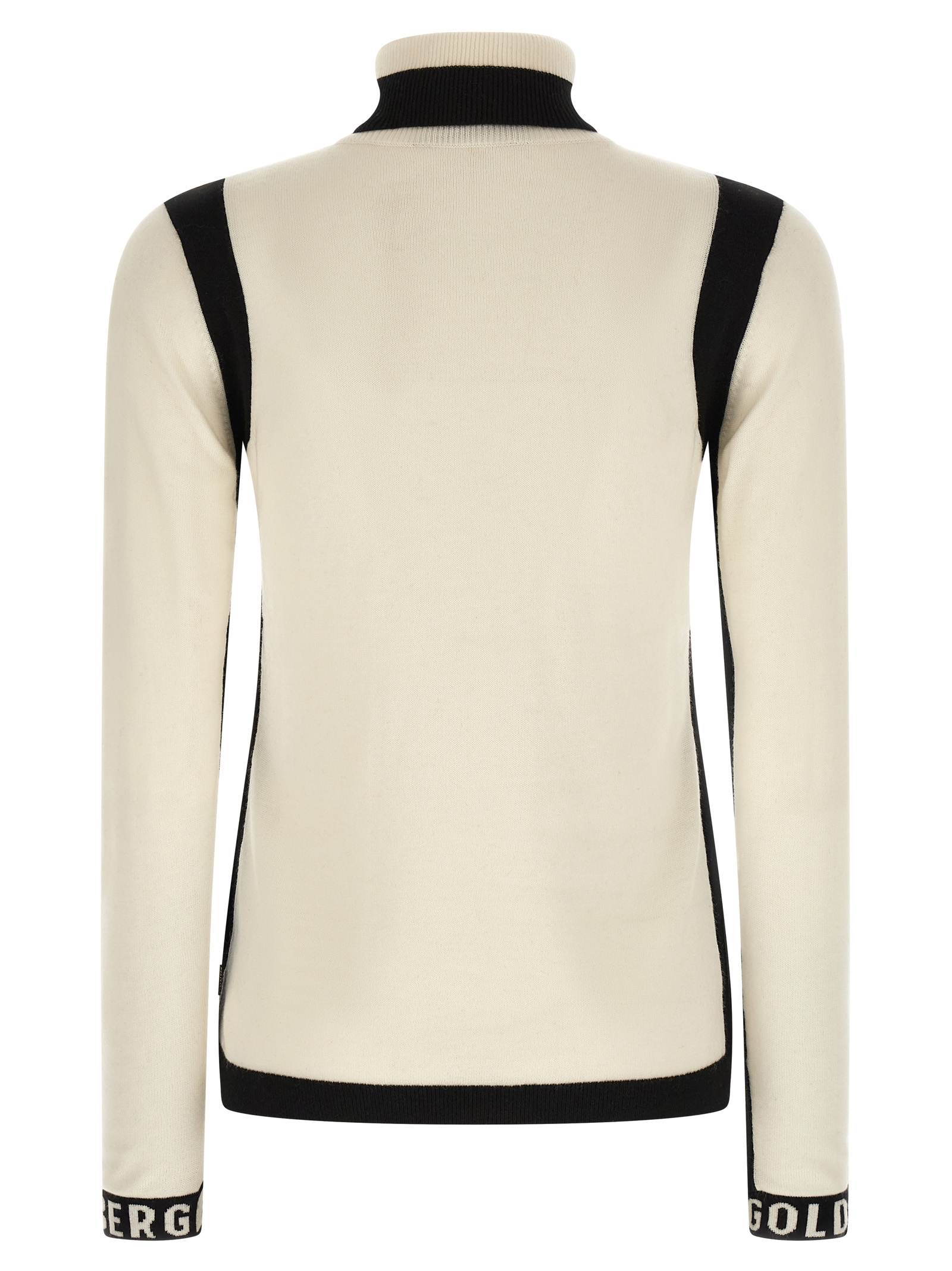 Noemi’ merino wool blend turtleneck sweater with jacquard patterns, turned-up high neck, long cuffed sleeves and a metal logo tag.