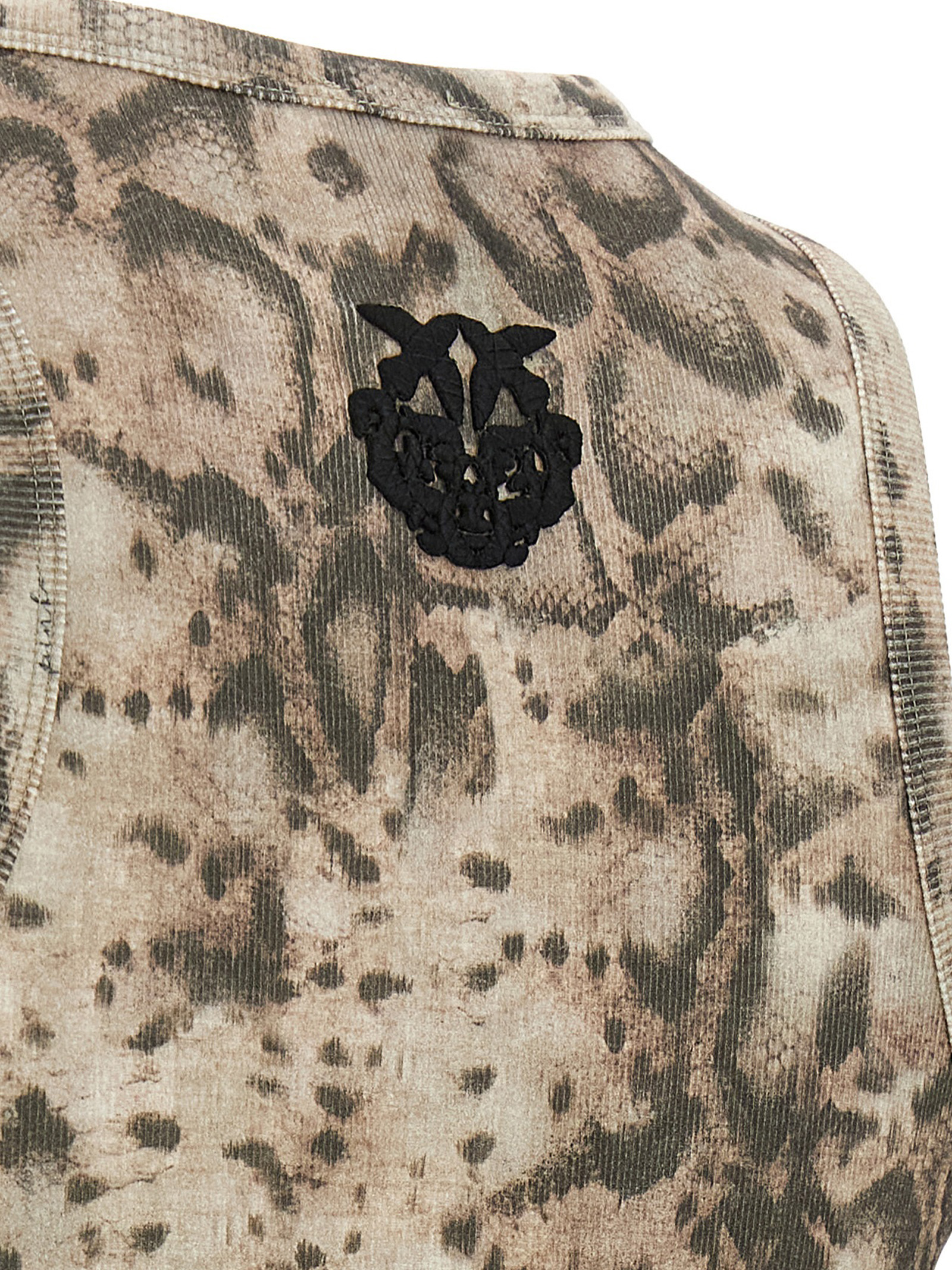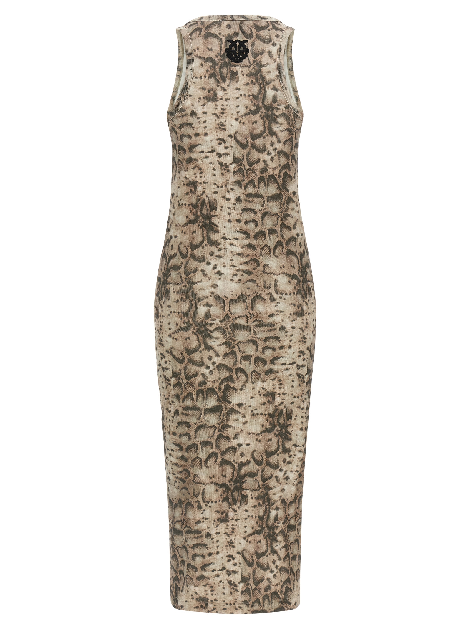 Long ‘Novoli’ dress in stretch cotton with animal print, straight silhouette, round neckline at the front, Love Birds Diamond Cut embroidery at the back, sleeveless.