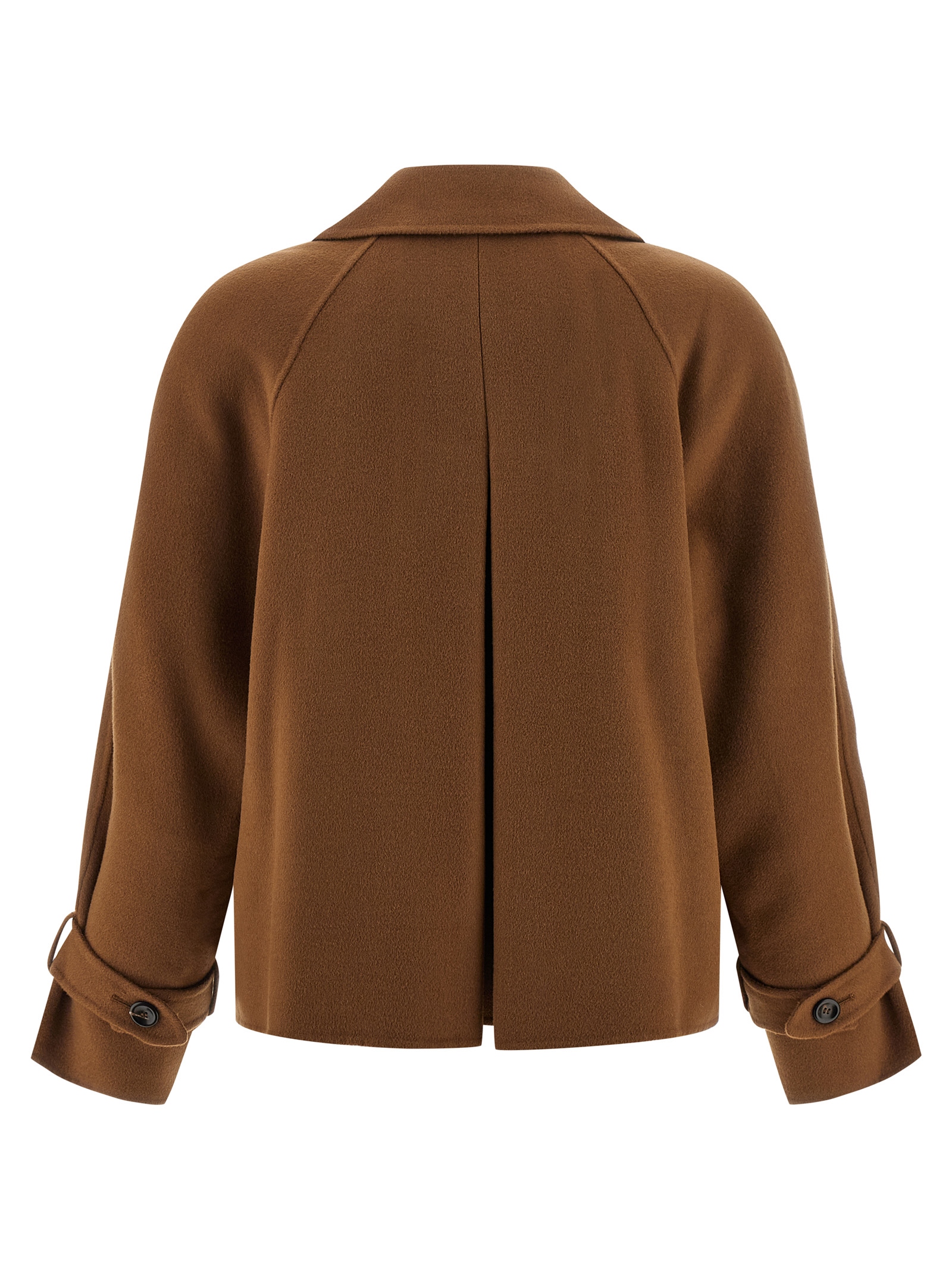 ‘Nupar’ double-breasted crop coat in wool, silk and cashmere blend with front button closure, lapels, pockets, long sleeves, back gusset.