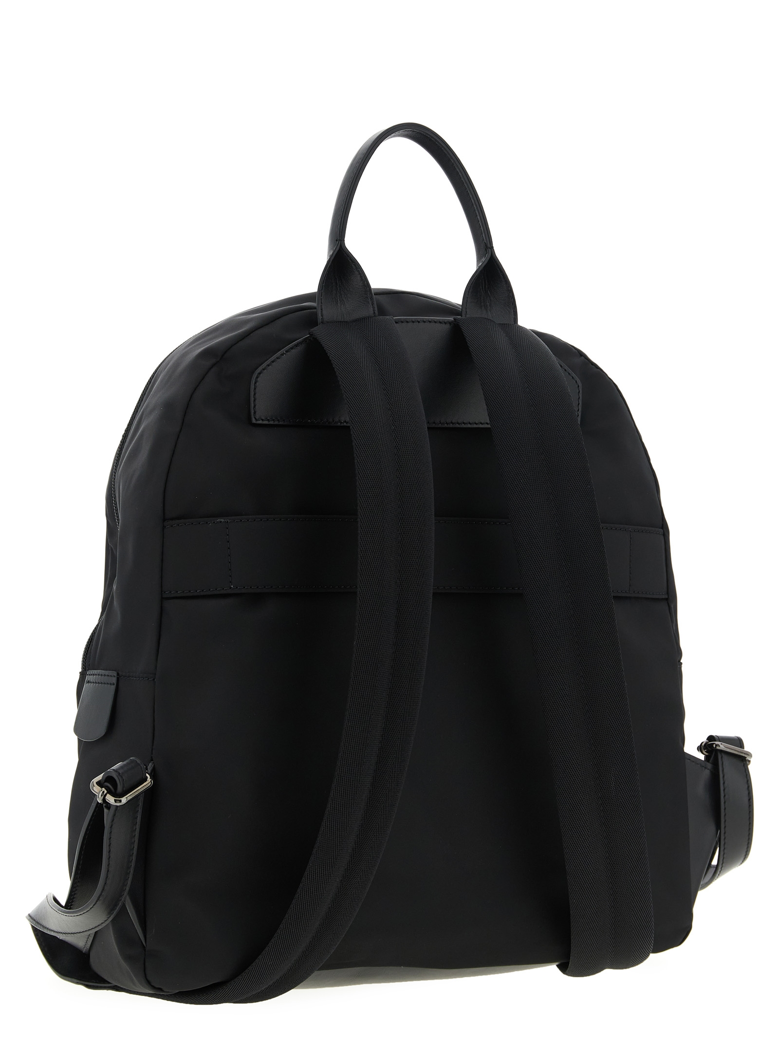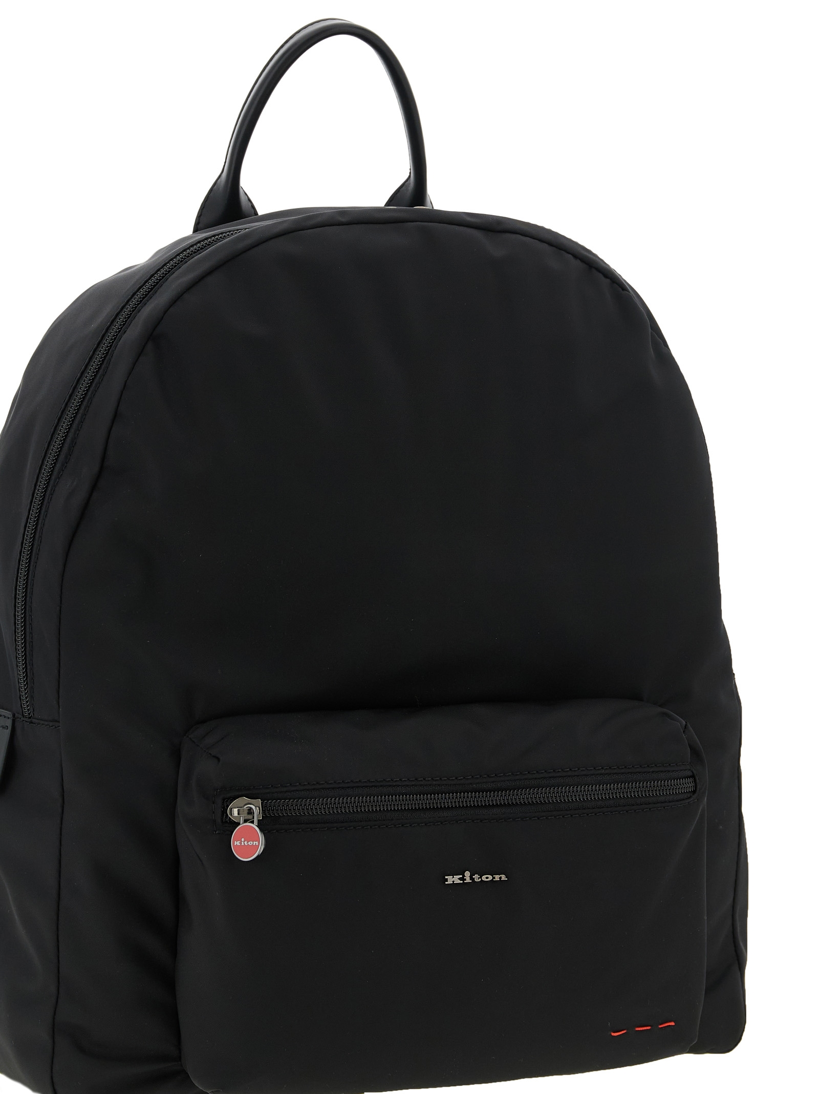 Nylon backpack, zip closure, front pocket, enameled logo tie rods, front logo lettering application.