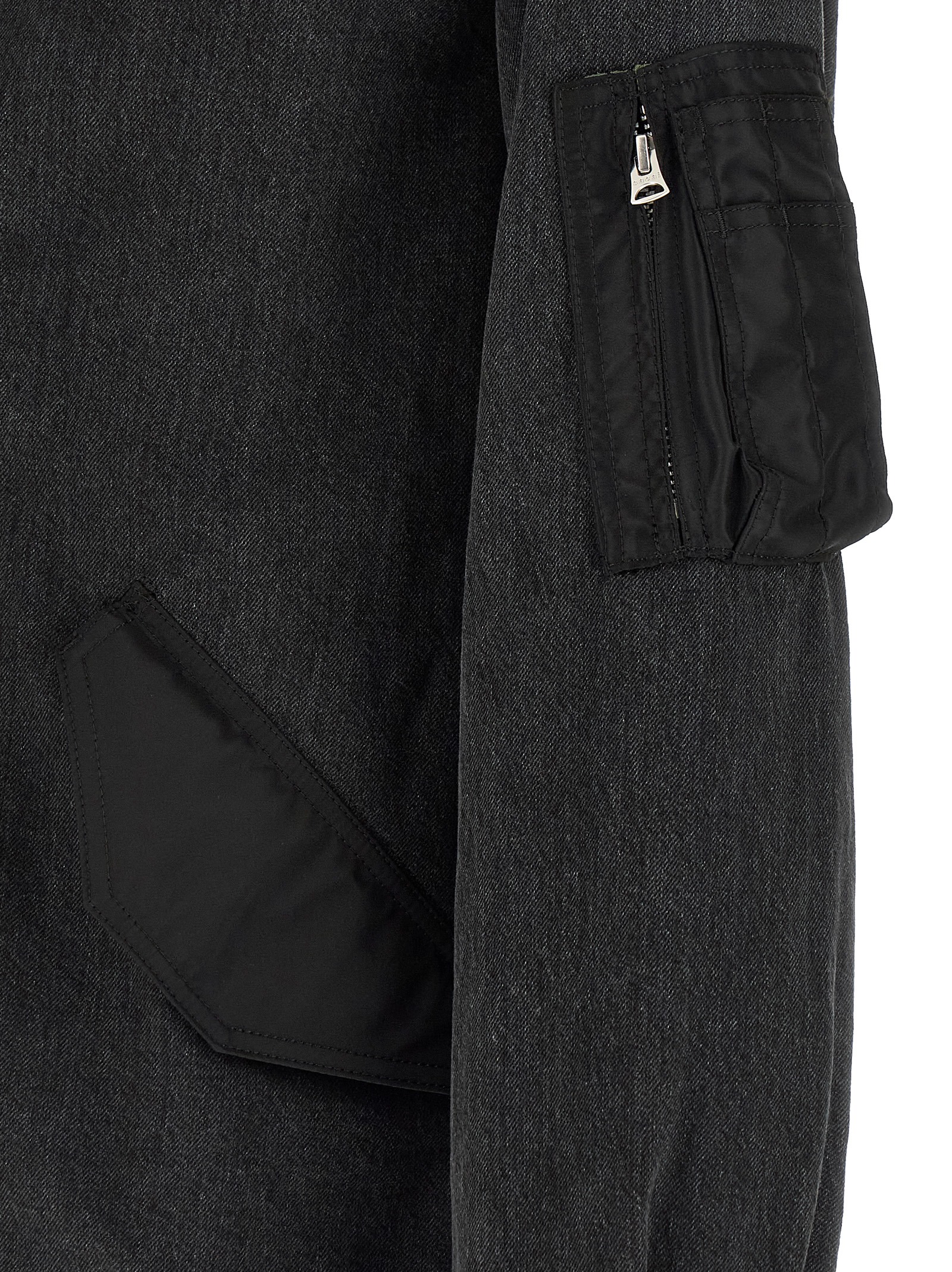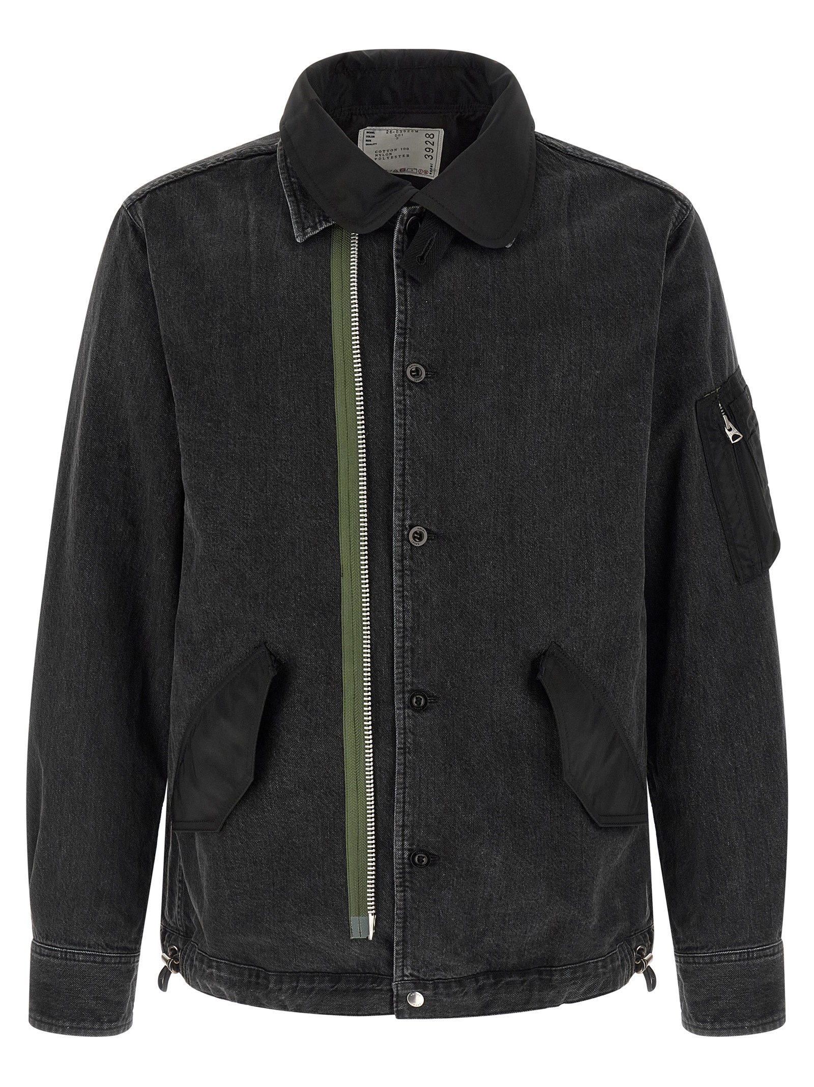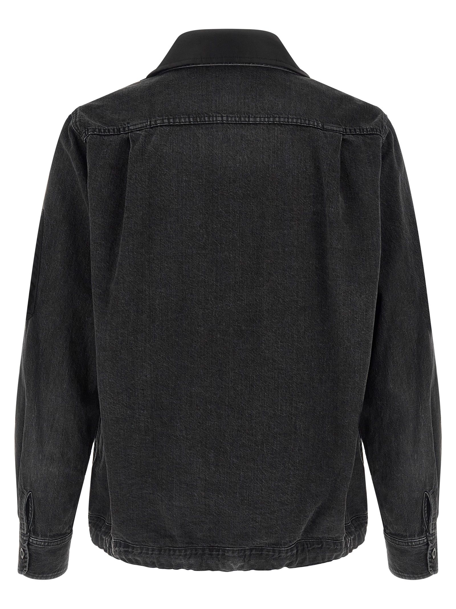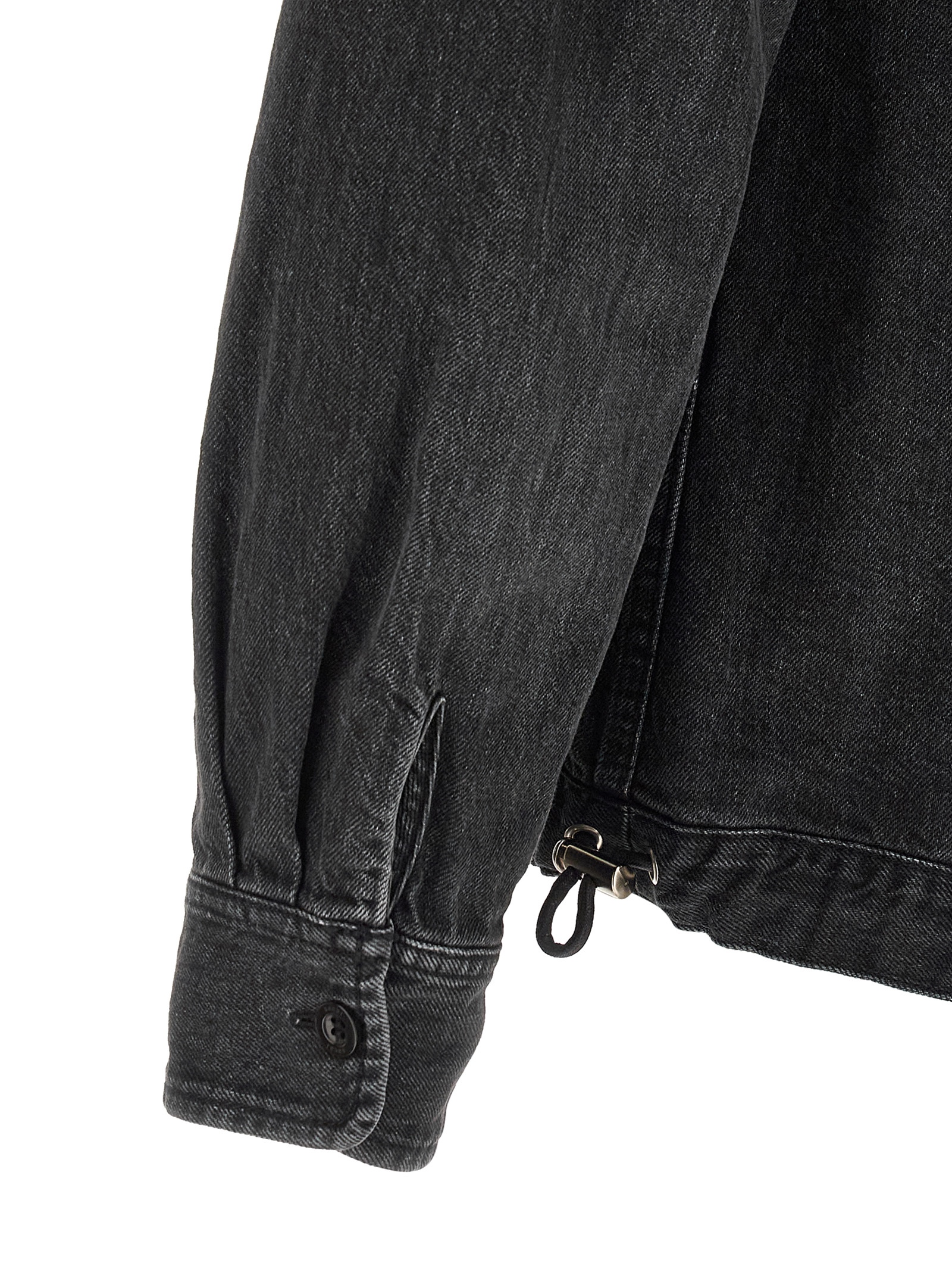 Garment-dyed cotton denim jacket, double layer nylon twill inserts on the front, shirt collar, adjustable asymmetric closure with zip and buttons on the front, pockets, long sleeves with cuffs and dropped shoulders, drawstring on the hem.
