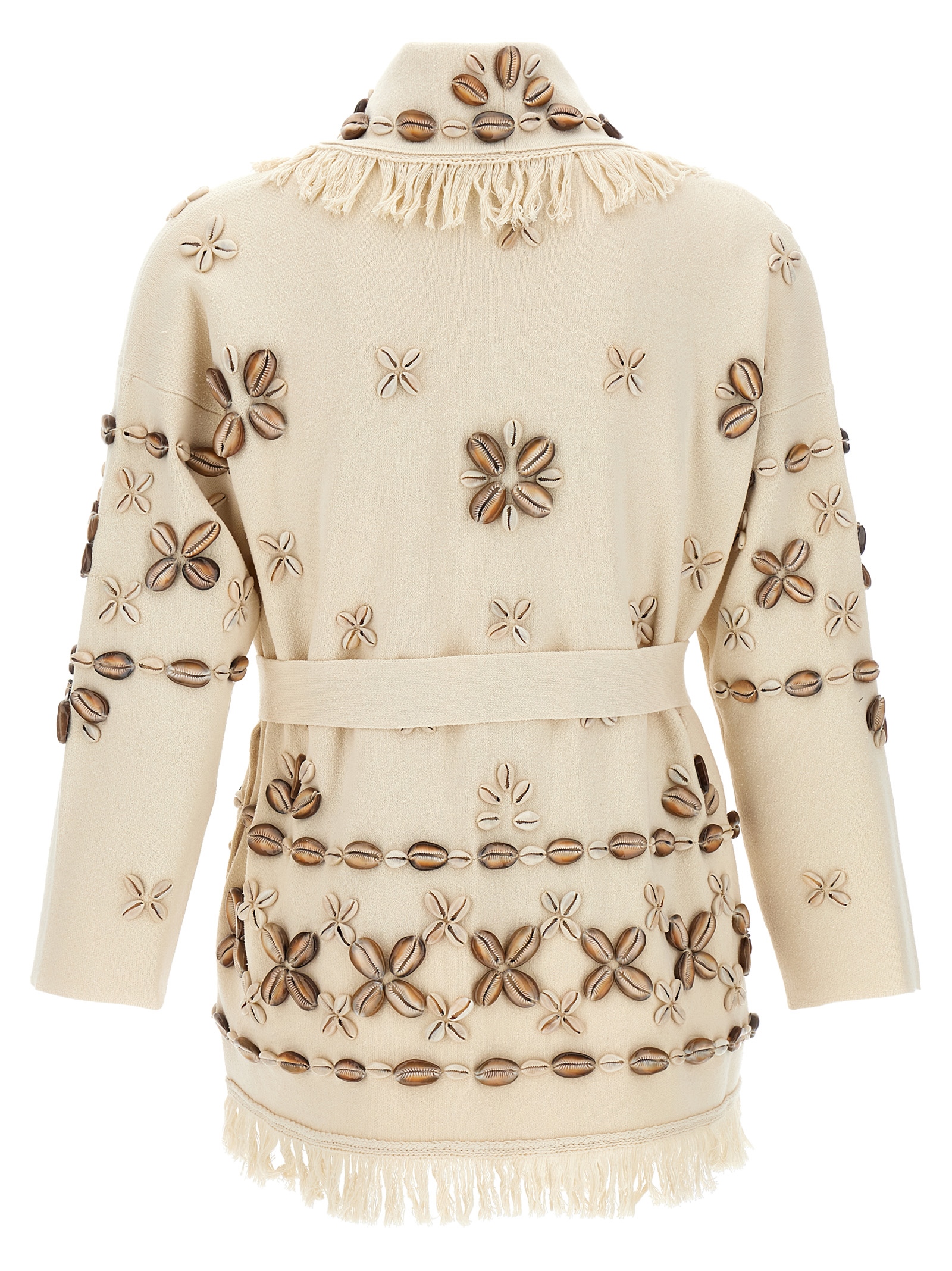 ‘Ocean dream’ silk blend knit cardigan with all-over embroidery with applied shells, V-neck, belt closure at the waist, fringes on the edges, long sleeves.