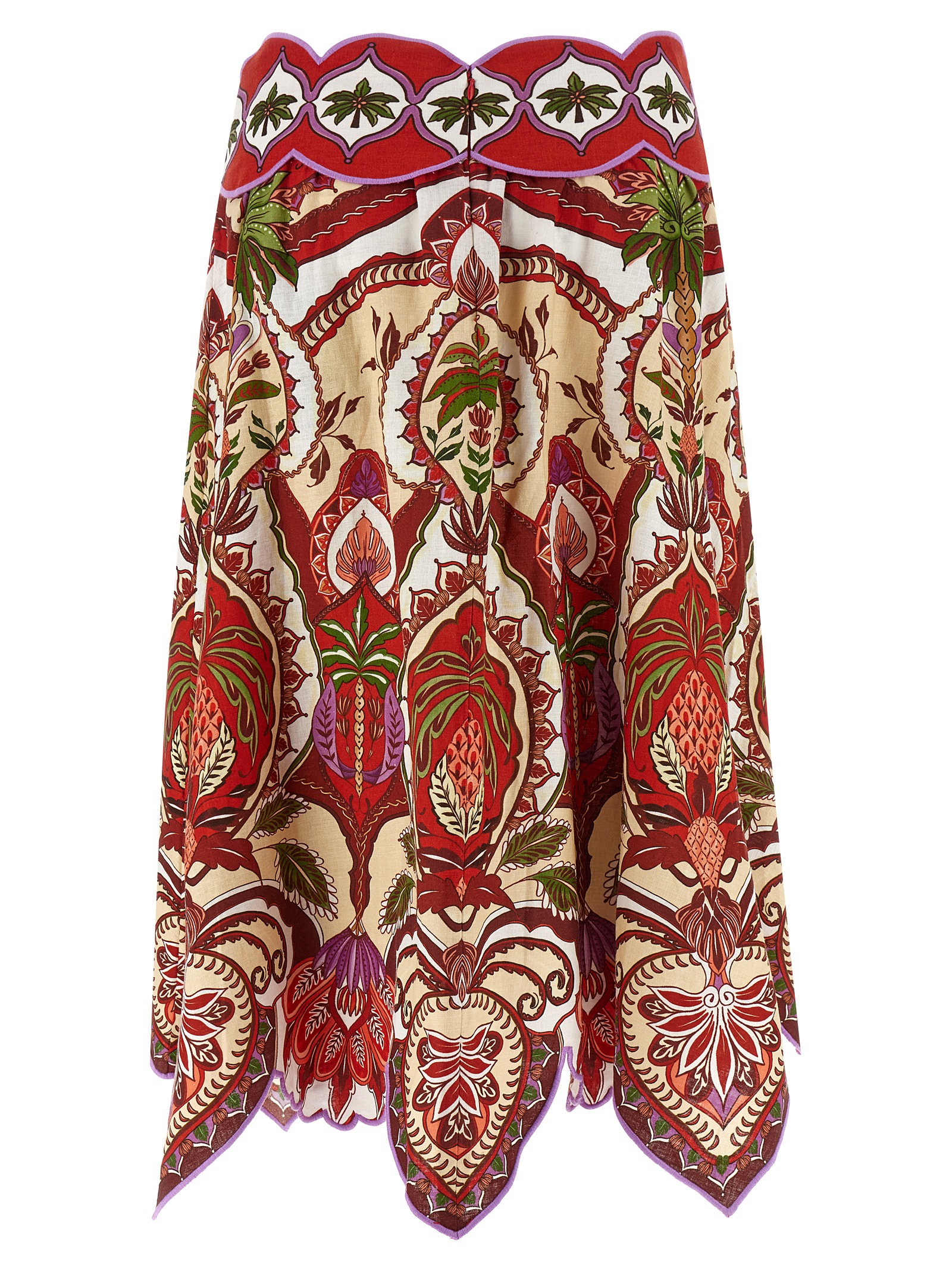 ‘Odara’ midi skirt in Euroflax™ and Ecovero™ Lenzing™, flared silhouette with scalloped edges, back zip closure, asymmetrical hem.