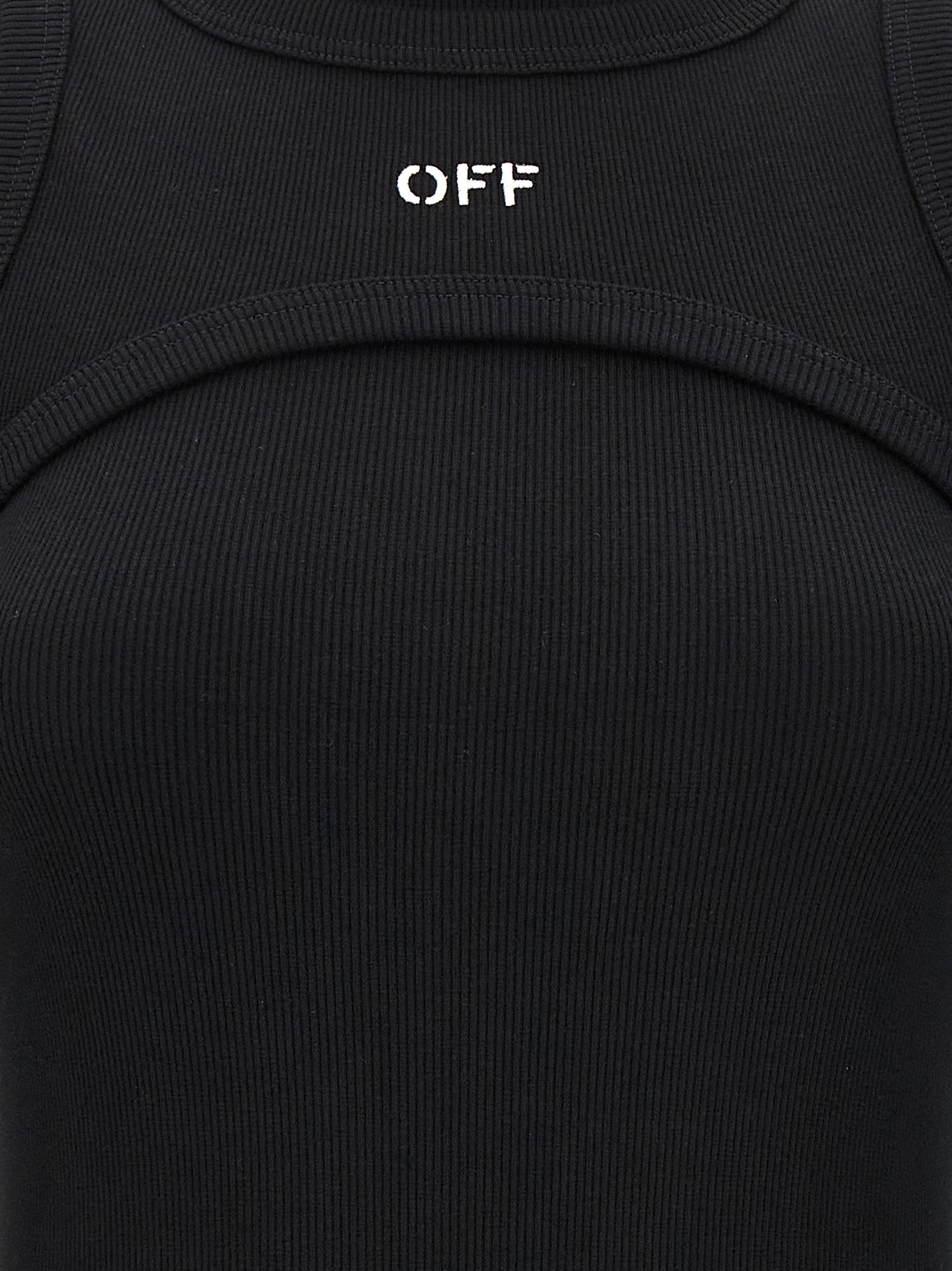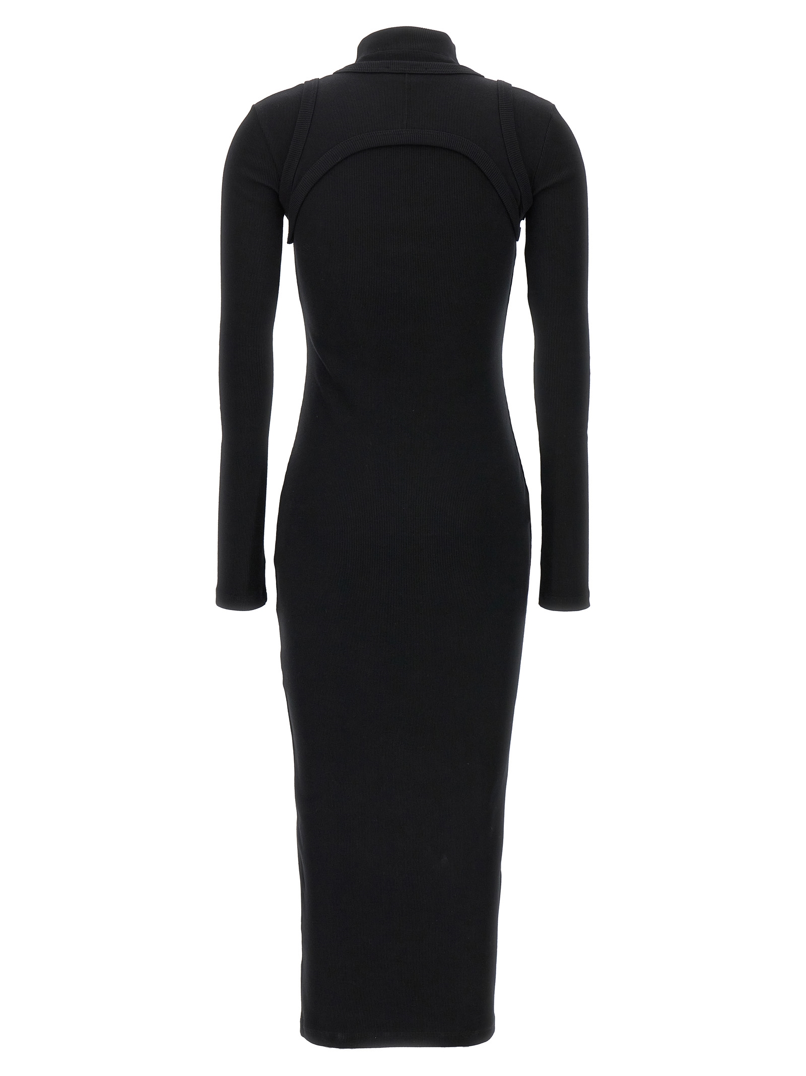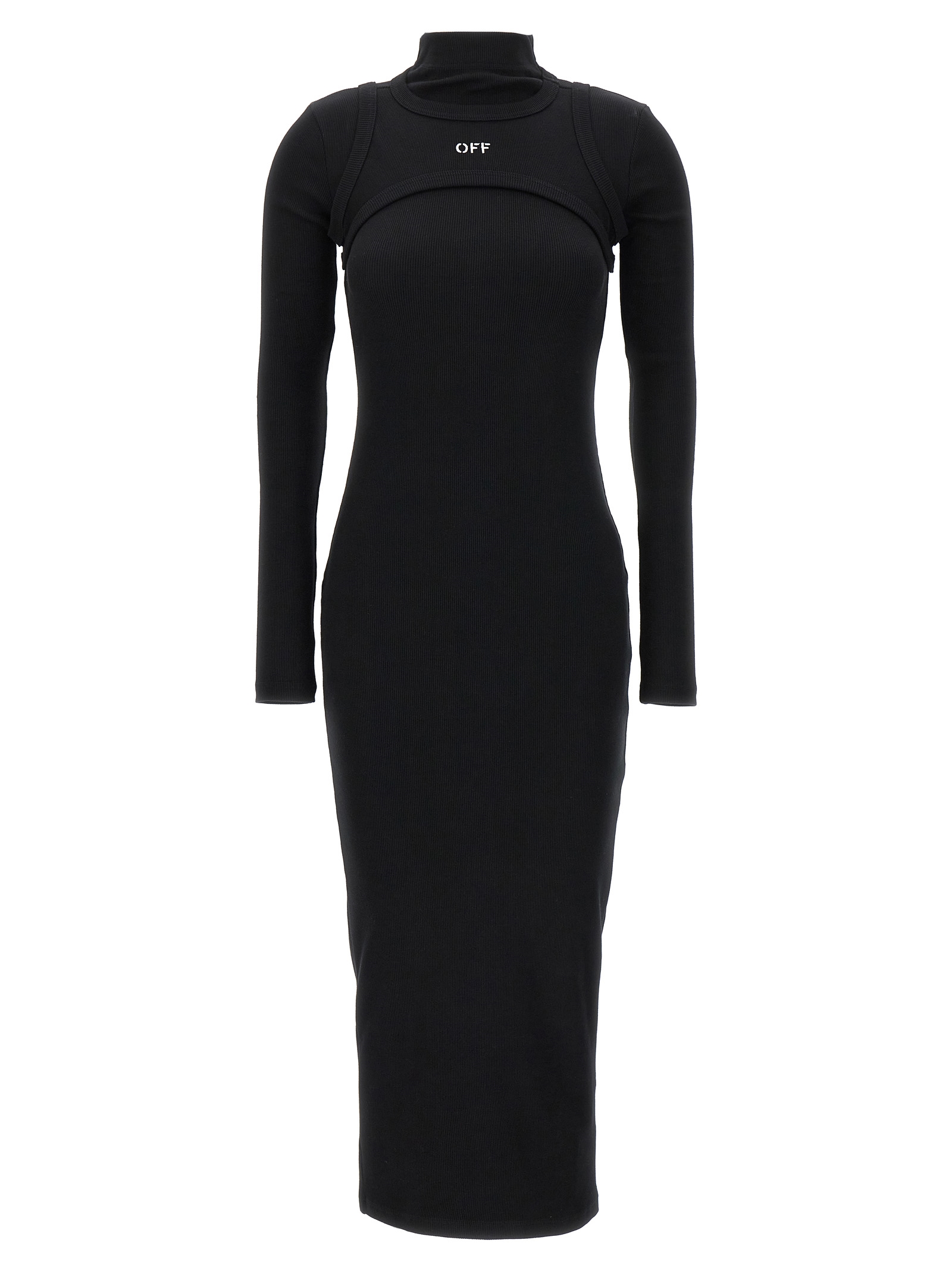 ‘Off stamp’ stretch cotton dress, long model with long sleeves, crewneck, with a bodice-like part on top with embroidered logo.
