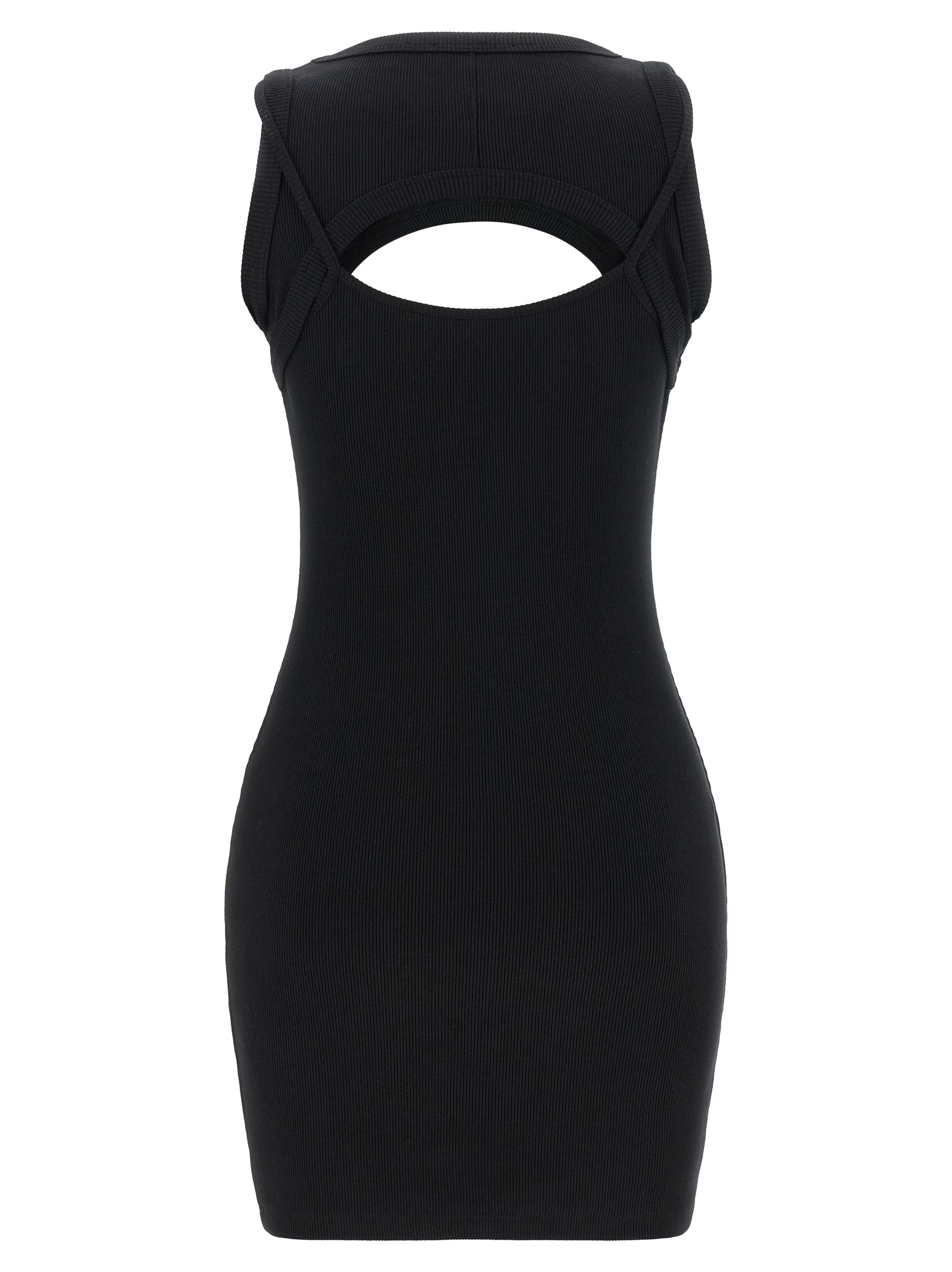 ‘Off Stamp’ ribbed stretch cotton mini dress with double layer upper part with crew neck insert with contrasting logo embroidery, thin straps, sleeveless, round neckline.