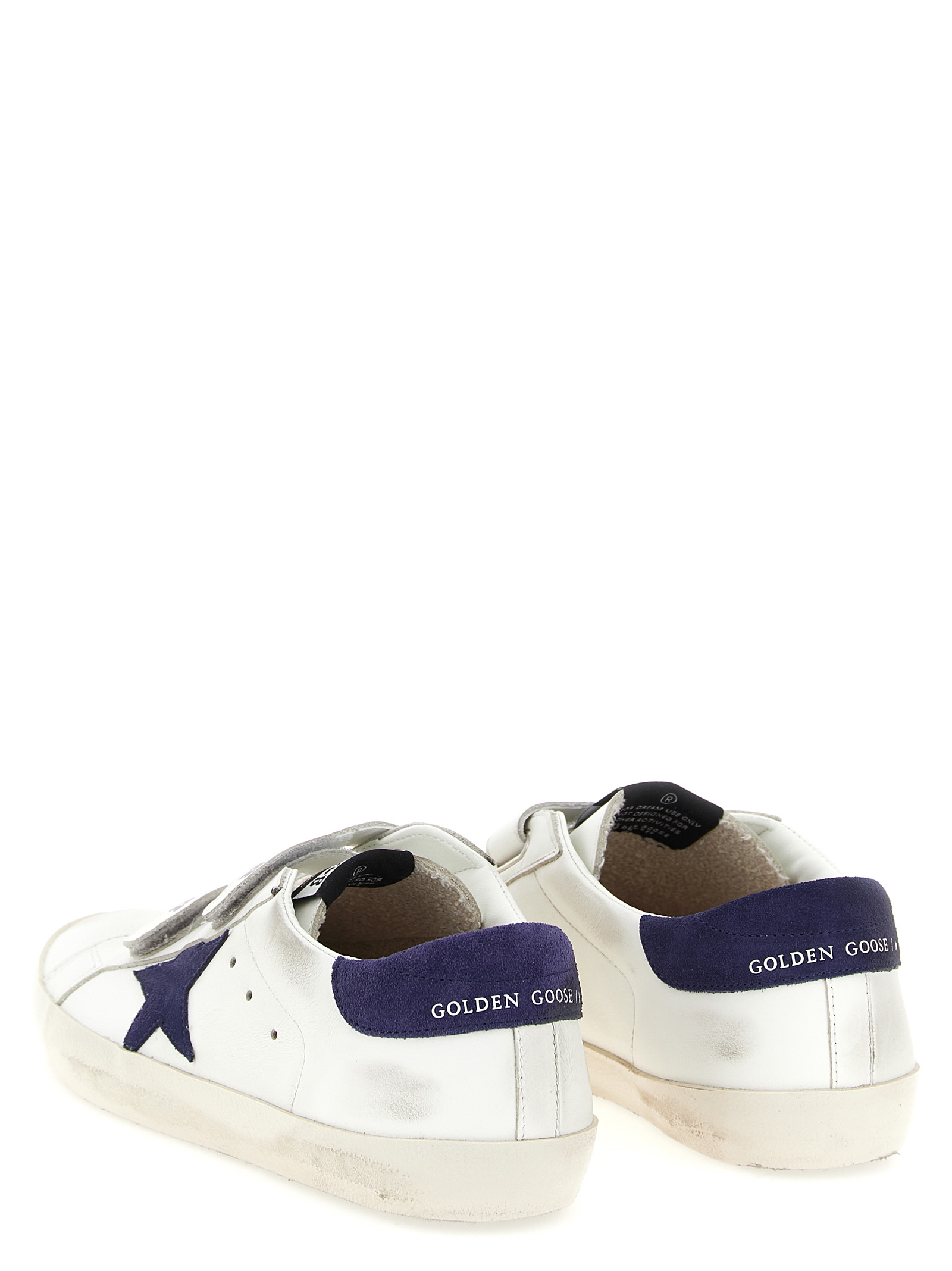 ‘Old School’ used-effect leather sneakers with contrast side star and suede heel, Velcro band closure and logo print, rubber sole with vintage effect treatment.