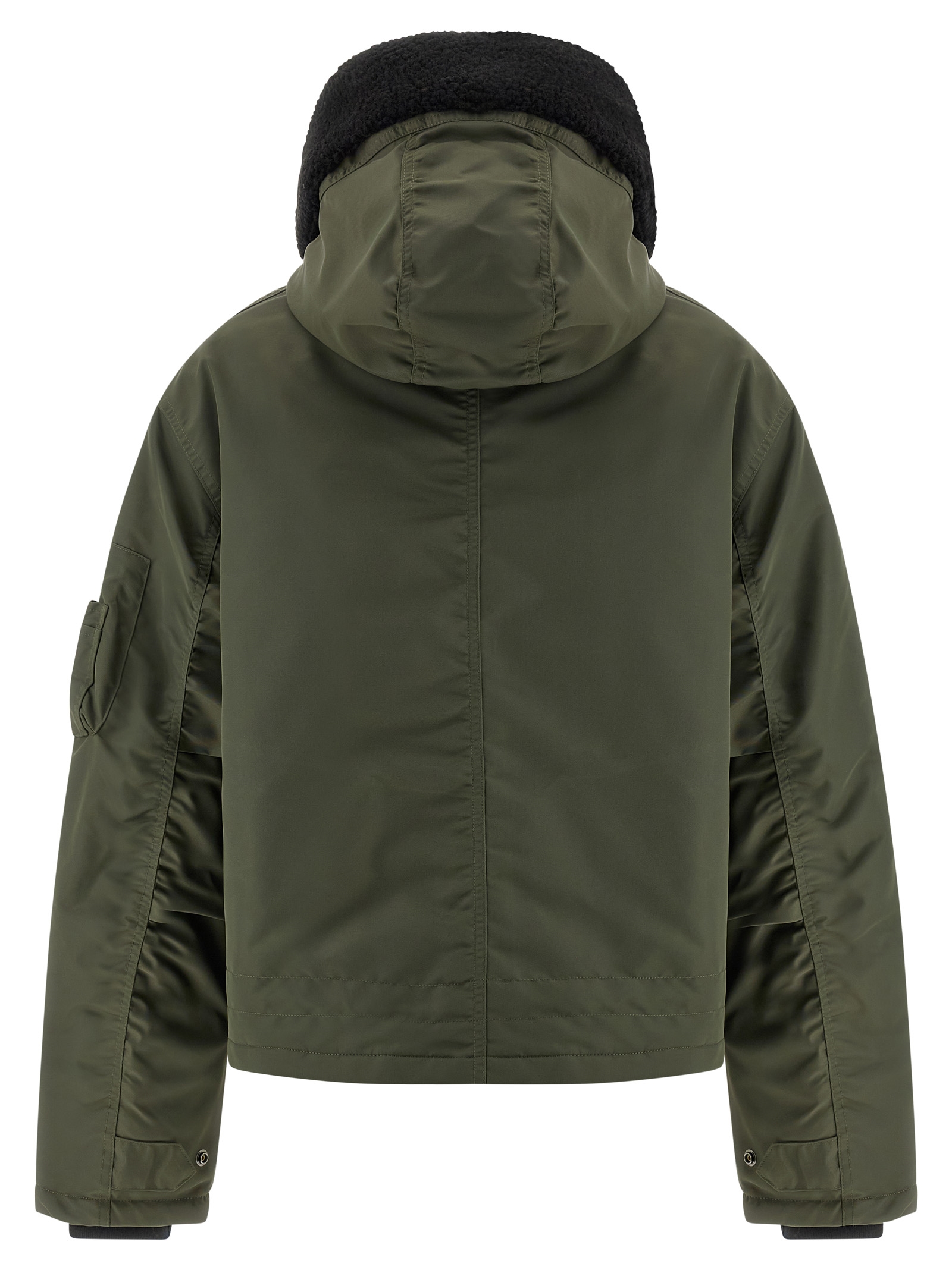 ‘Oltera’ water-repellent medium weight nylon fabric jacket, diamond-shaped quilted lining, adjustable hood with removable teddy-effect fleece insert, crop style, high neck, front zip and button closure, pockets, long sleeves with stretch knit cuffs, drawstring on the hem.