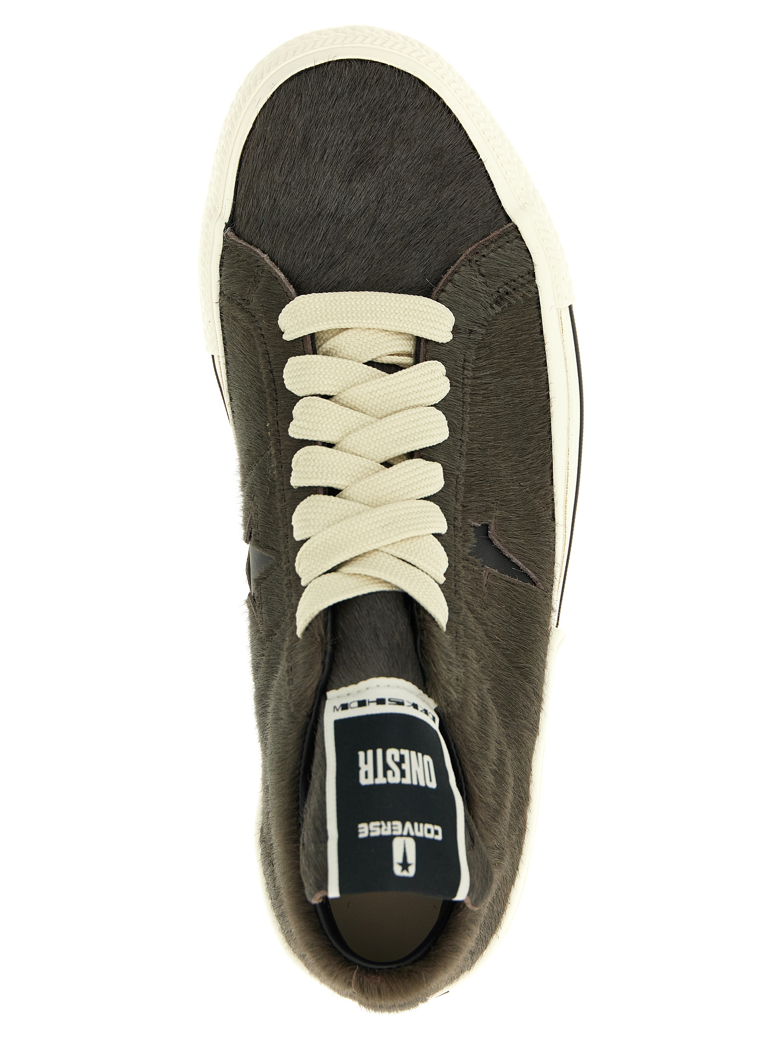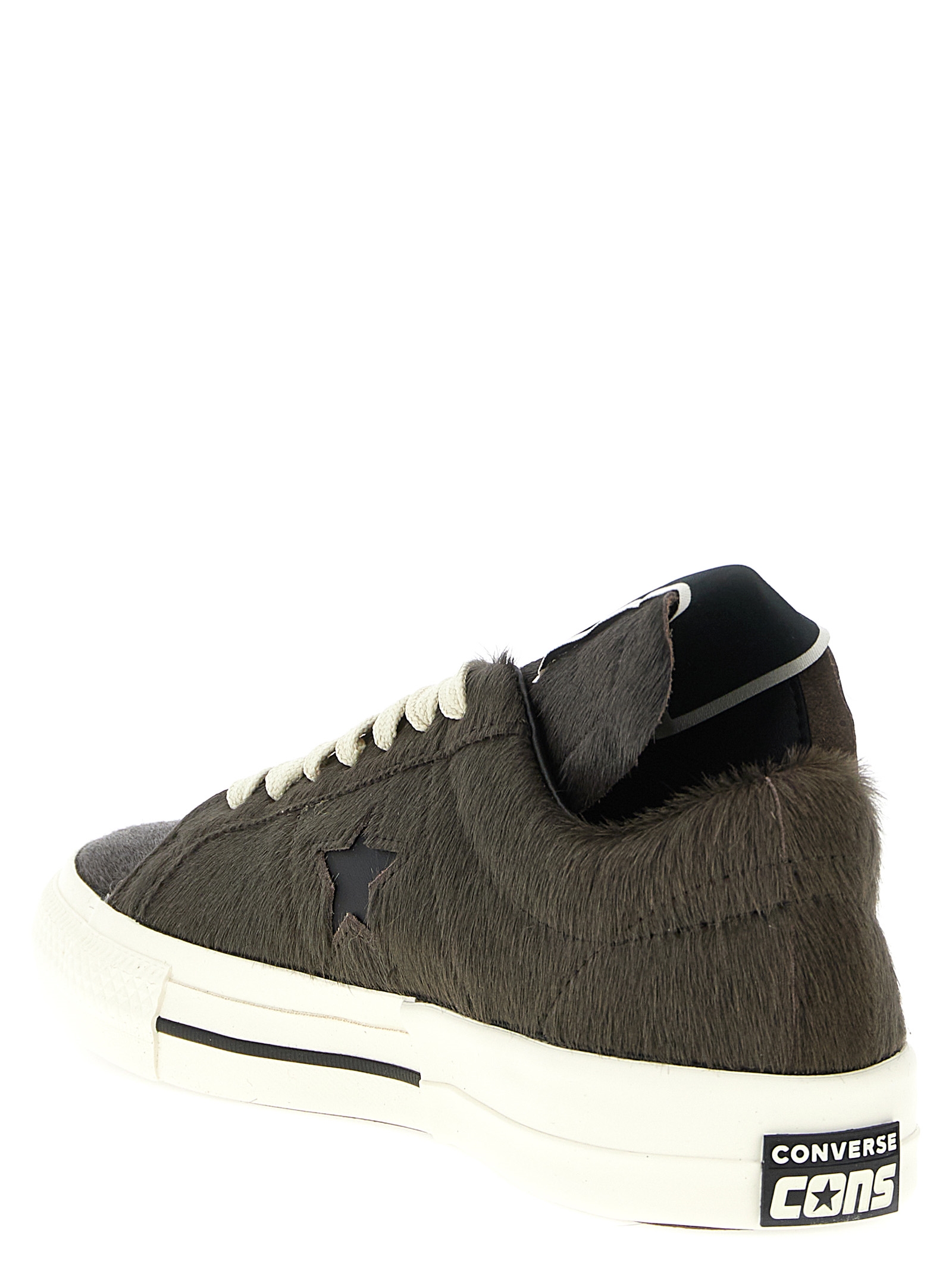 DRKSHDW x Converse ‘Onestr’ sneakers in pony and smooth leather with side cut-out logo details, maxi tongue with applied logo patch, laces, rubber sole.