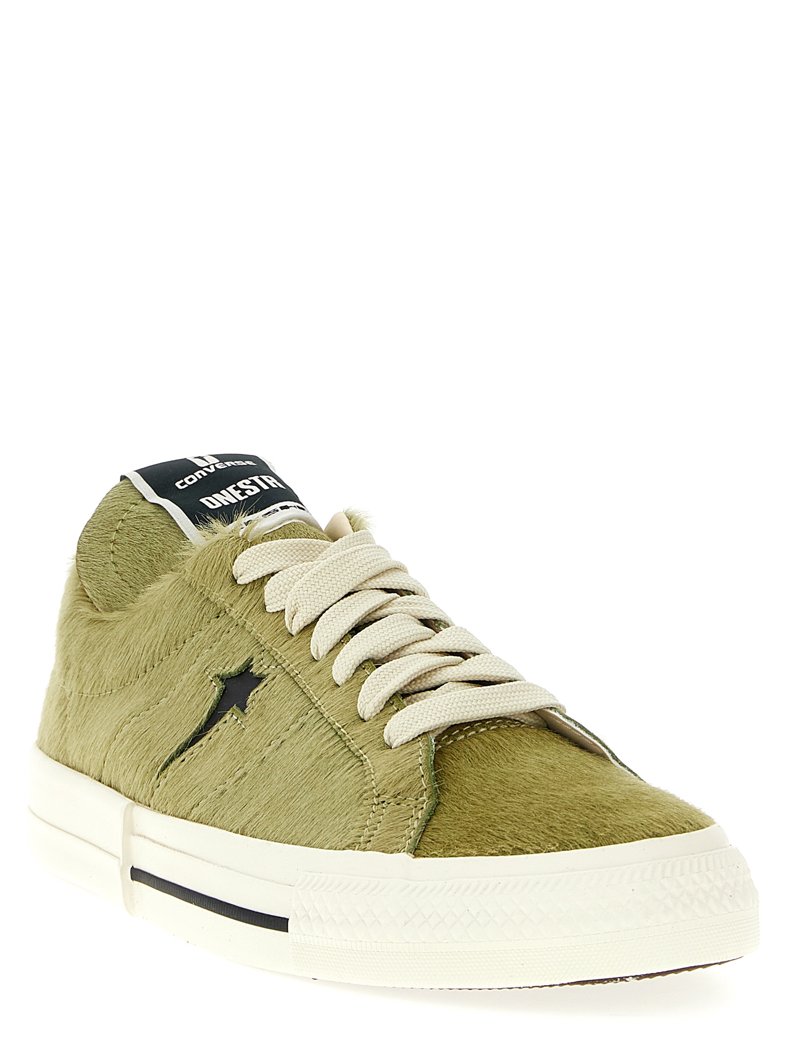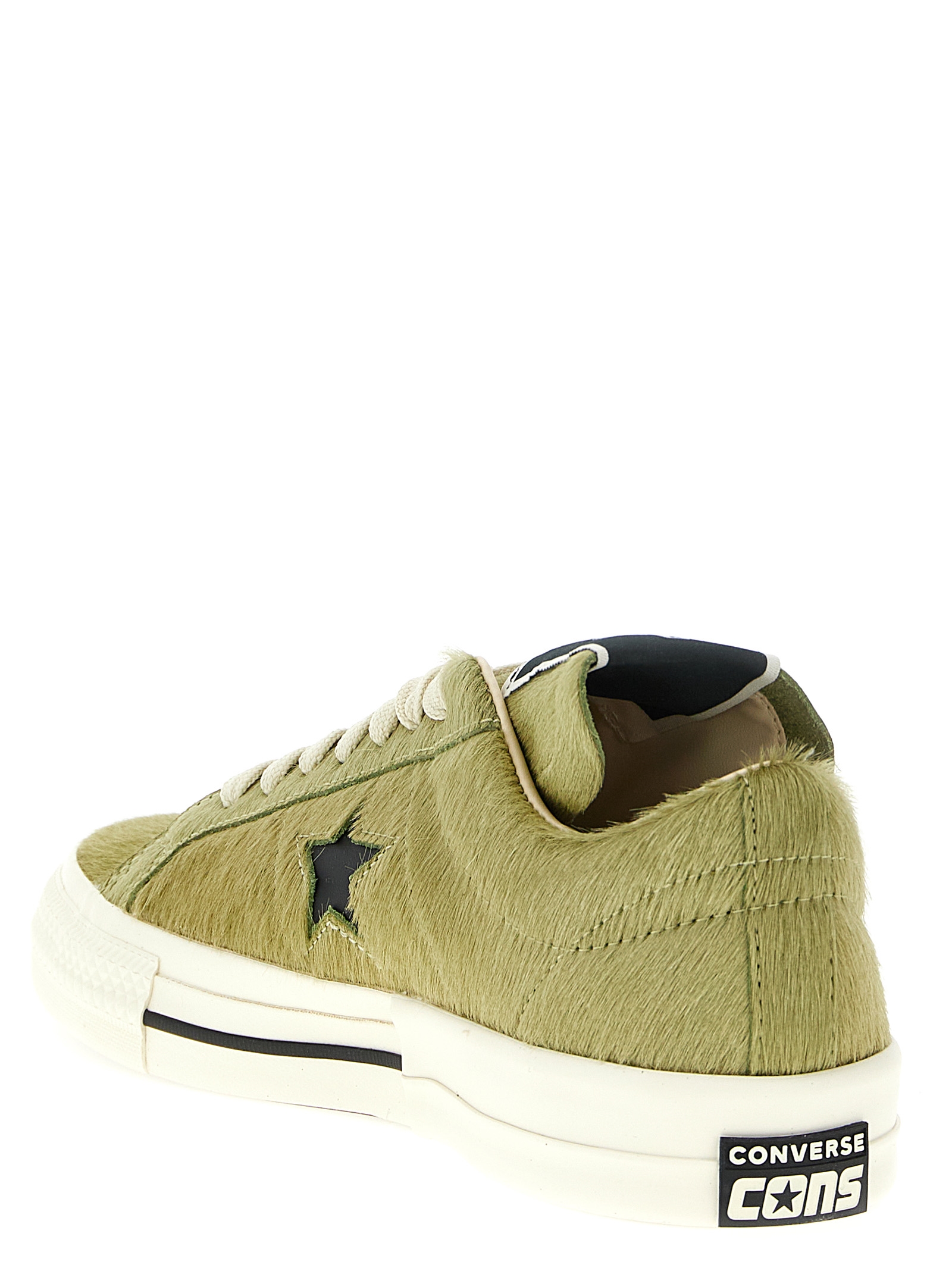 DRKSHDW x Converse ‘Onestr’ sneakers in pony and smooth leather with side cut-out logo details, maxi tongue with applied logo patch, laces, rubber sole.