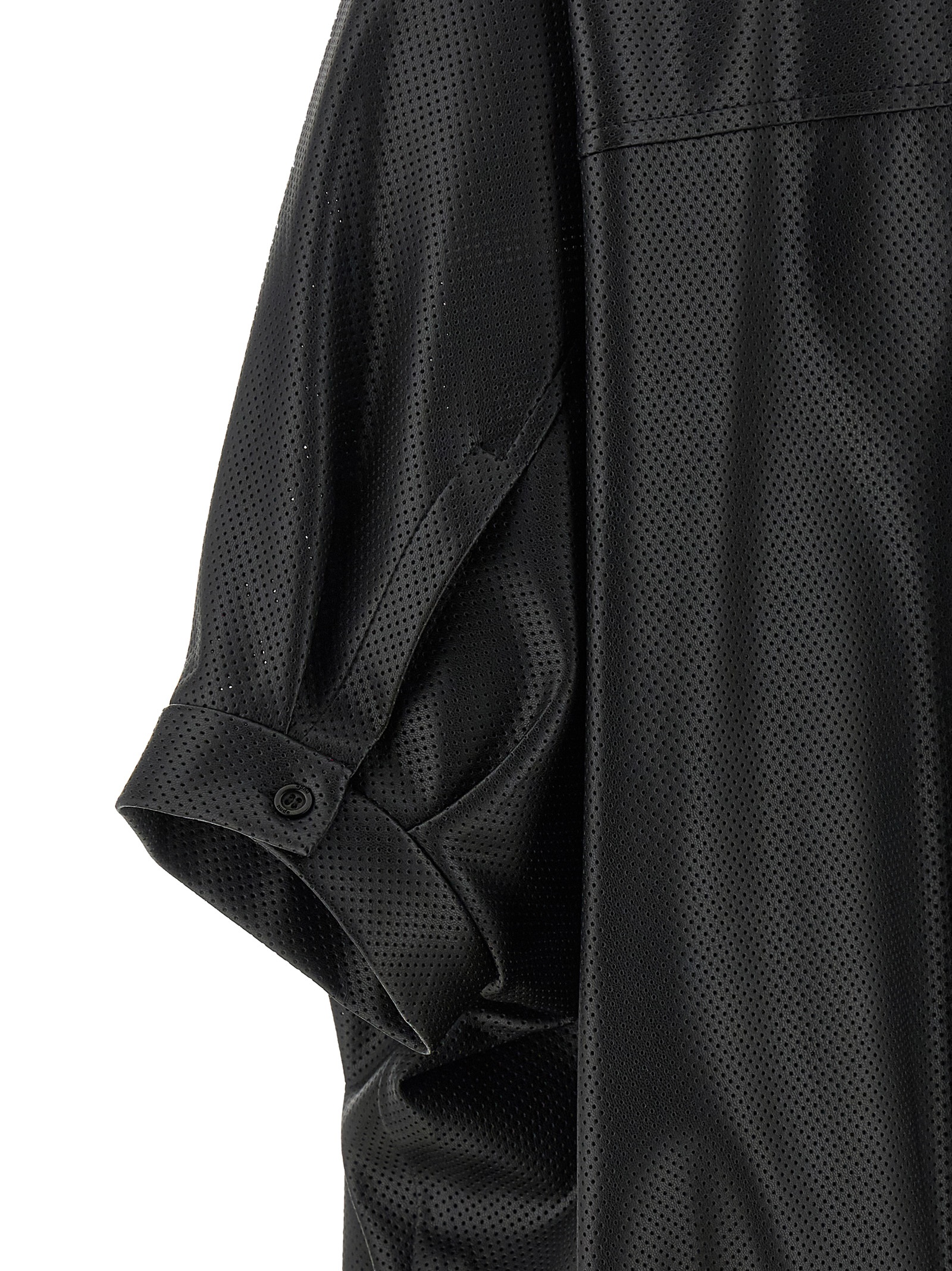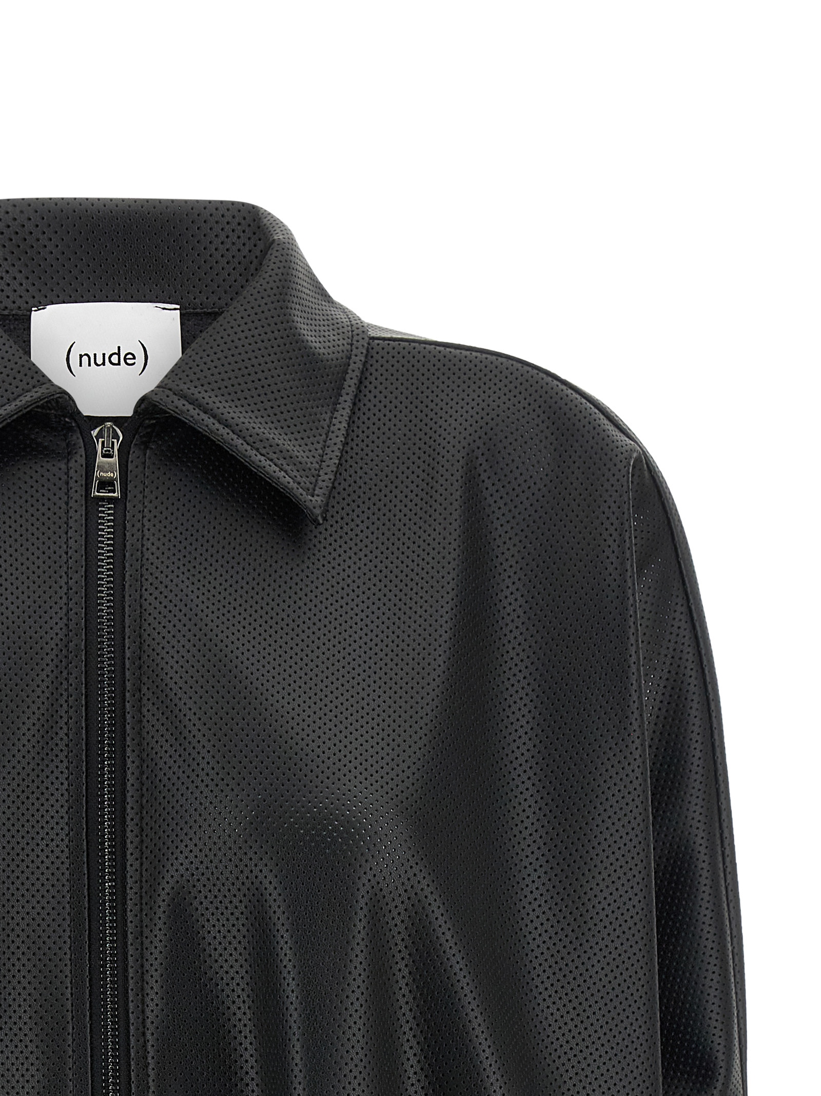 Openwork leather-effect fabric jacket with shirt collar, front zip closure, short bat sleeves with cuffs, elastic hem.