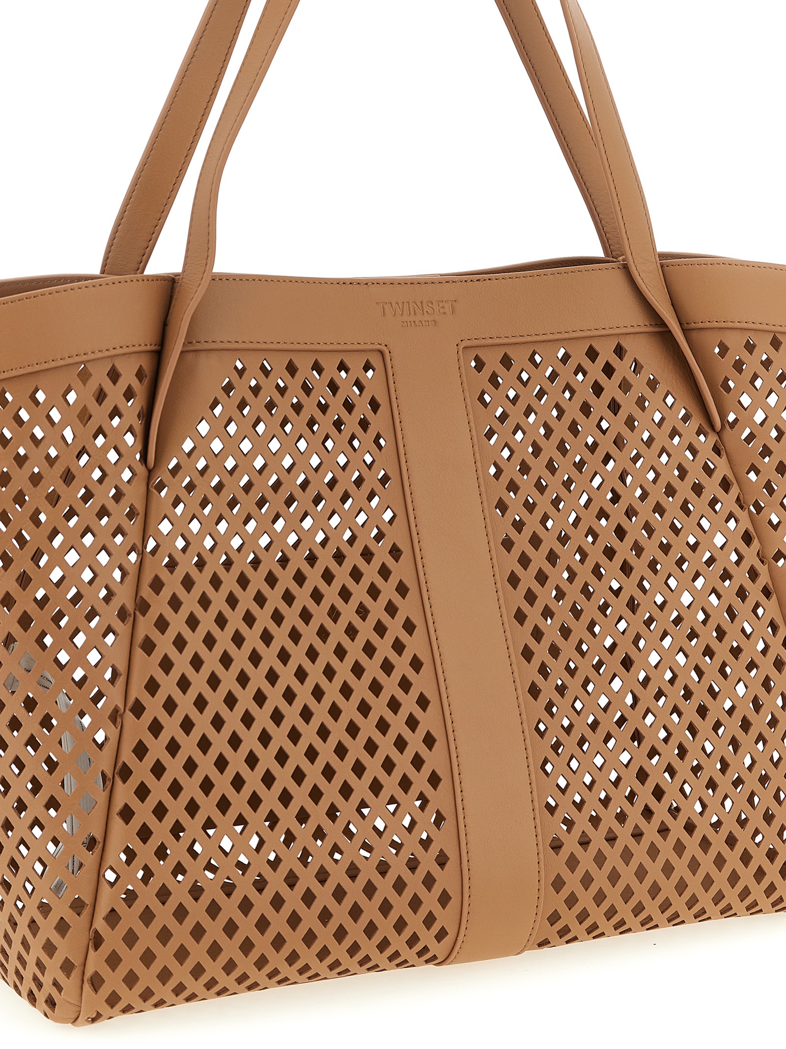 Openwork leather shopping bag with front embossed logo, double fixed handle, and internal magnetic closure.