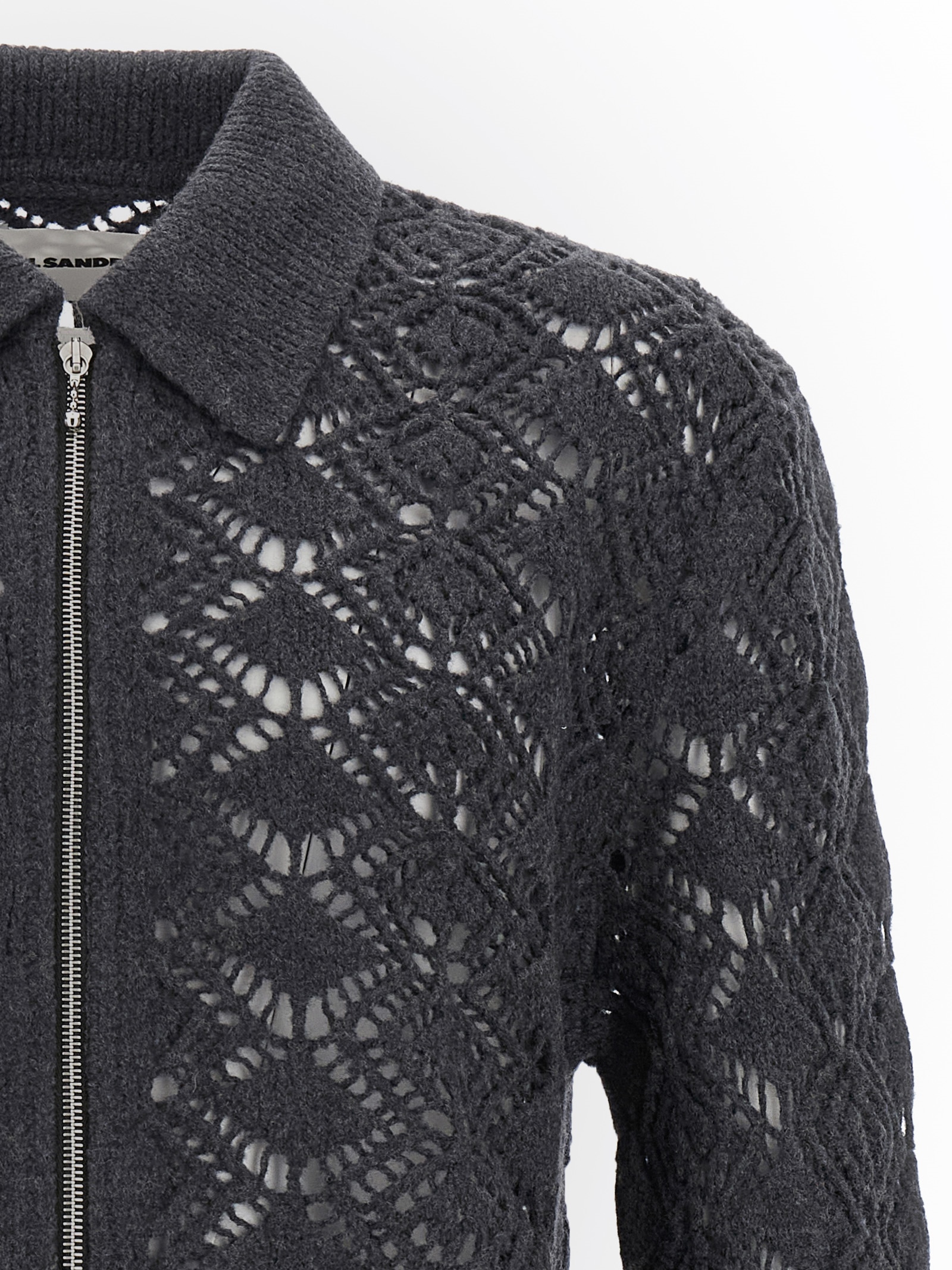 Cardigan in virgin wool perforated effect I do not see, shirt collar, front zip closure, long sleeves with cuffs and dropped shoulder.