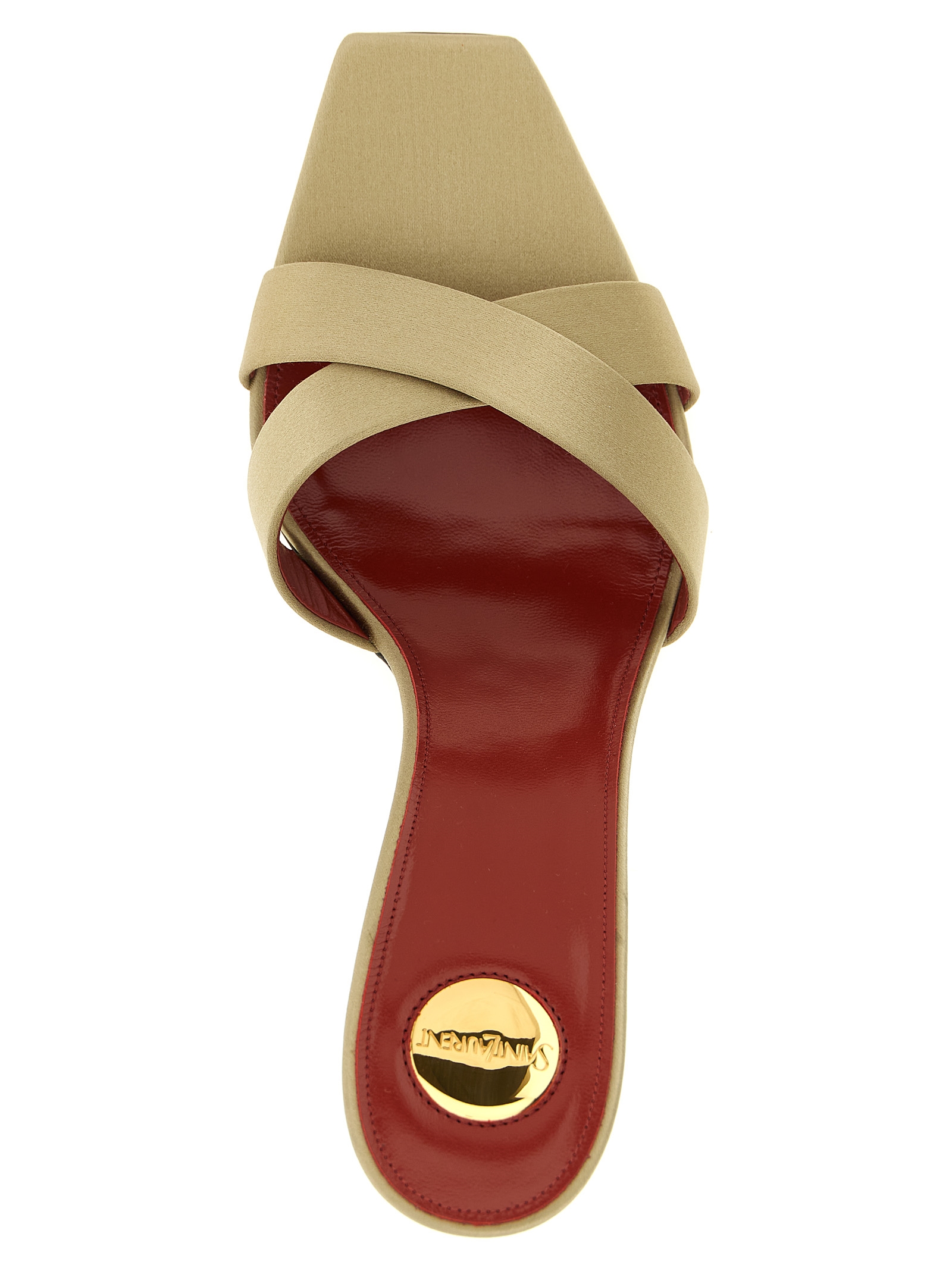 ‘Opyum’ mules in satin crêpe with square toe, crossed straps, sculptural ‘Cassandre’ heel, leather sole.