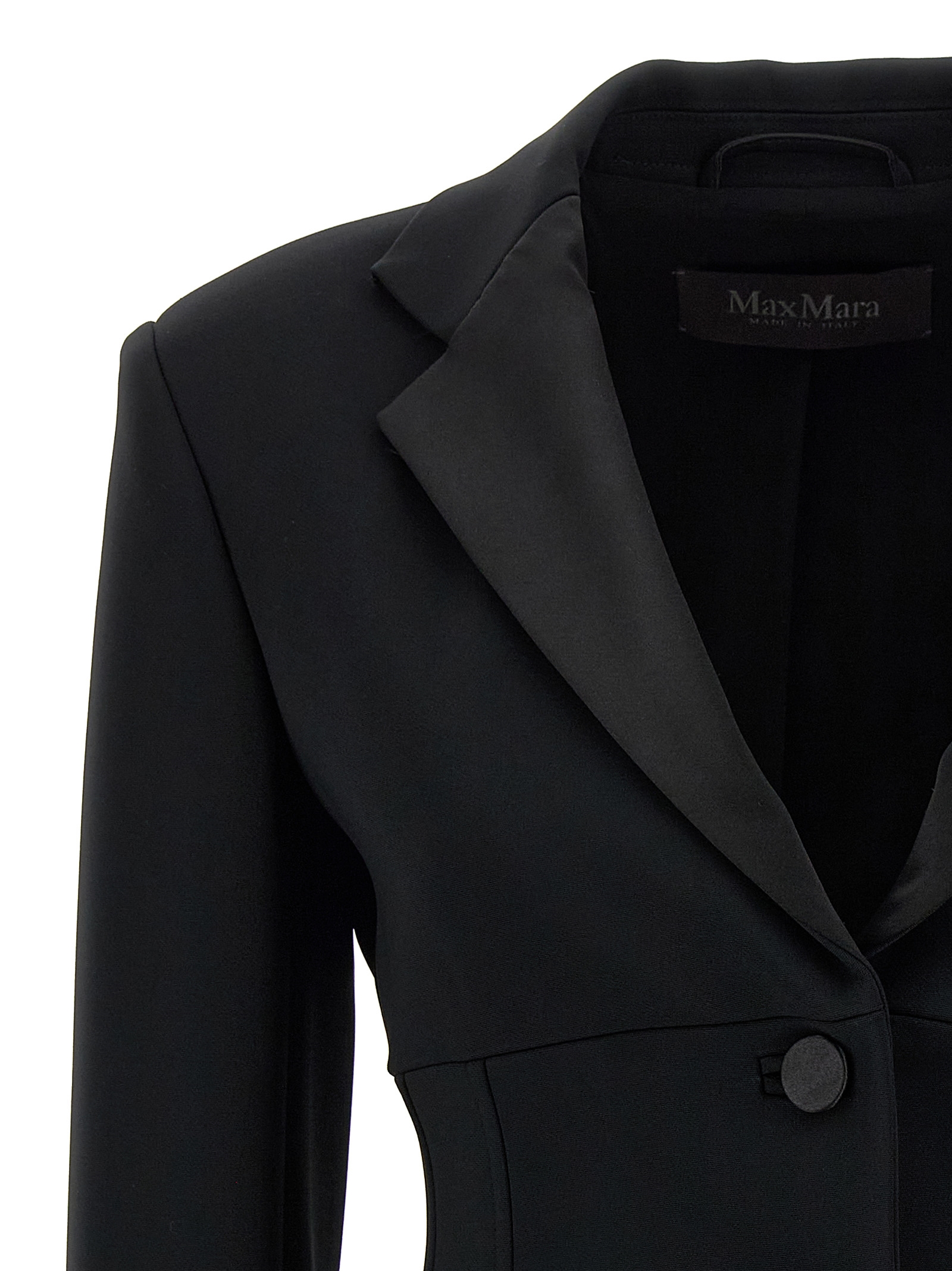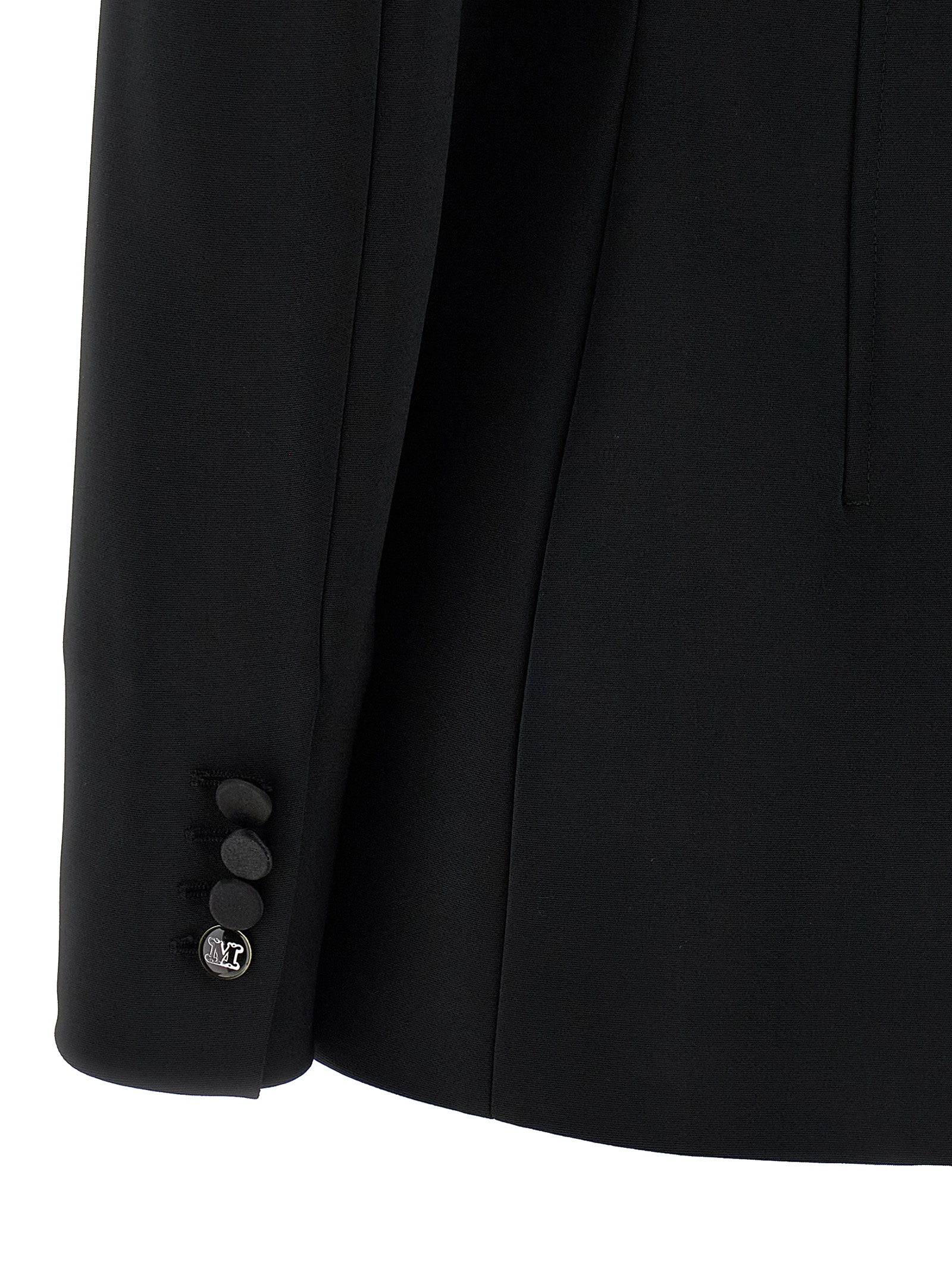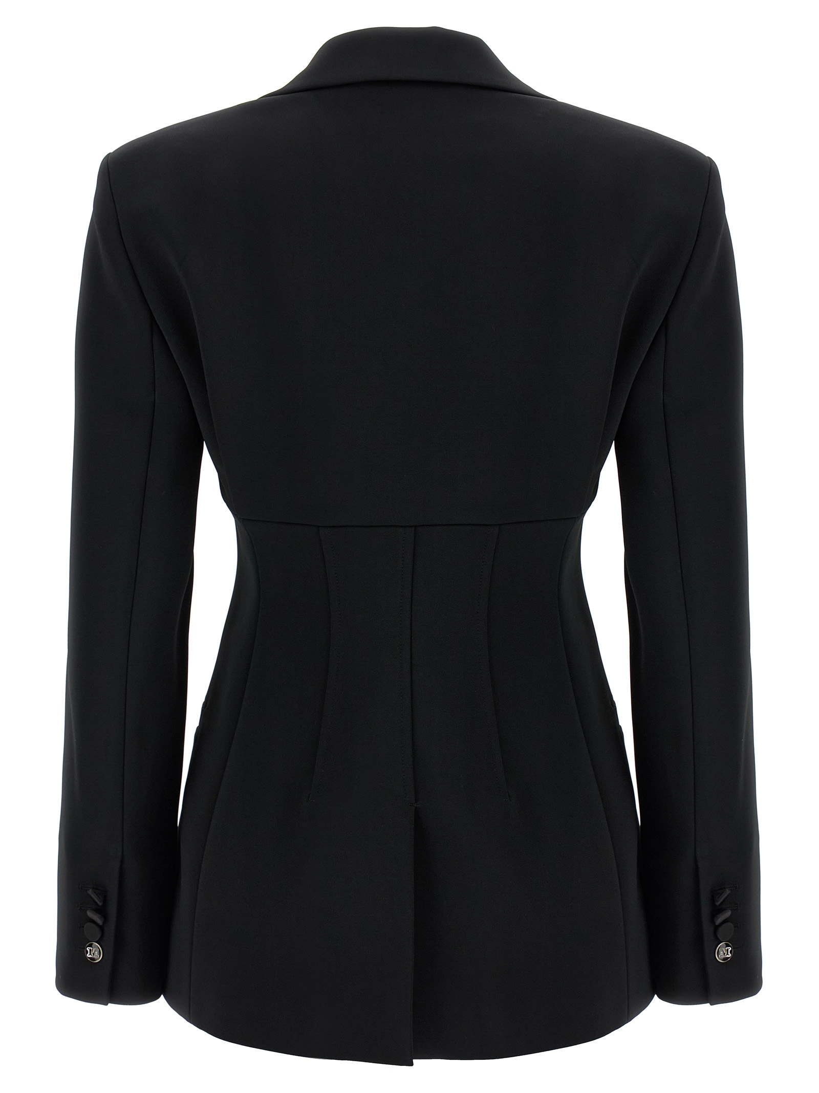 ‘Oreste’ stretch viscose blazer with tone-on-tone satin details, single-breasted model with front button closure, hourglass silhouette with front and back pincer, mirror lapels, patch pockets, structured shoulder strap, long sleeves, back split, lining.