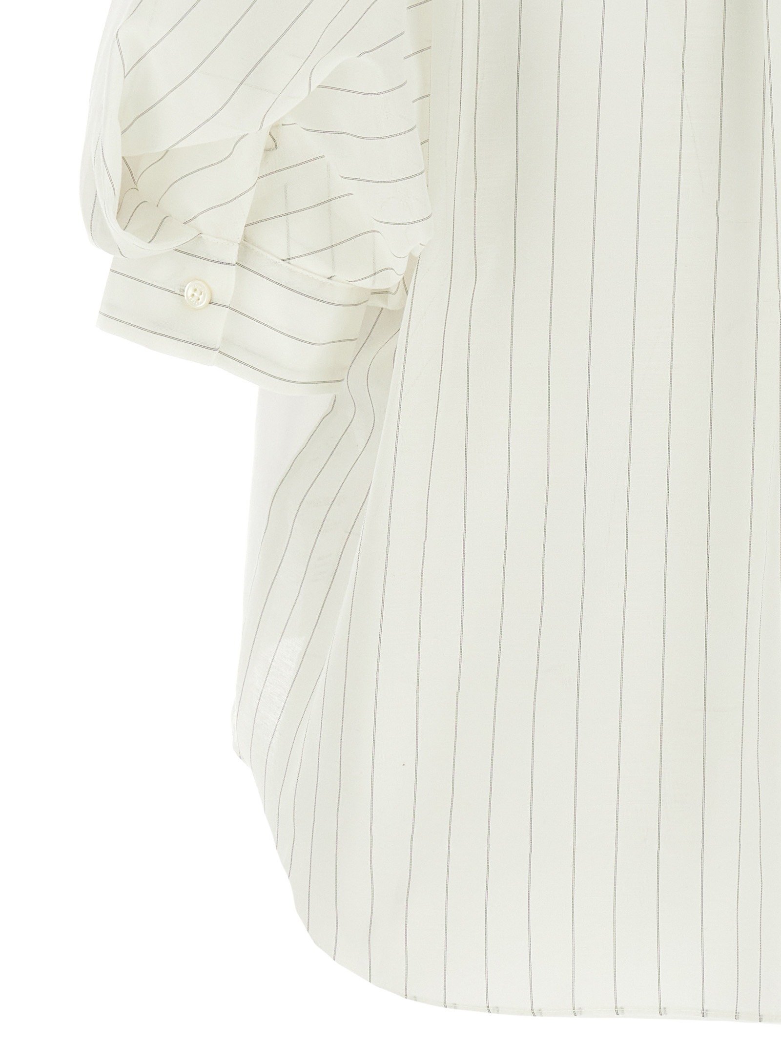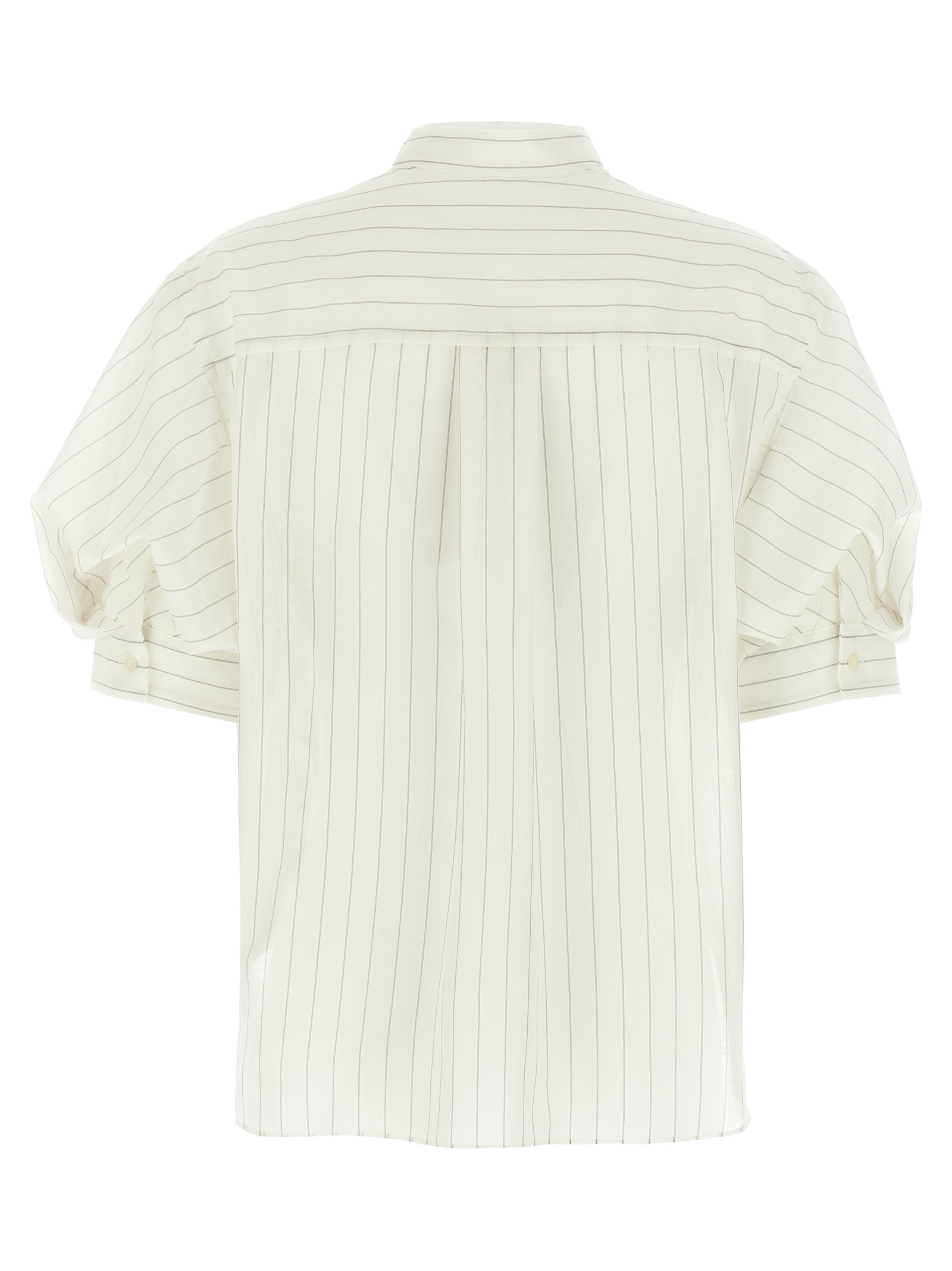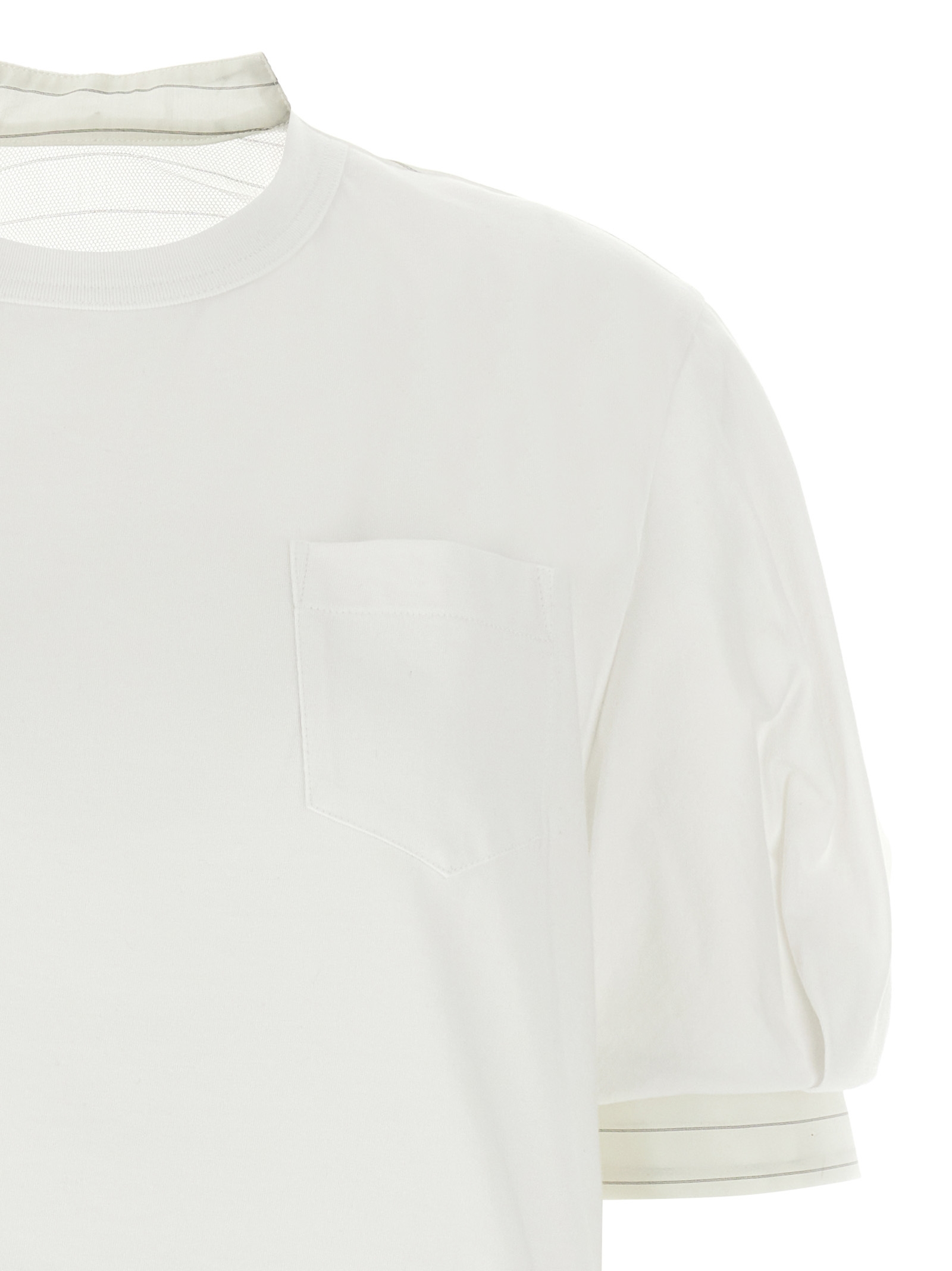 Solid color cotton jersey t-shirt with asymmetric pinstripe organza back panel, crew neck, chest pocket, balloon sleeves with