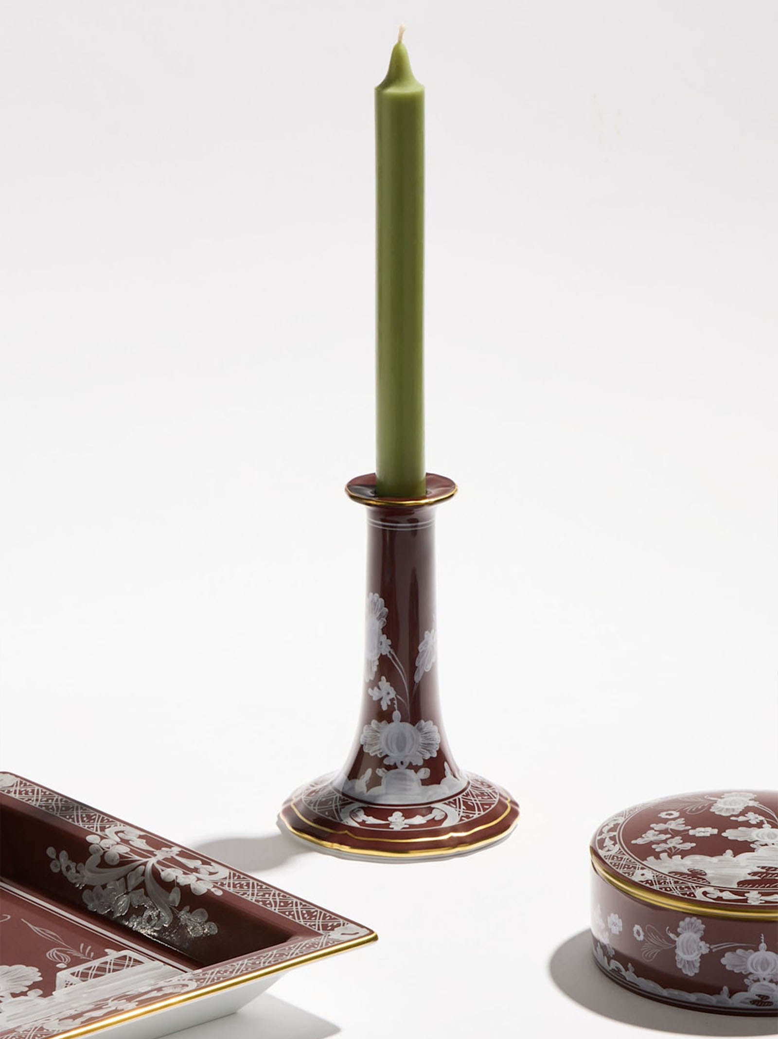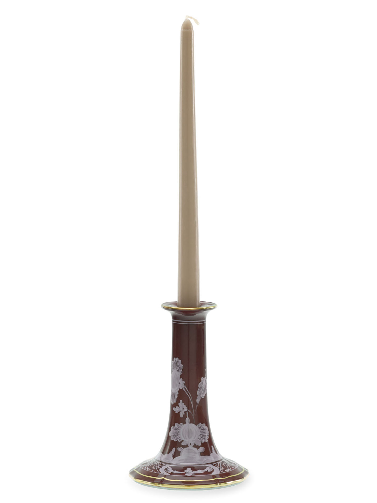 Design candle holder with chestnut brown decoration and gold thread. ‘Oriente Italiano’ collection.