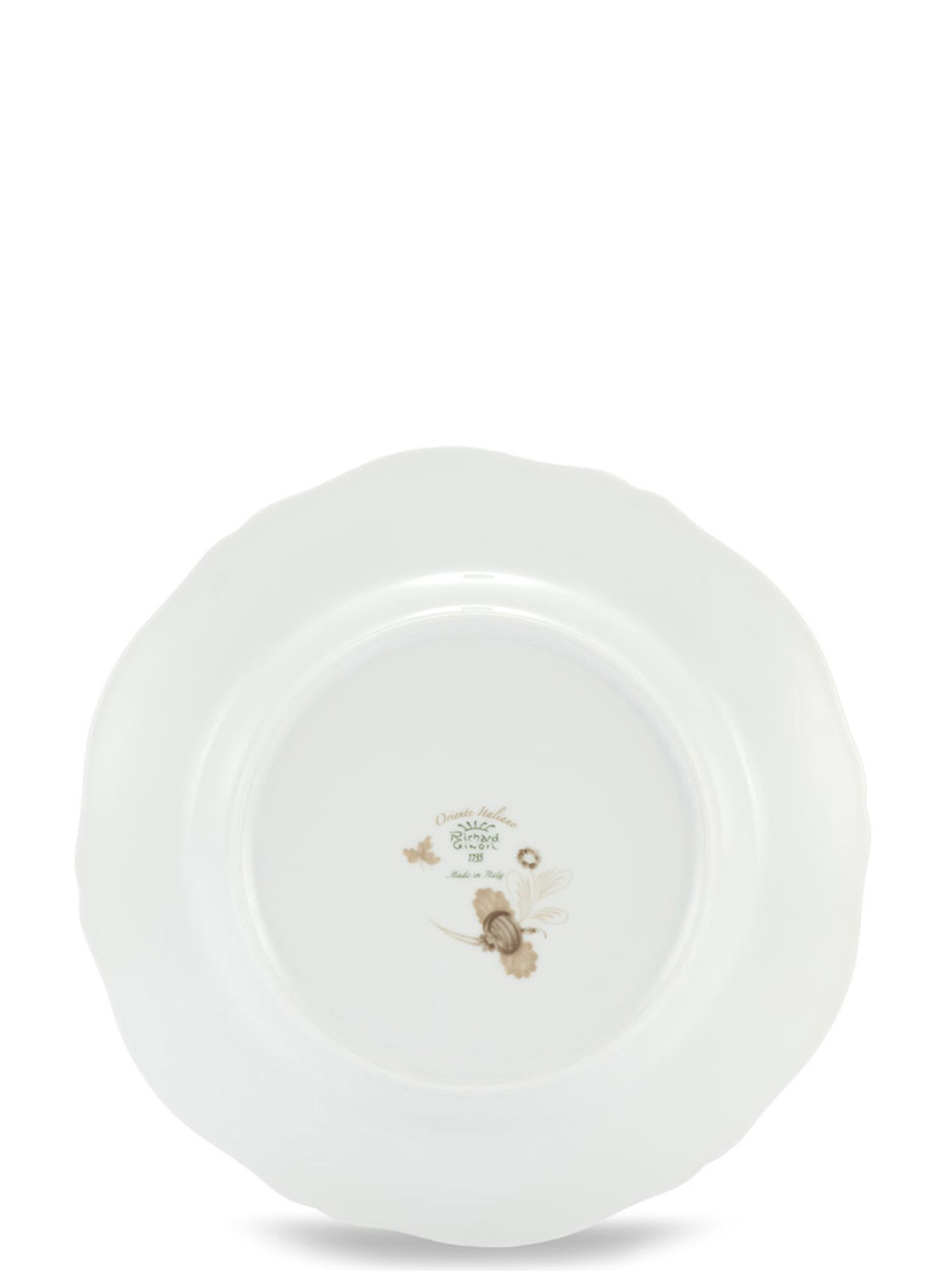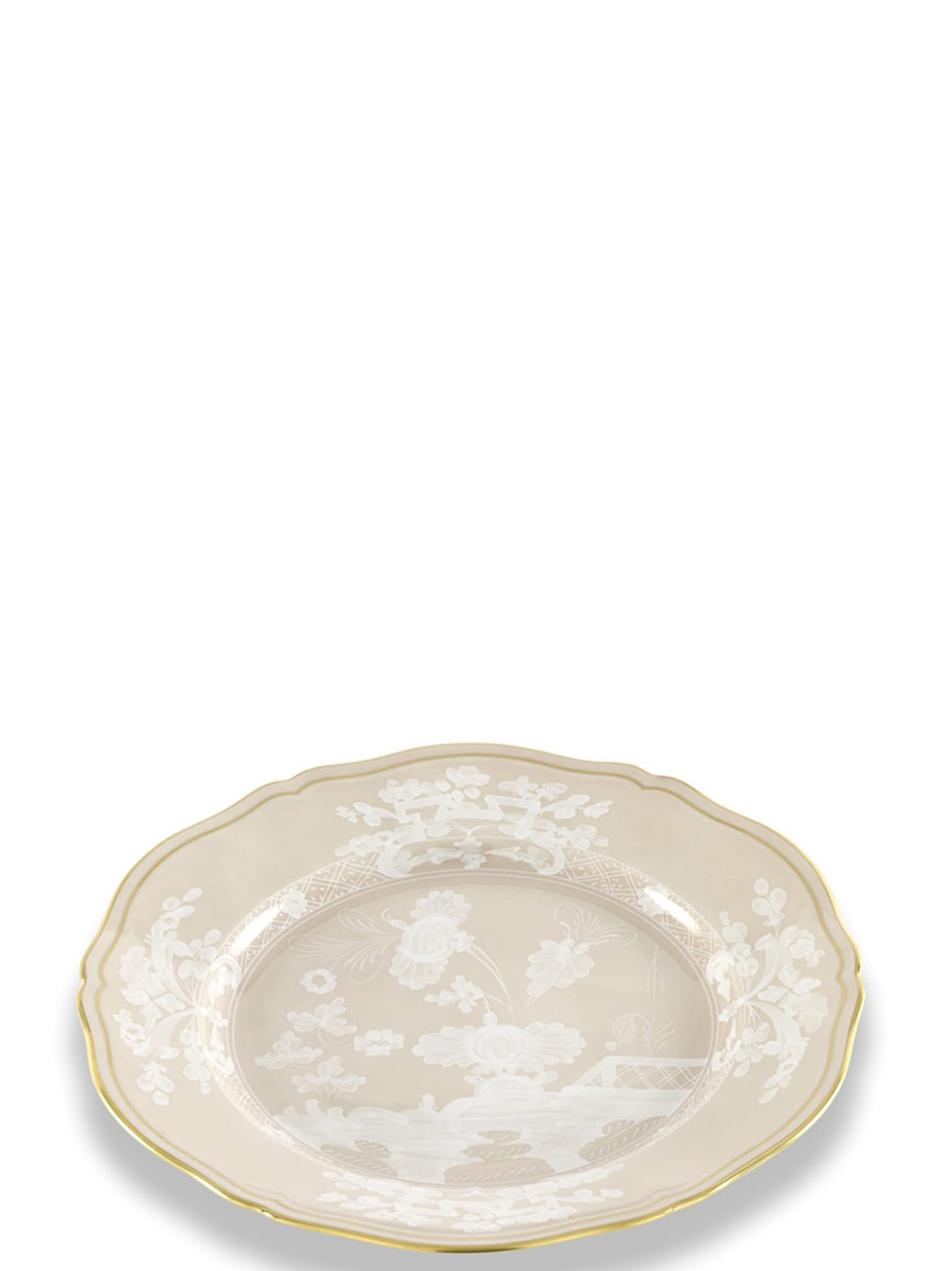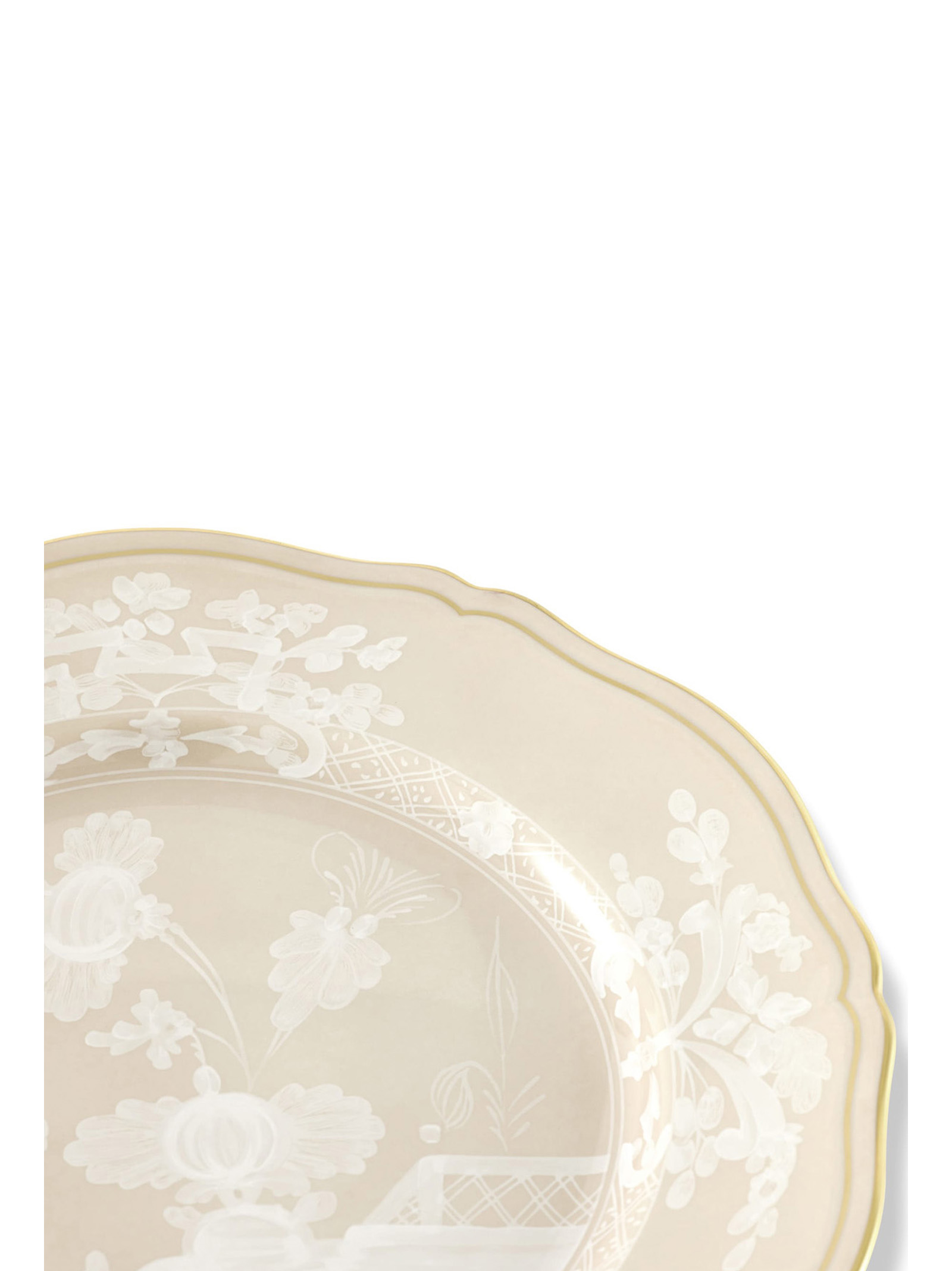 Porcelain dinner plate with meringue decoration and gold thread. ‘Oriente Italiano’ collection.
