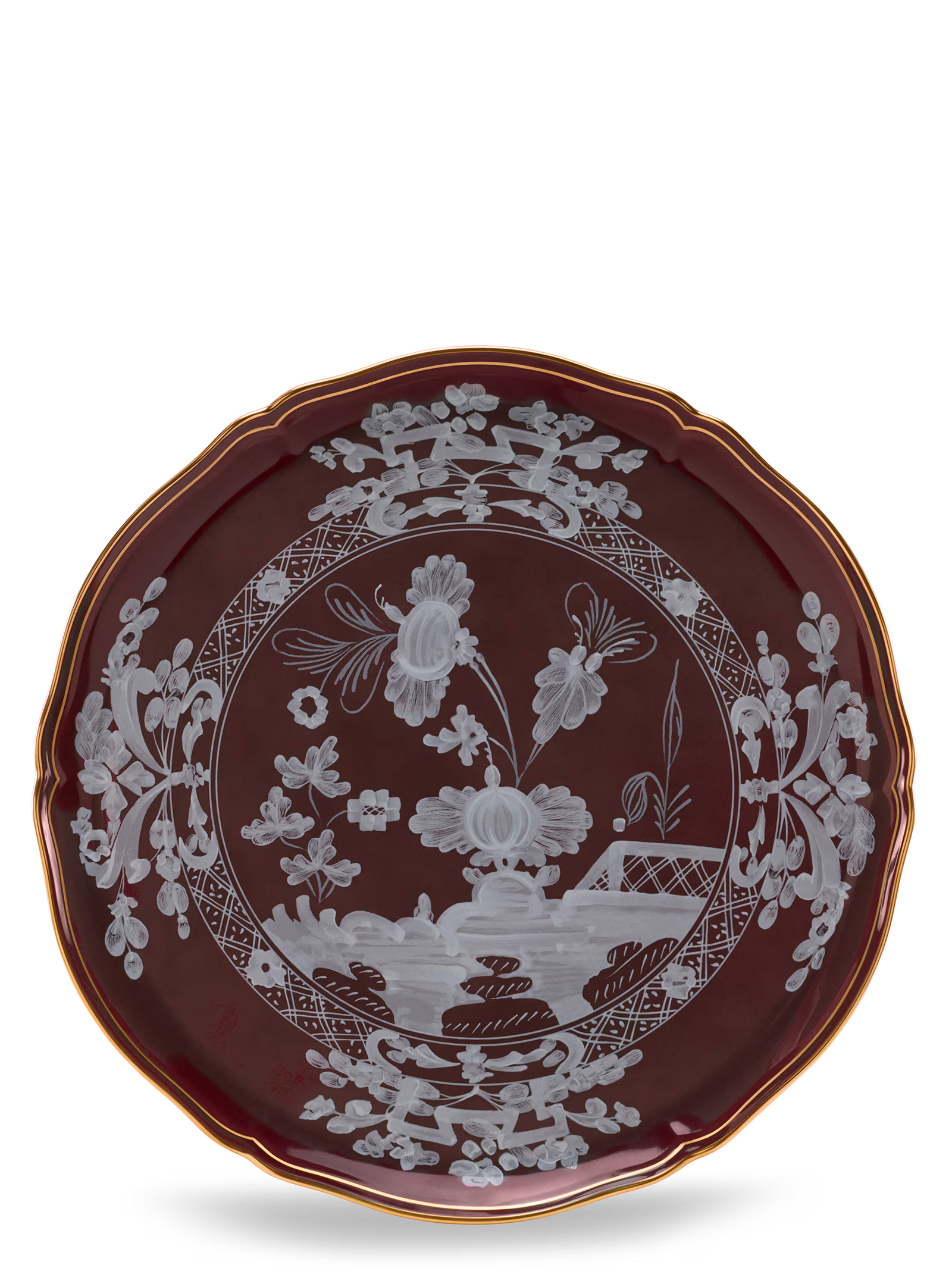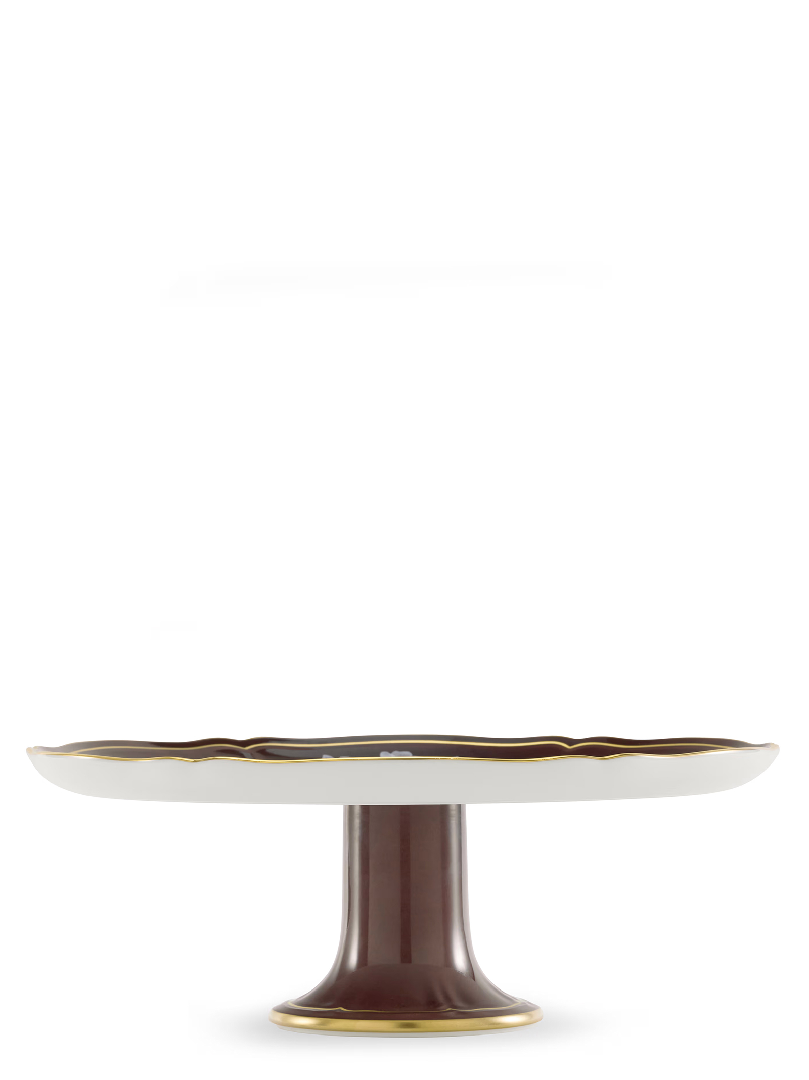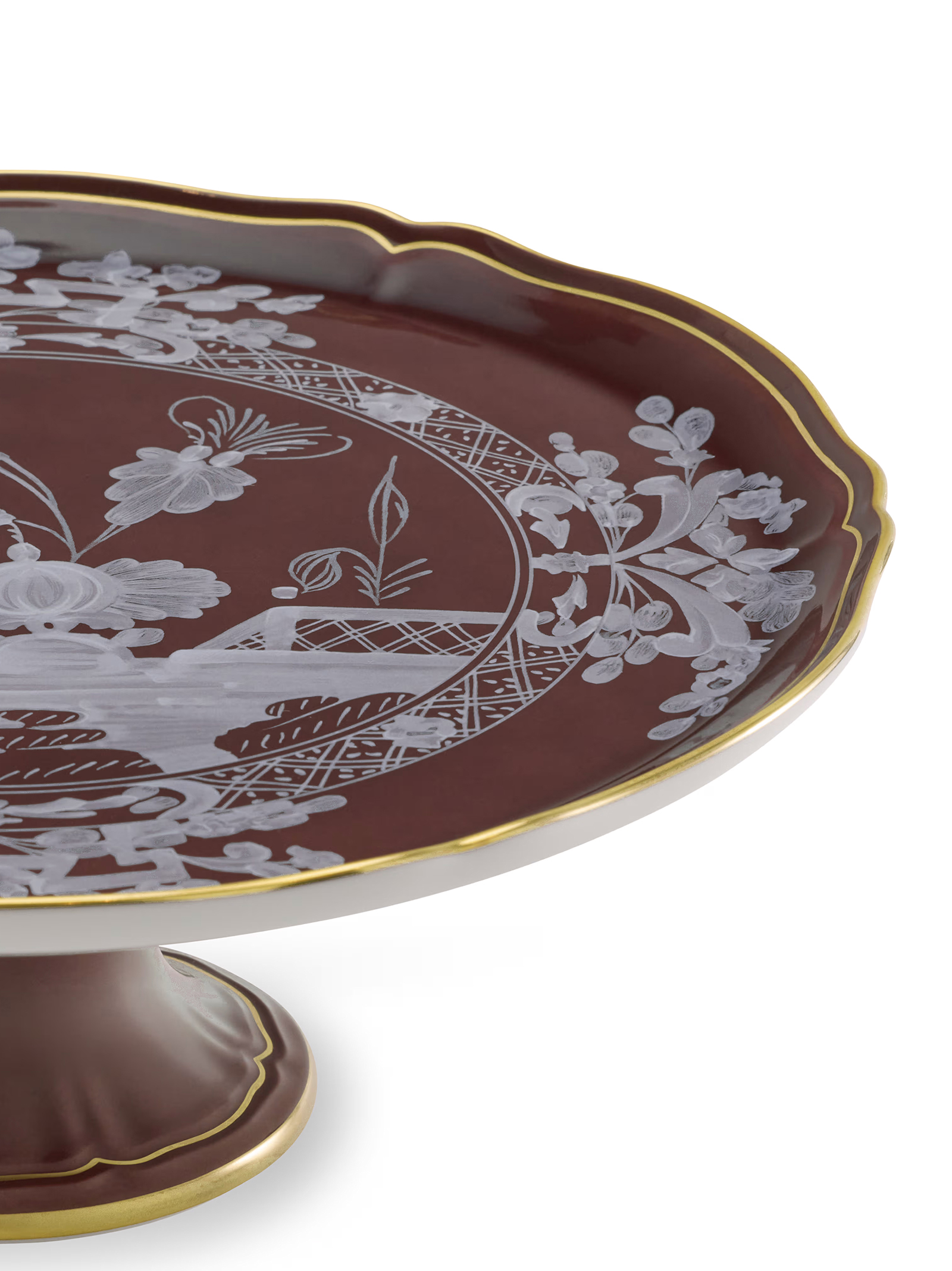 Cake stand with brown decoration Chestnut and gold thread. ‘Oriente Italiano’ collection, ‘Antico Doccia’ shape with iconic ‘a garofano’ pattern.