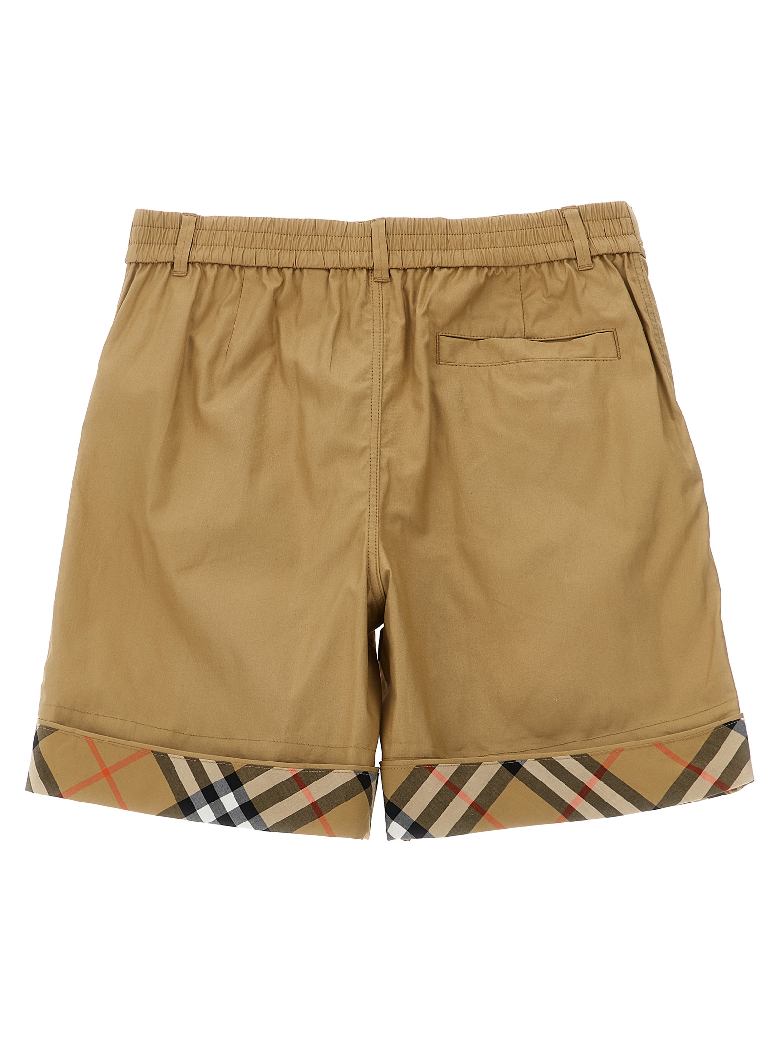 ‘Oscar’ cotton twill bermuda shorts with front zip and button closure, elastic waistband at the back, pockets, Burberry Check turn-up hem.