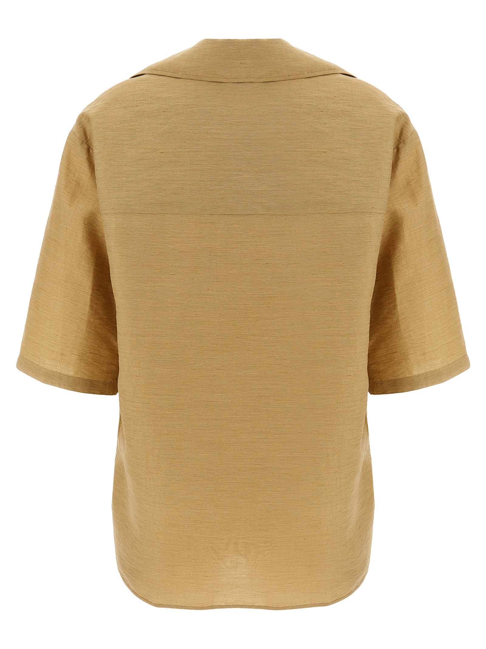 ‘Osiride’ polo shirt with a straight line, collar, V-neck, leather patch pocket with embossed logo, short sleeves with dropped shoulders, asymmetric hem, side slits.