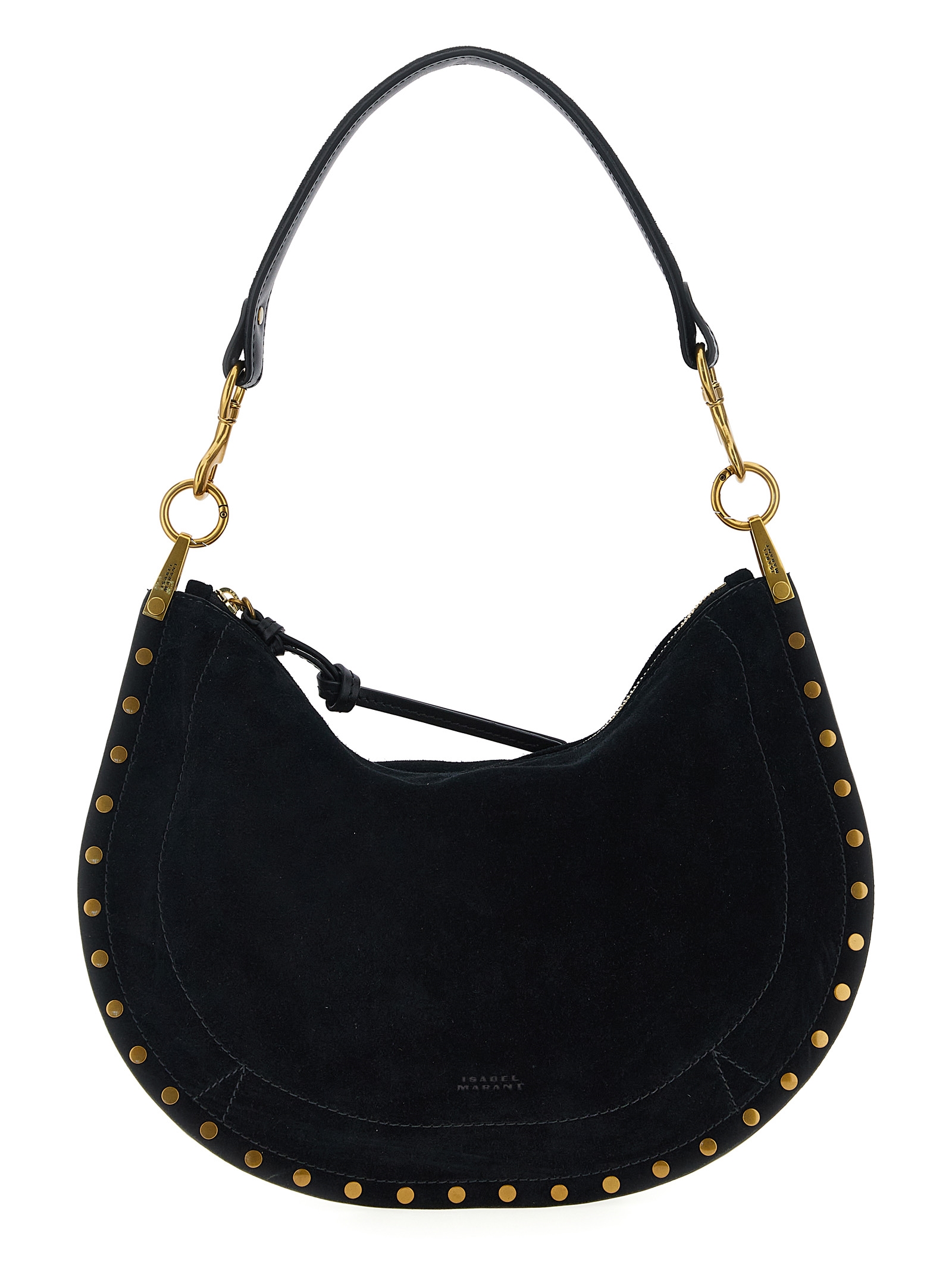 Oskan Soft Zip’ suede handbag with stud appliqué, front embossed logo, top zip closure, removable handle, and adjustable and removable shoulder strap.