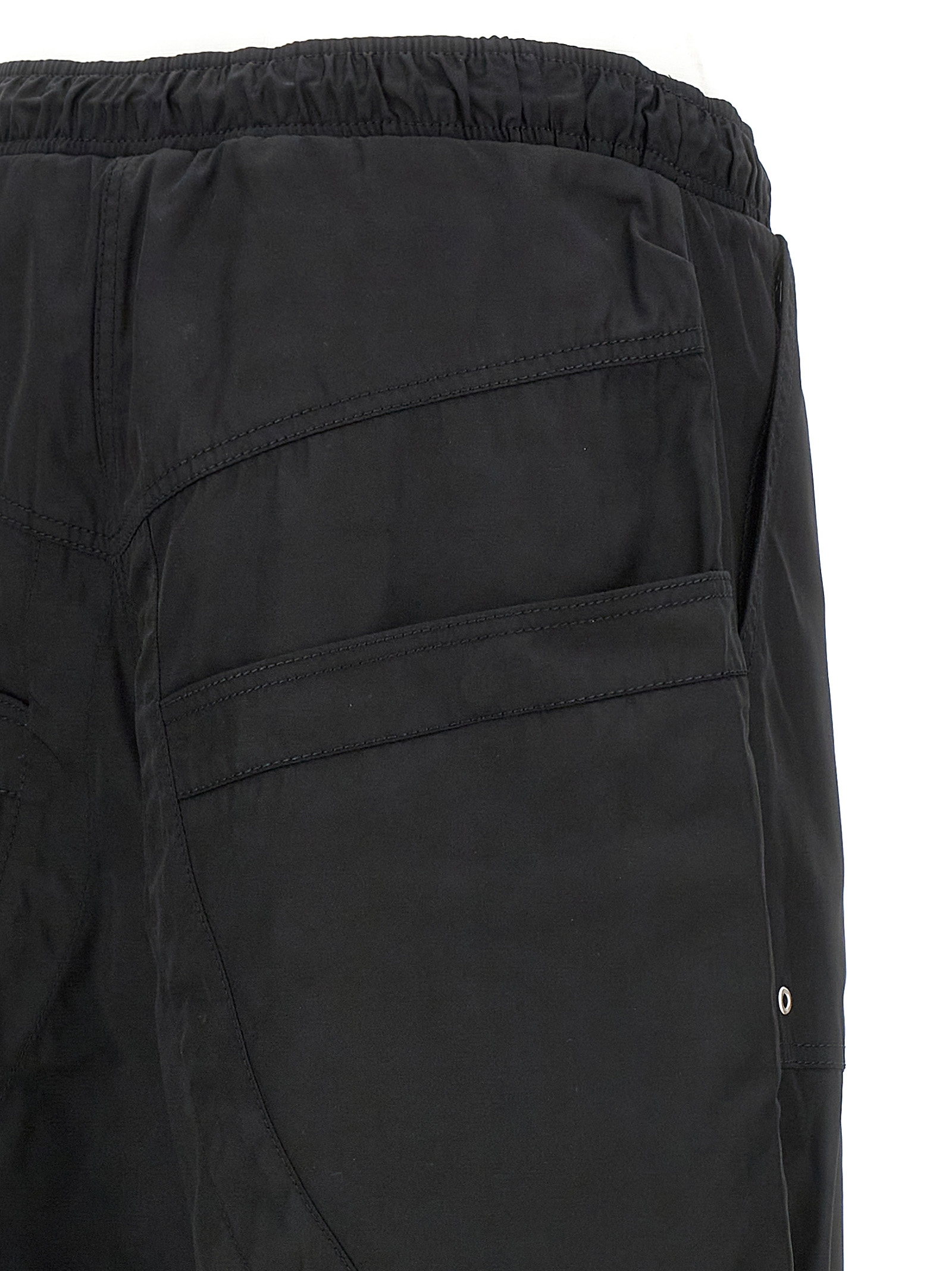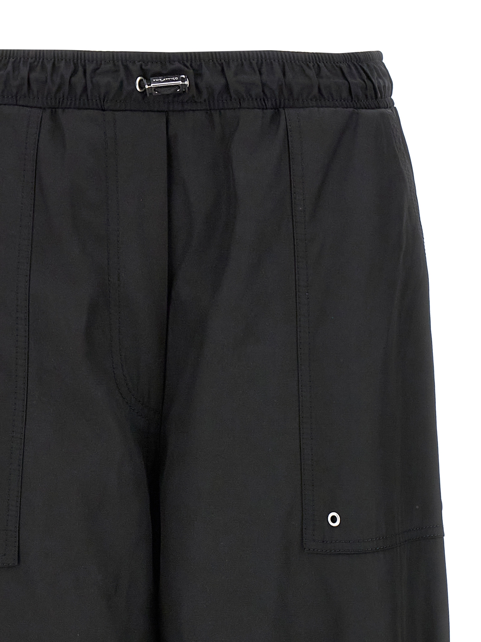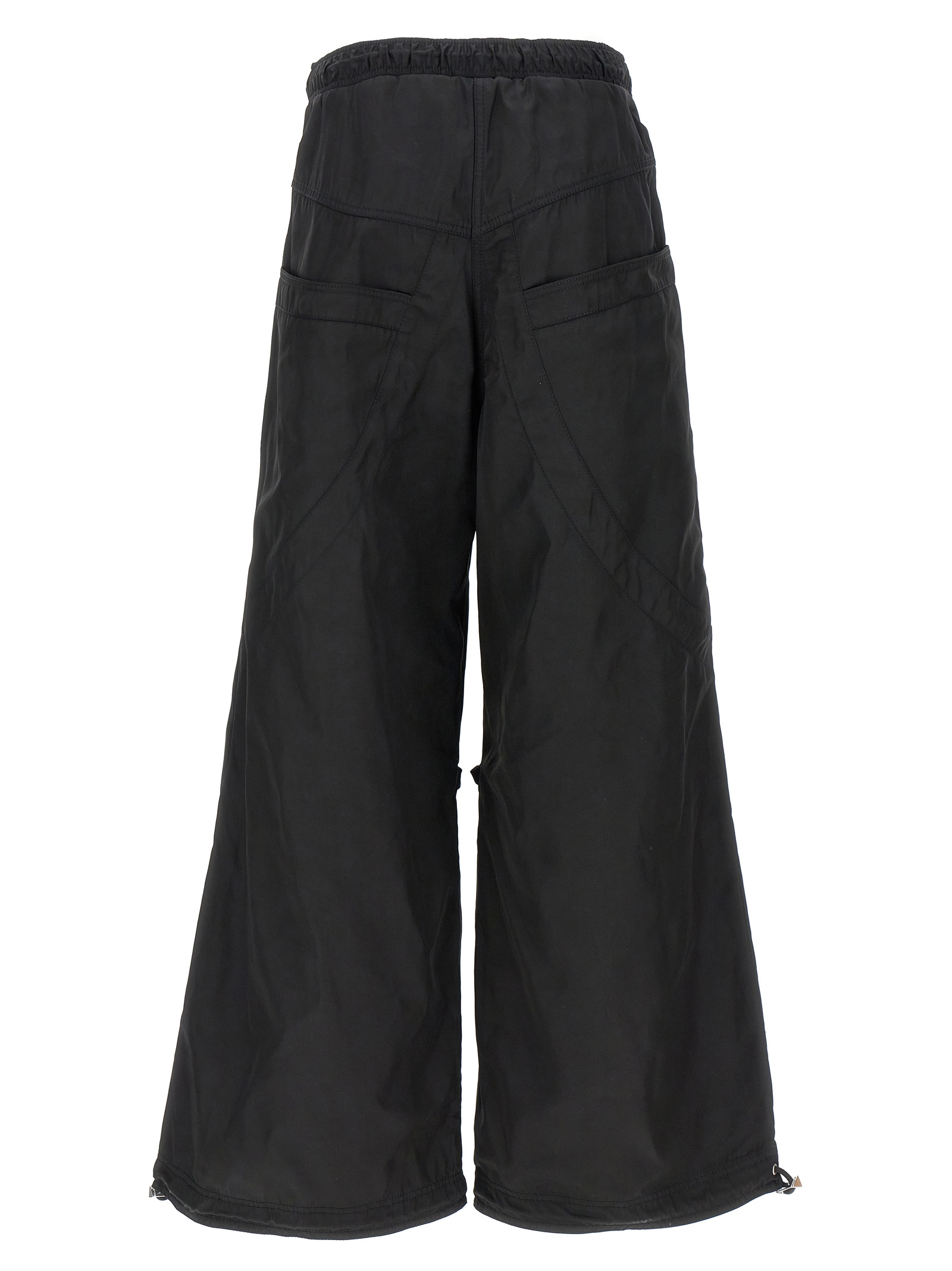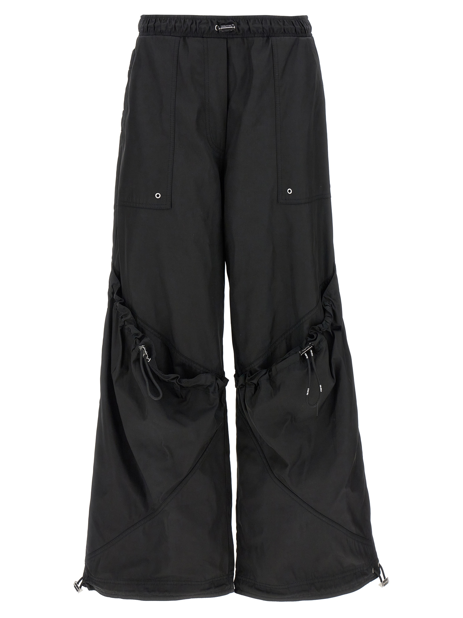 Nylon pants with oversized leg, adjustable drawstring elastic waistband, pockets, drawstring pockets, drawstring at the hem.