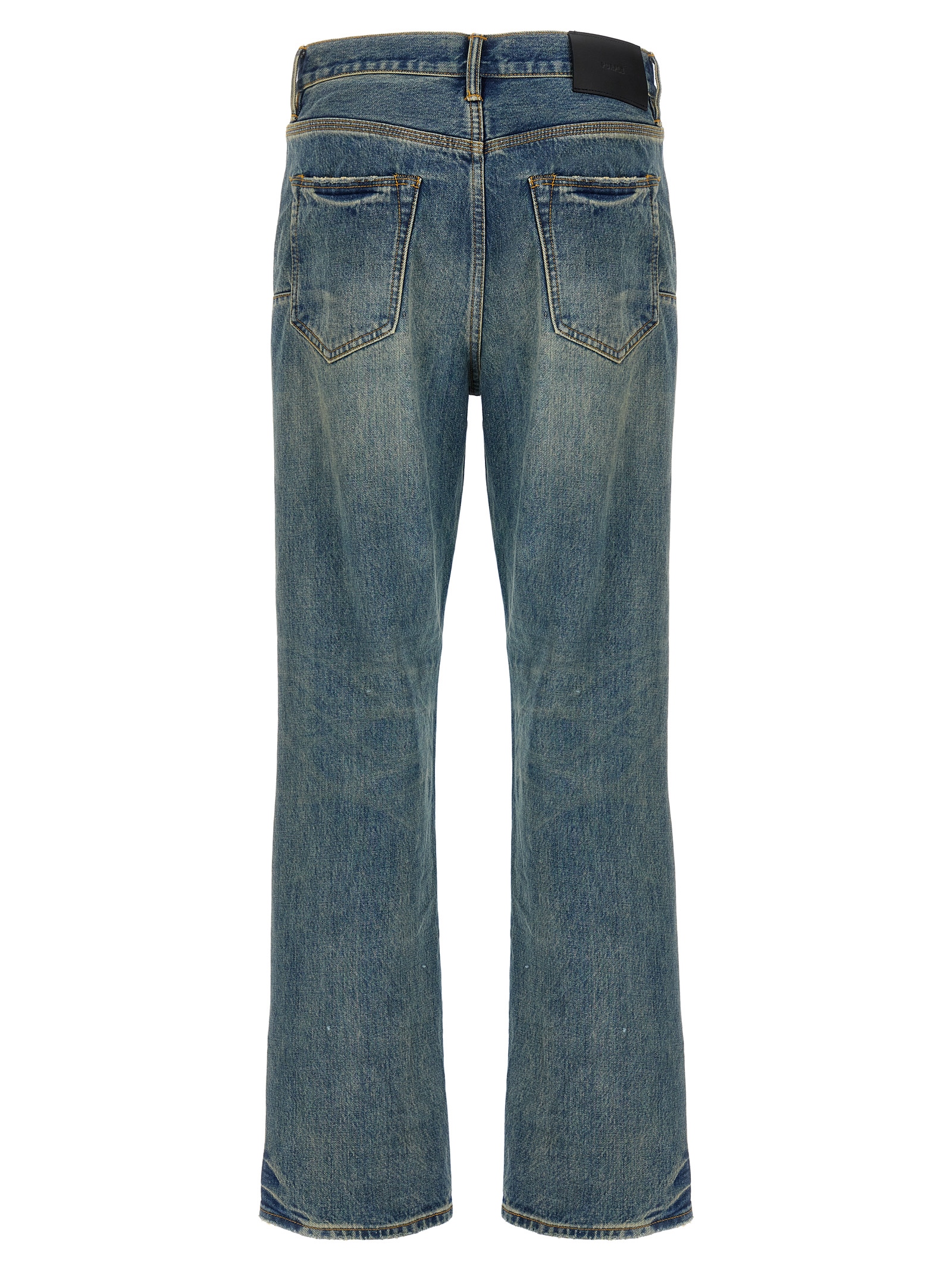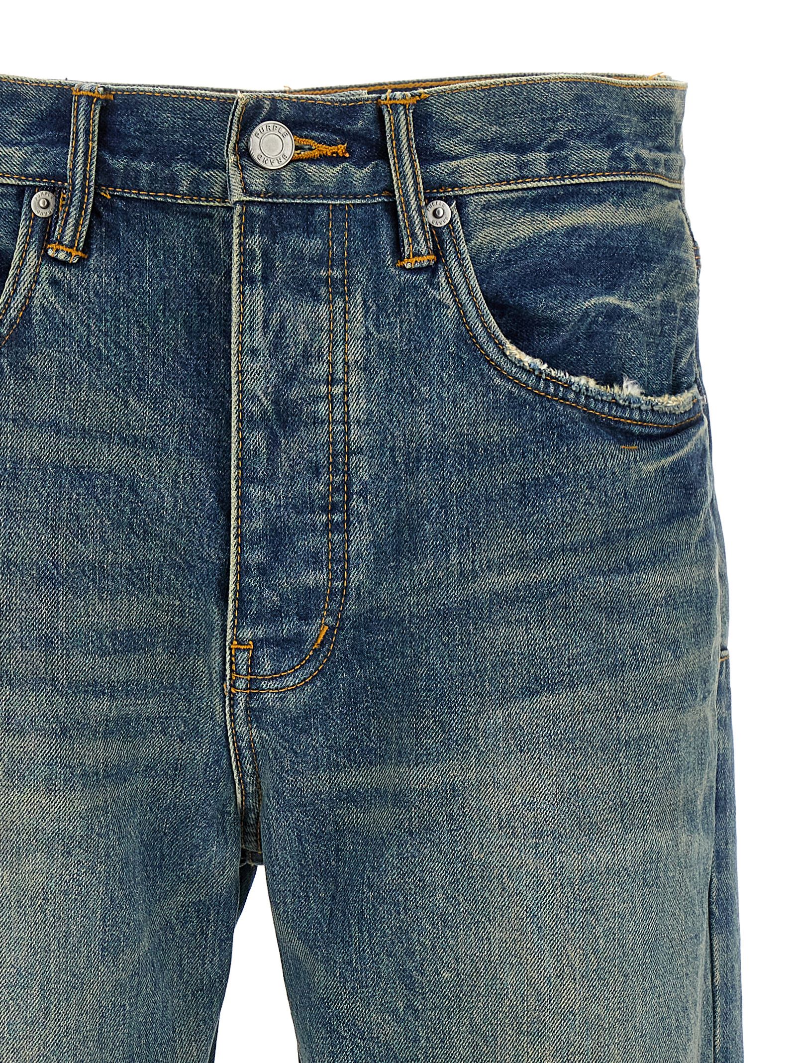 ‘P011 Hadley Vintage’ jeans in delavé cotton denim with rips, mid-waist model with straight leg, button closure, five pockets, leather logo label at the back.