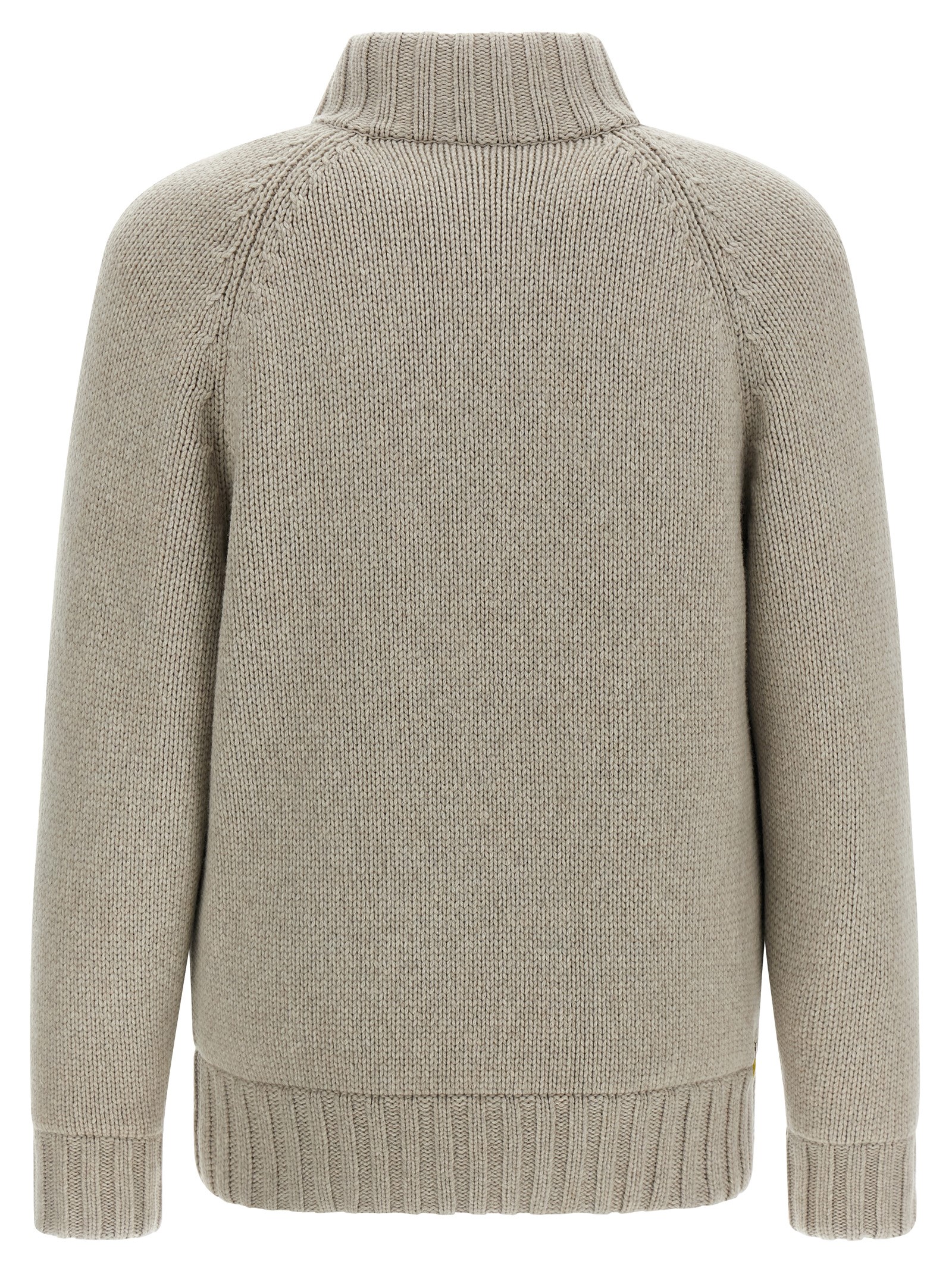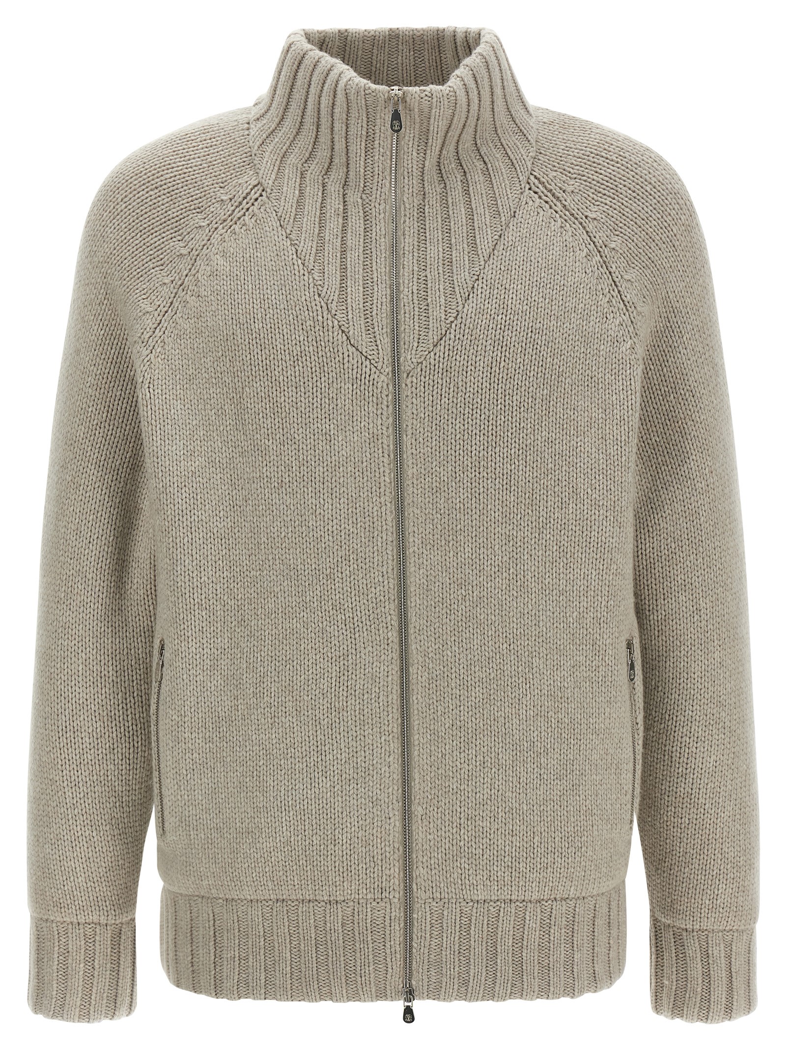 Cashmere knit cardigan, high neck, zip closure, nylon and goose down padding, long cuffed sleeves.