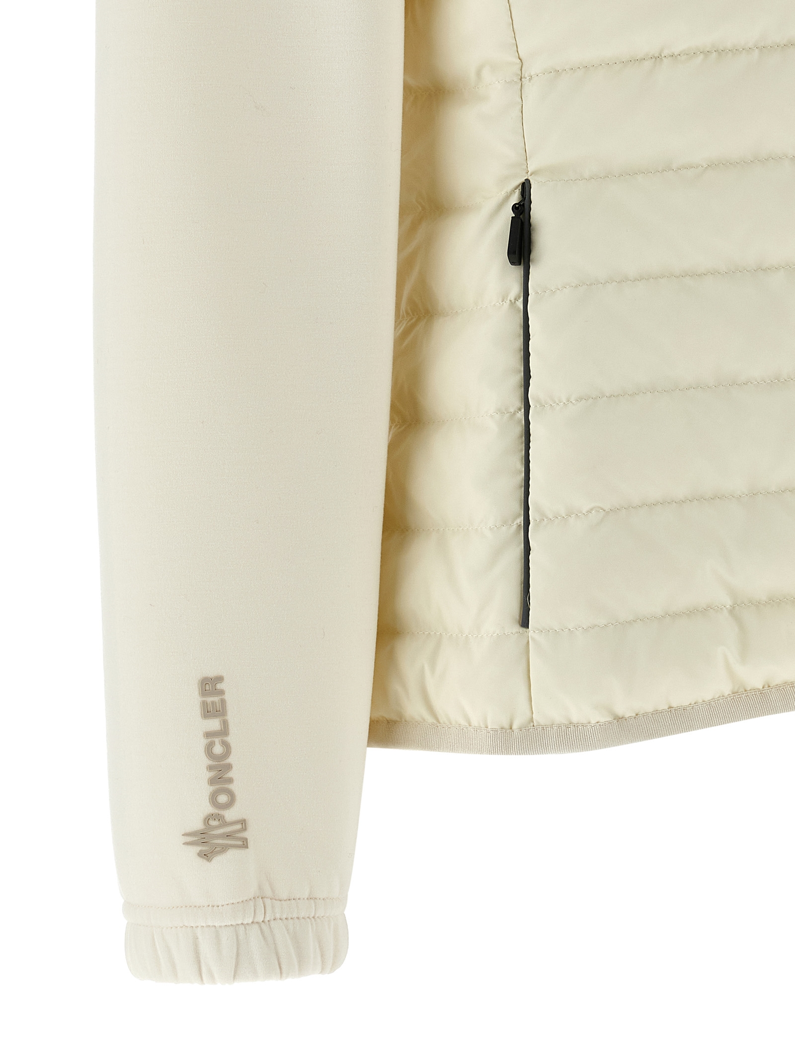 Hoodie in polyester and viscose blend doubled fabric with quilted and slightly padded goose down front saison longue part, front zip closure, pockets, long sleeves with elastic cuffs and logo patch appliqué, and back drawstring at the waist.