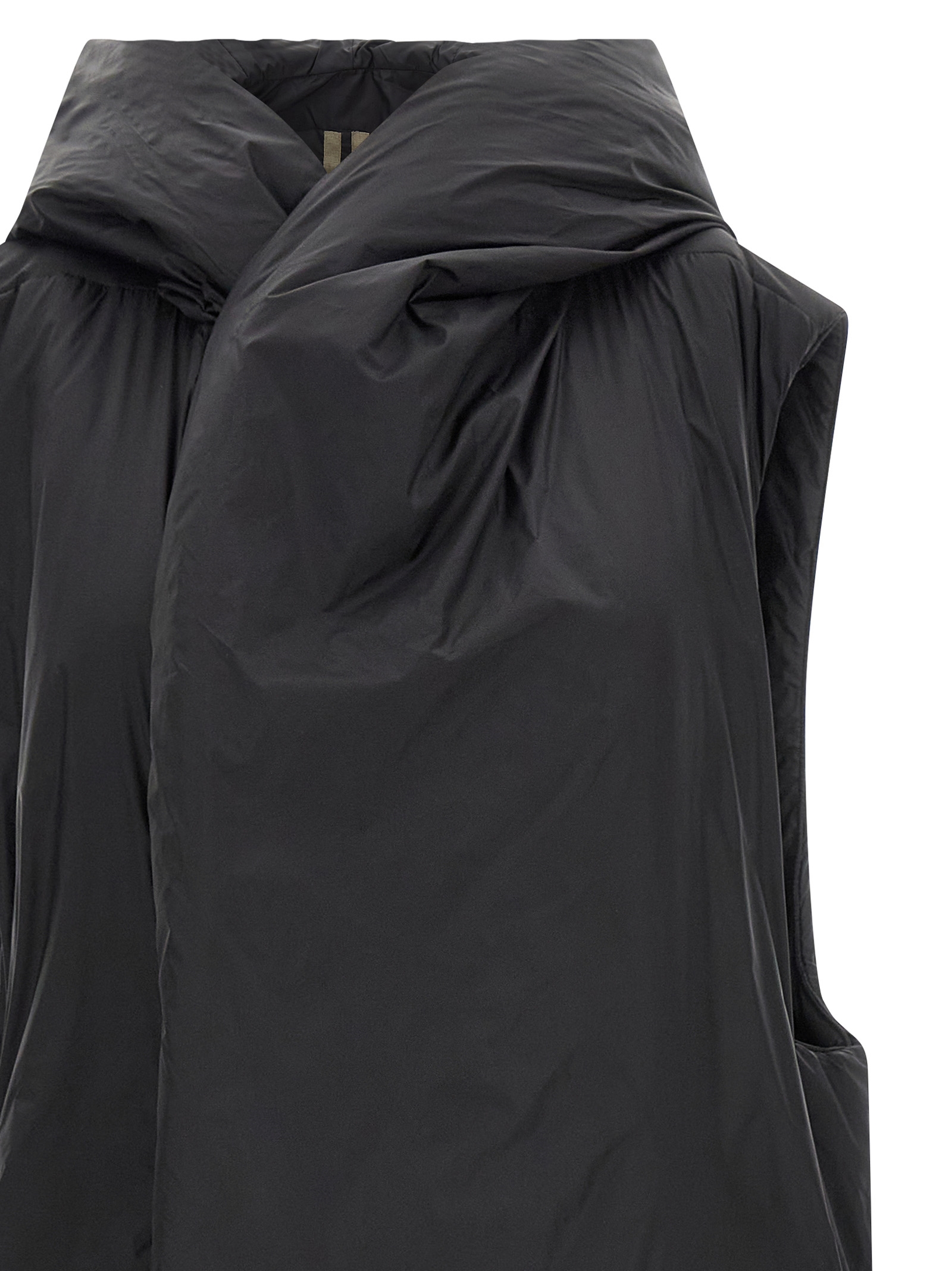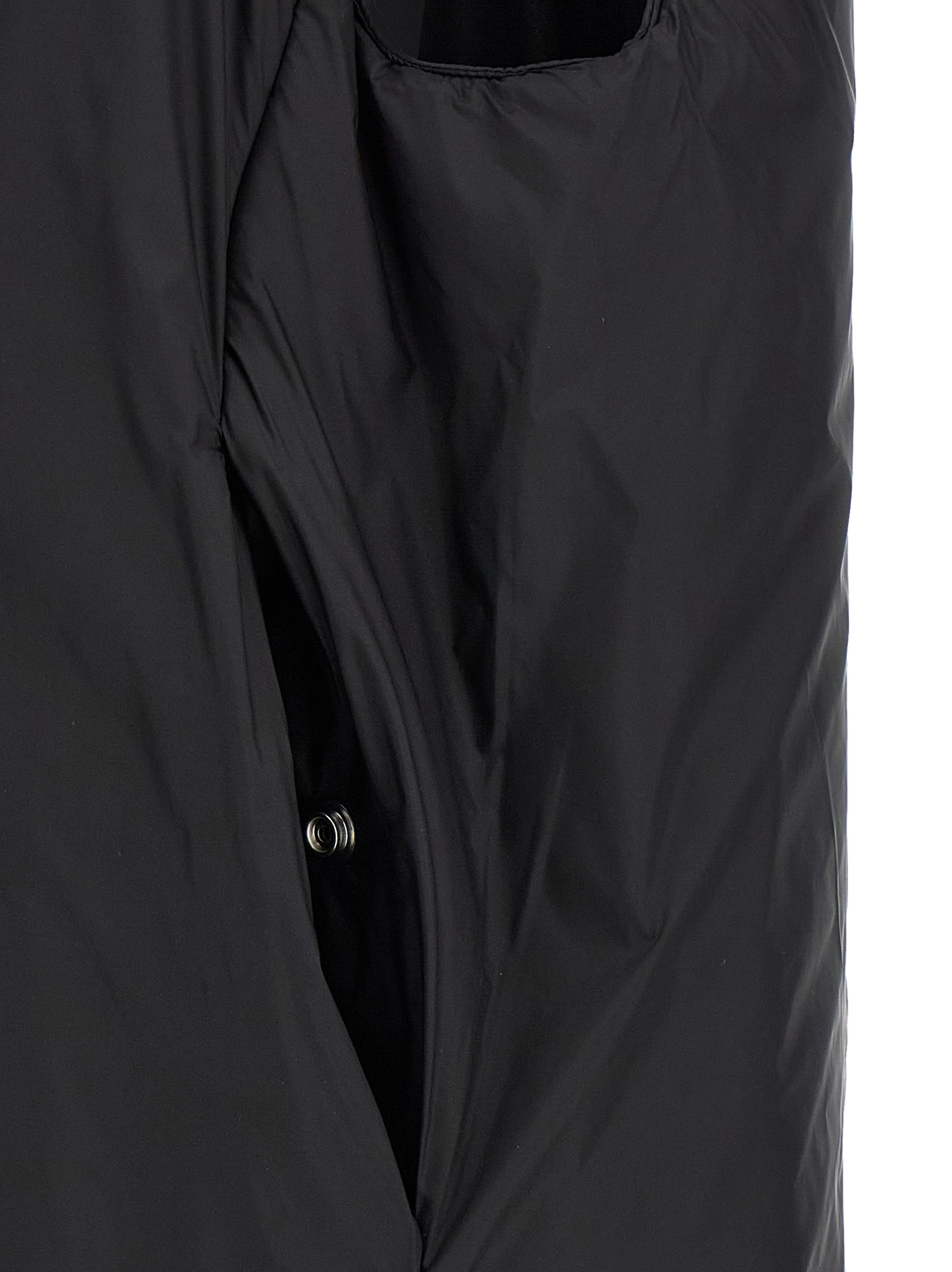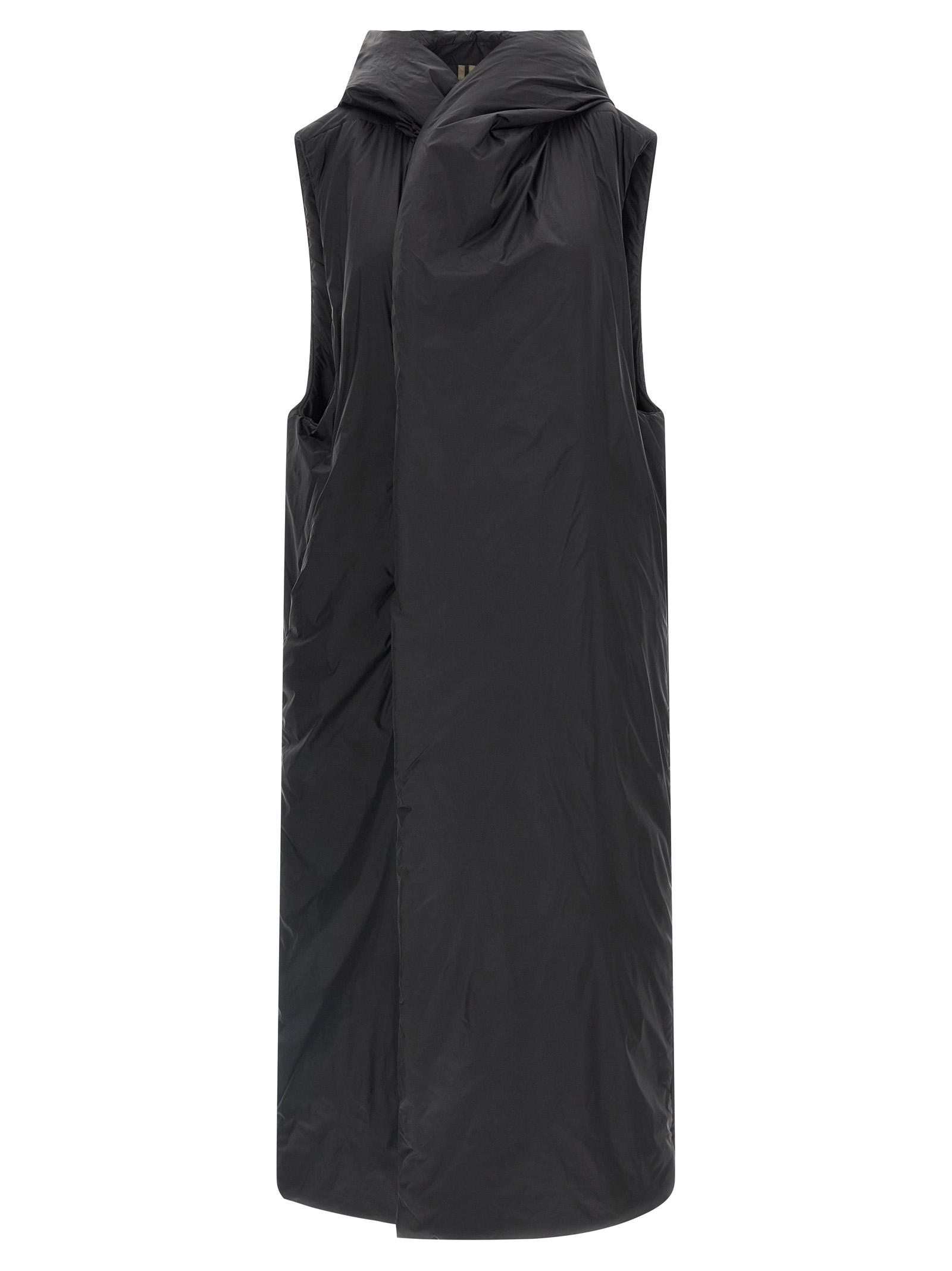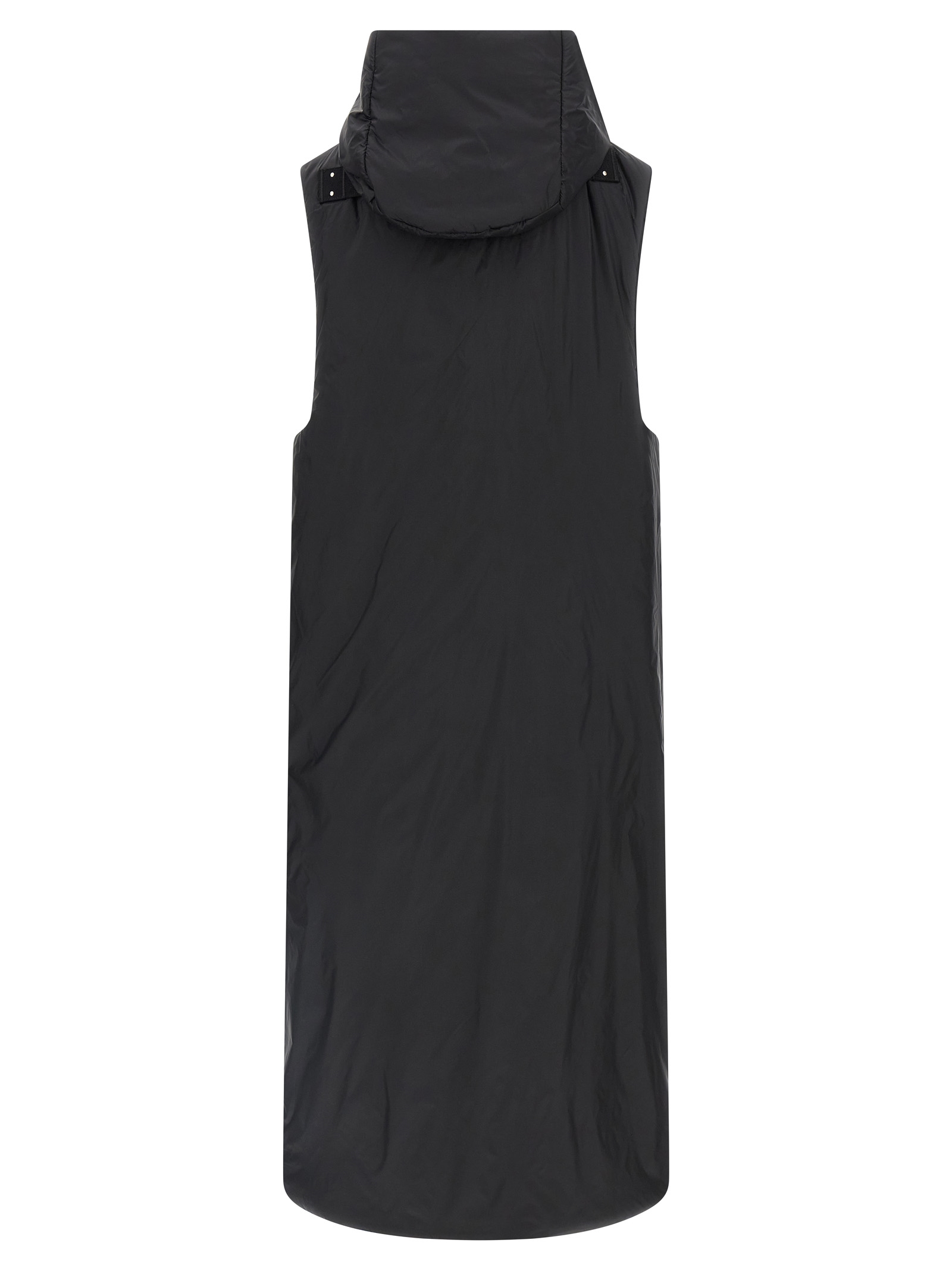 Padded nylon long vest, hood, high neck, front asymmetric snap button closure, pockets, tone-on-tone cotton tape with back rivets.