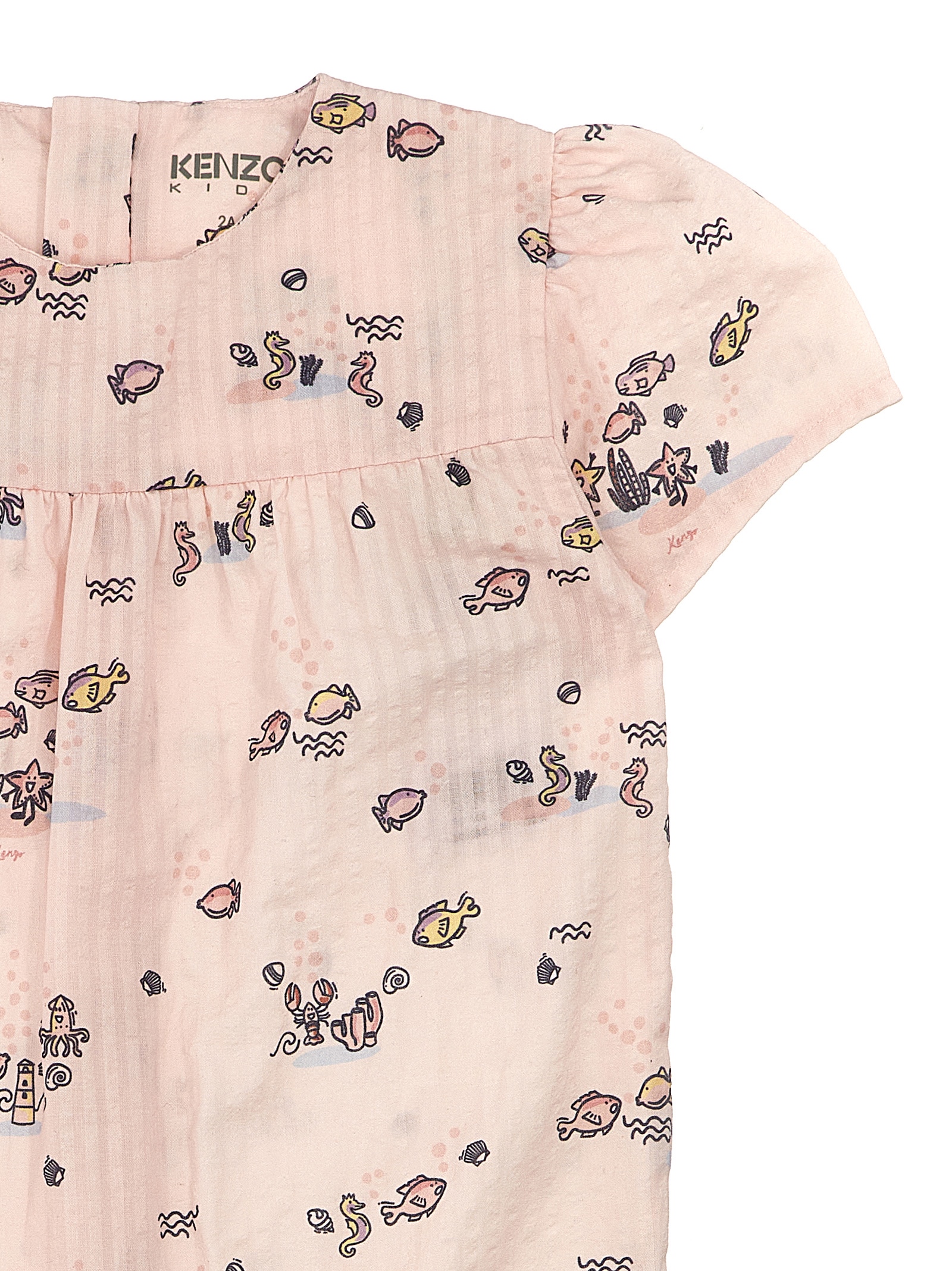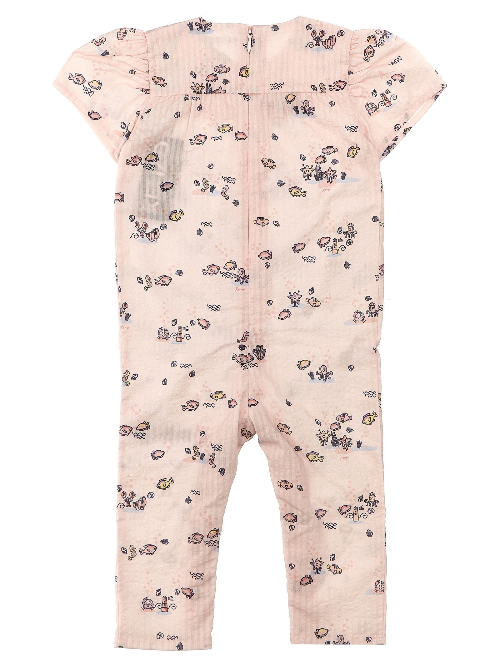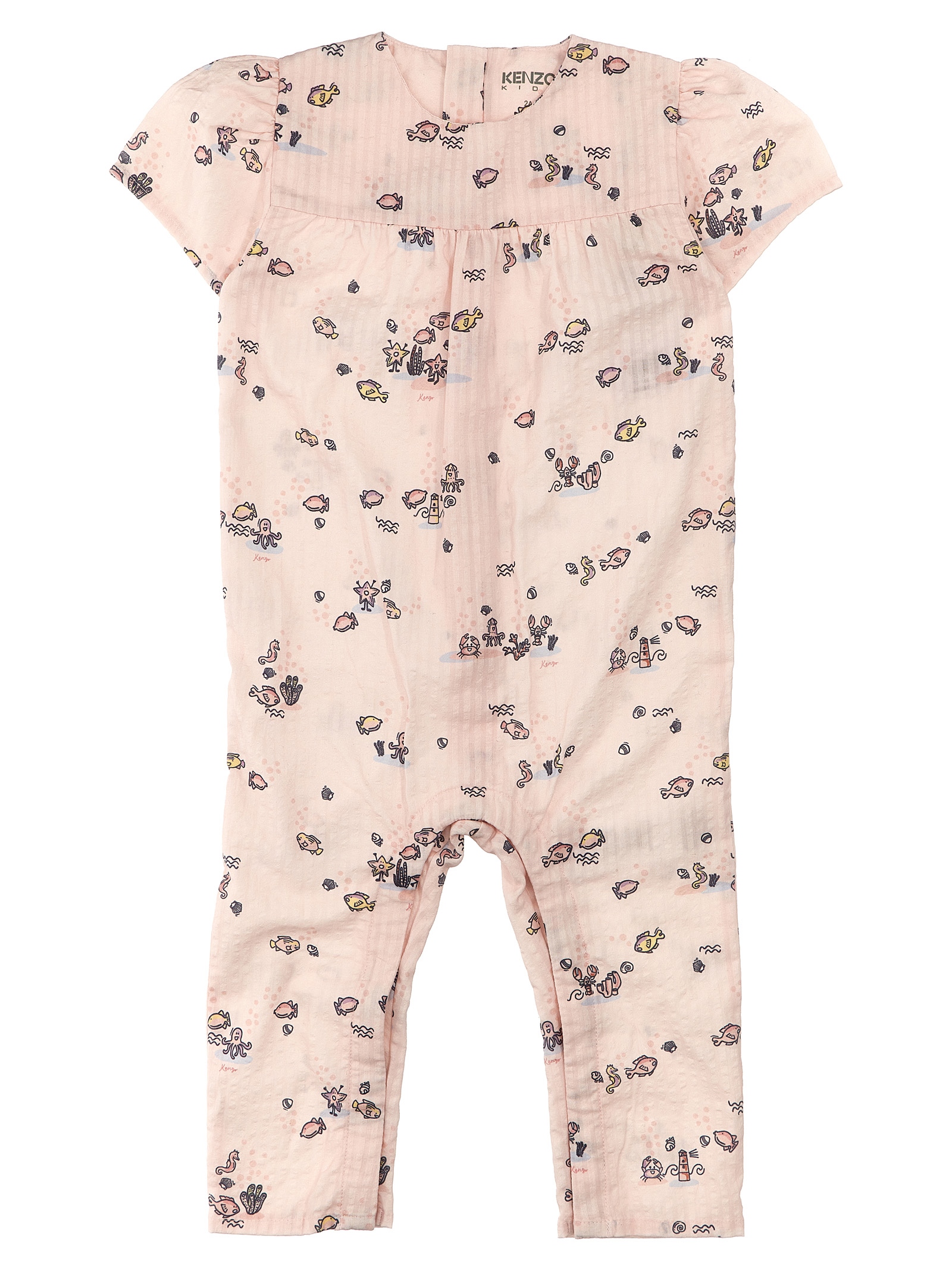 Cotton straw with all-over print, back zip closure, long leg, short sleeves.