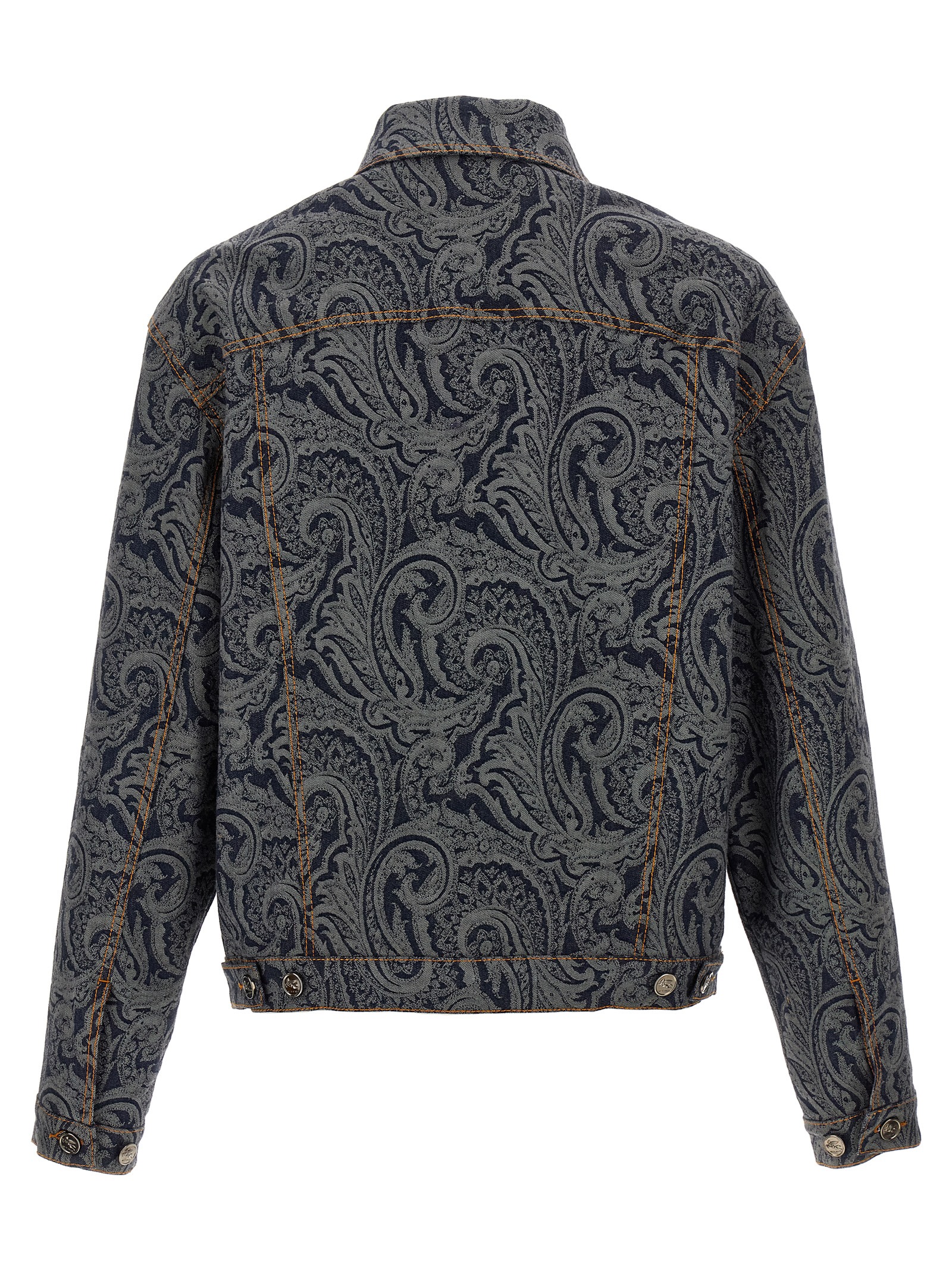 Jacquard cotton denim jacket with all-over Paisley pattern, shirt collar, metal button closure, pockets, long sleeves with cuffs.