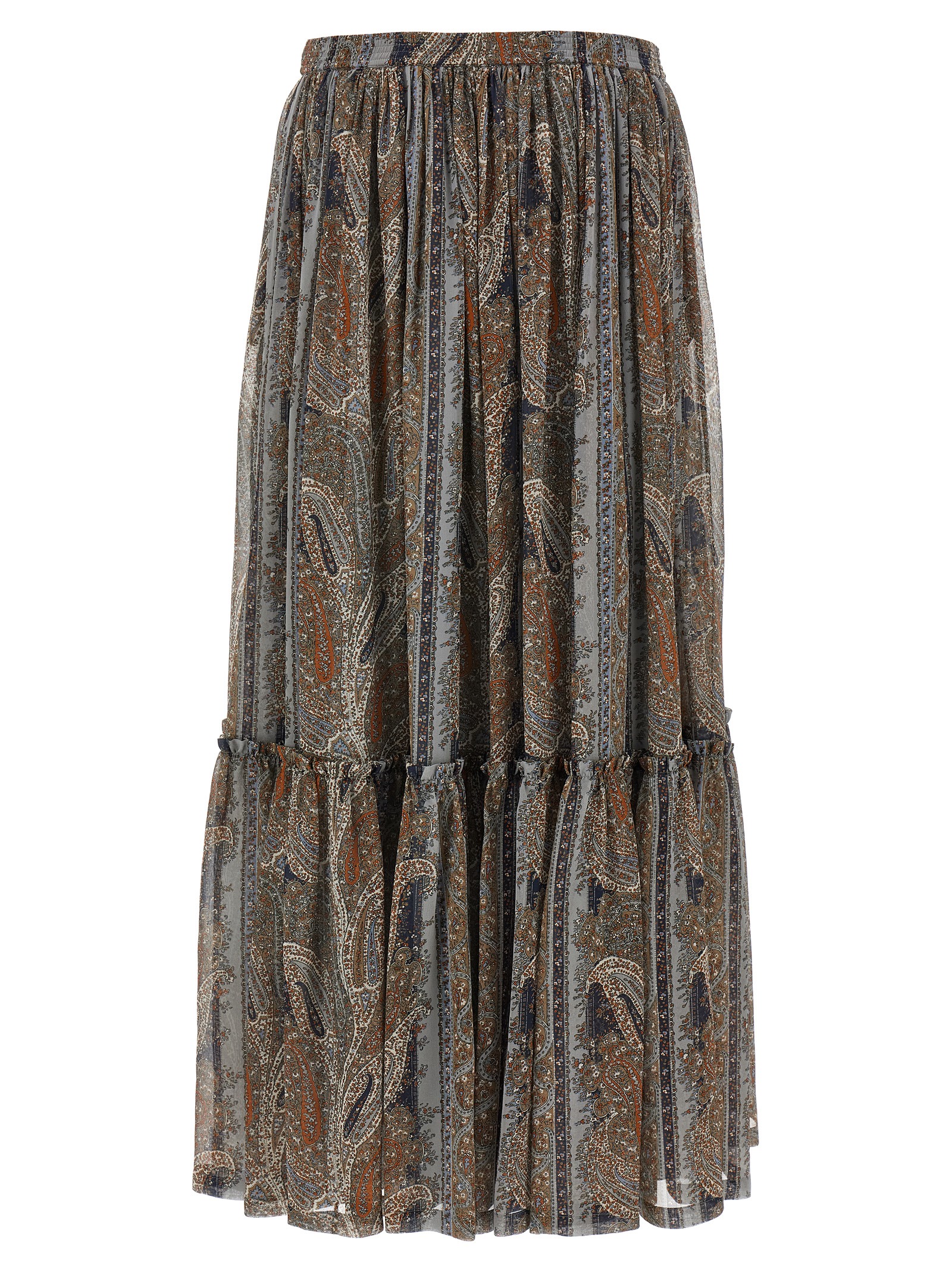 Paisley print long skirt in silk, silk georgette underskirt, elastic waistband, pockets.