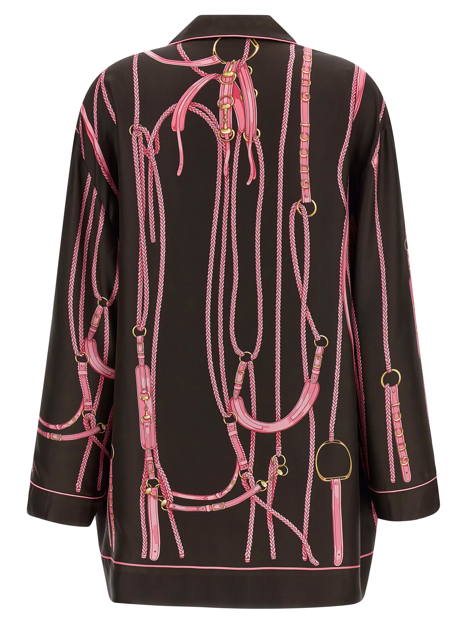 All-over clamp print silk shirt, pajama style with peak lapel neckline, front pockets, front button closure, contrast piping, long sleeves.