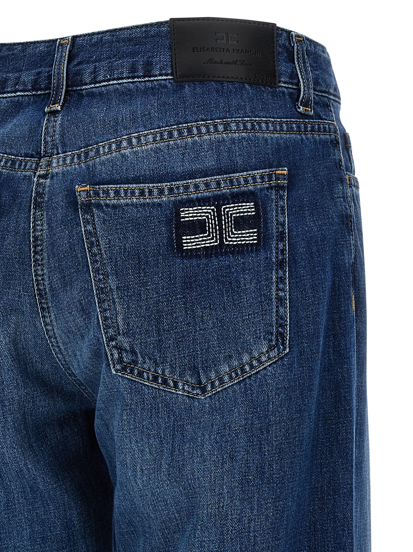 Stonewashed cotton denim jeans with low waist, wide palace leg, back logo embroidery, front zip and button closure, five pockets.