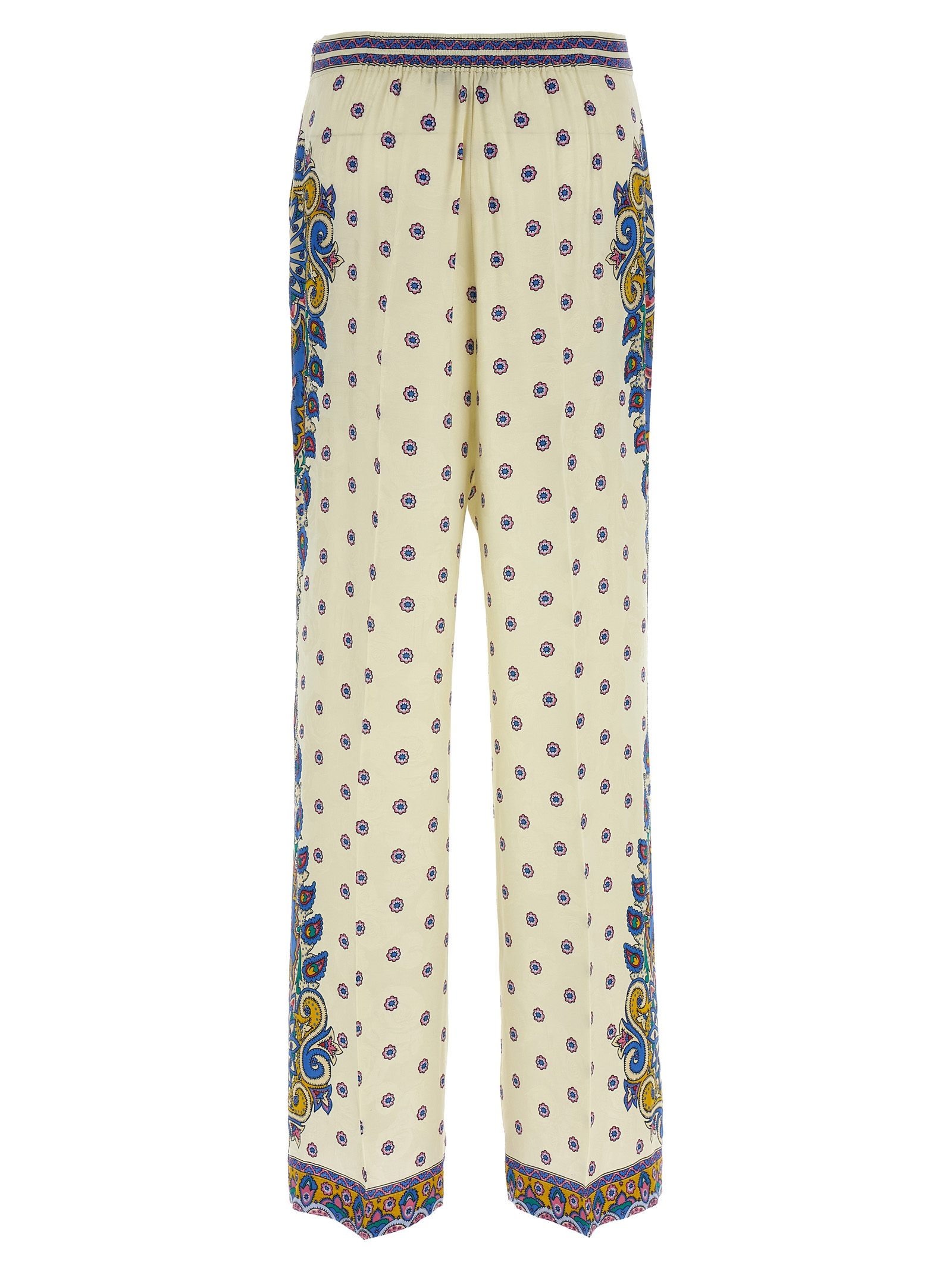 Silk blend pants with jacquard roses and floral patterned print, medallion pattern on the sides, palazzo model with wide leg, stretched pleat, side zip closure, pockets, elastic waistband at the back, pockets.