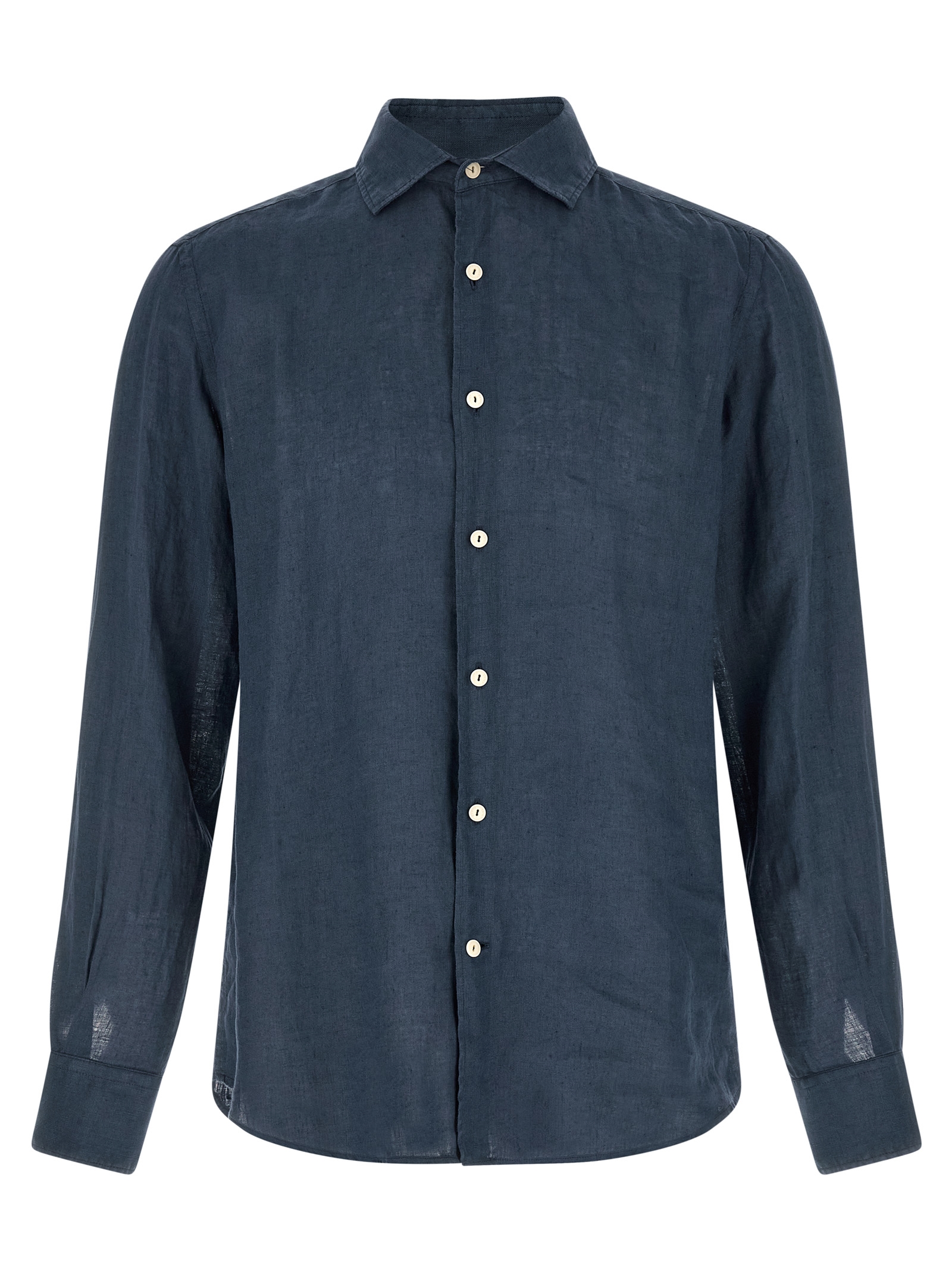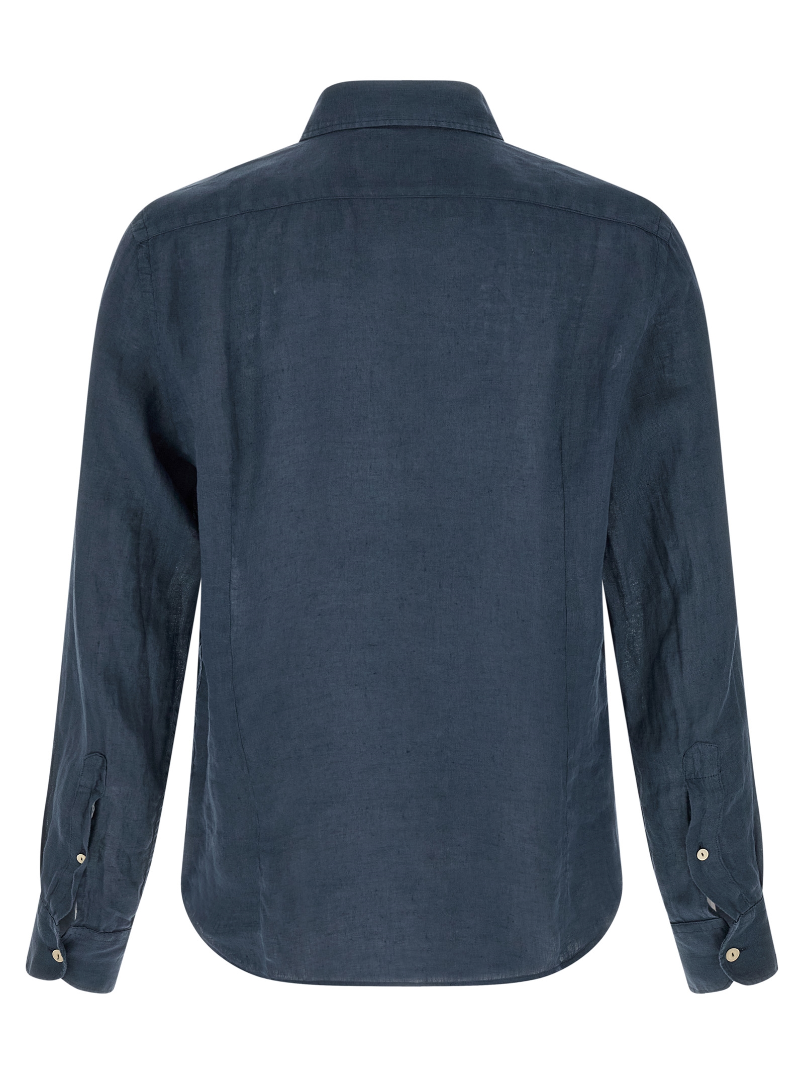 ‘Pamplona’ linen shirt with pointed collar, front button closure, rounded hem, long sleeves with cuffs and buttons.