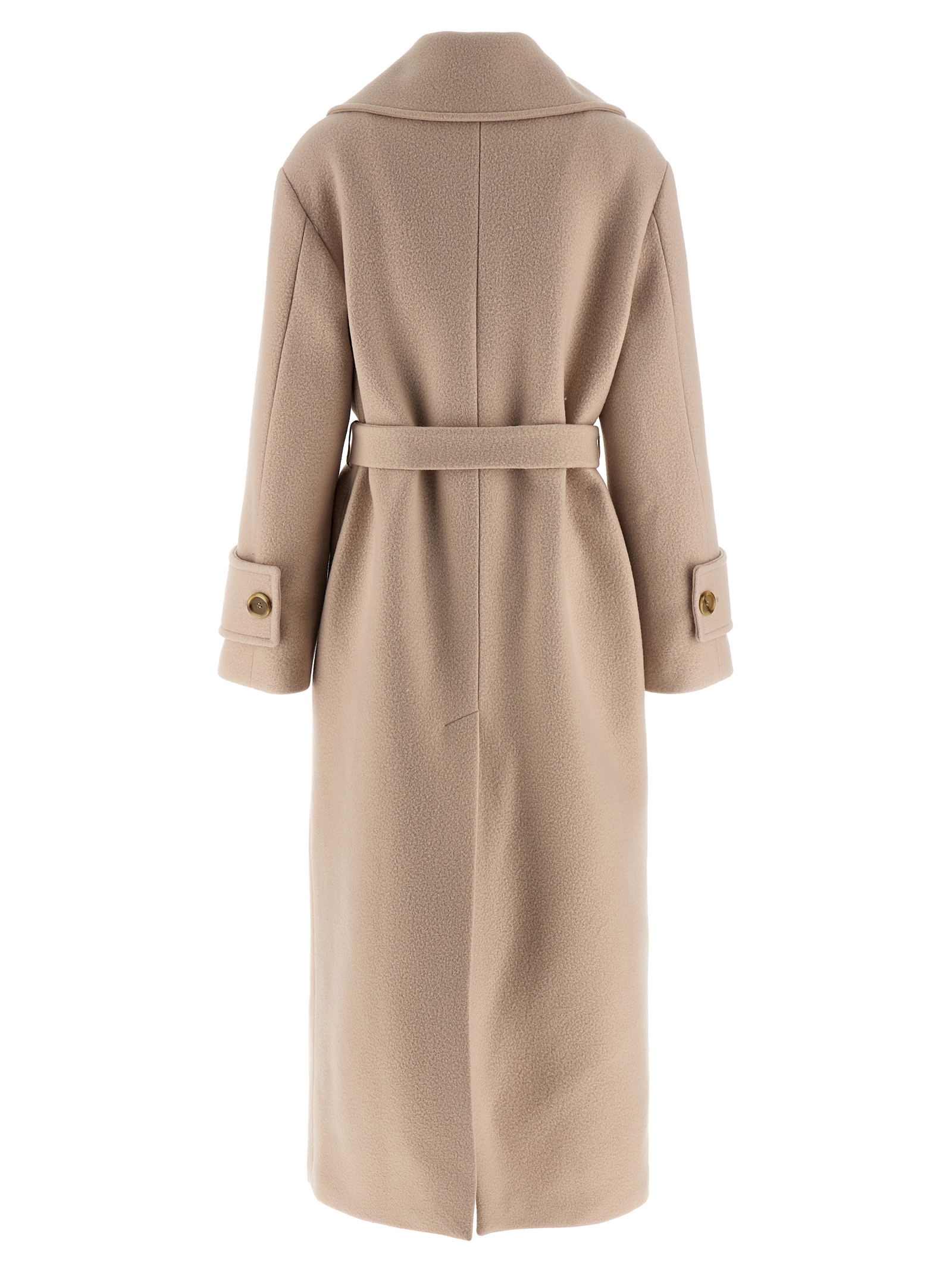 ‘Paquita’ coat in wool-effect fabric, shirt collar with flap that can be closed at the neck, front closure with covered buttons, knotted belt at the waist, long sleeves with martingale on the cuff.