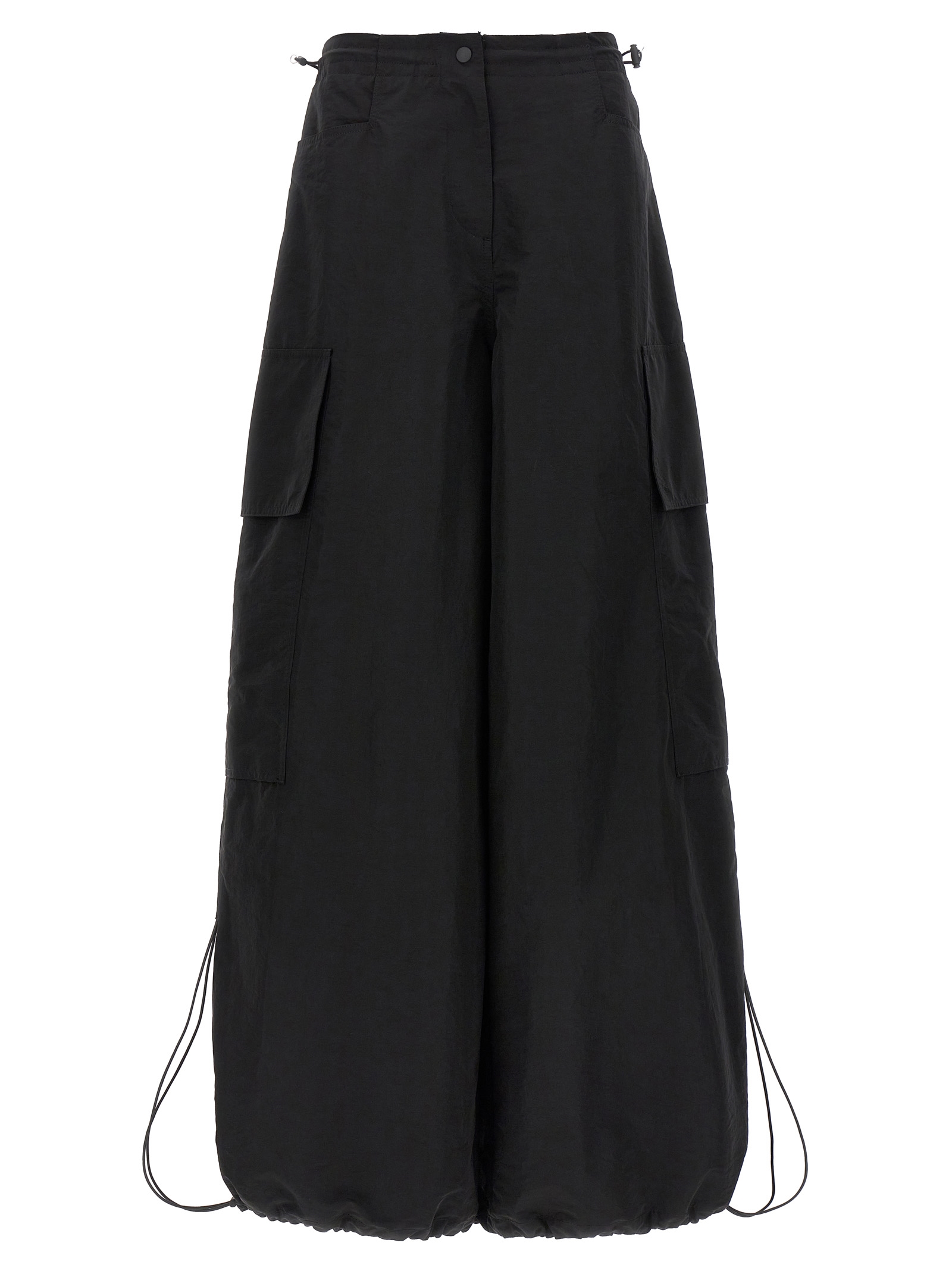 Parachute pants in nylon with zipper and button closure, adjustable elastic drawstring at the waist, pockets, and adjustable elastic cuffs with drawstring.