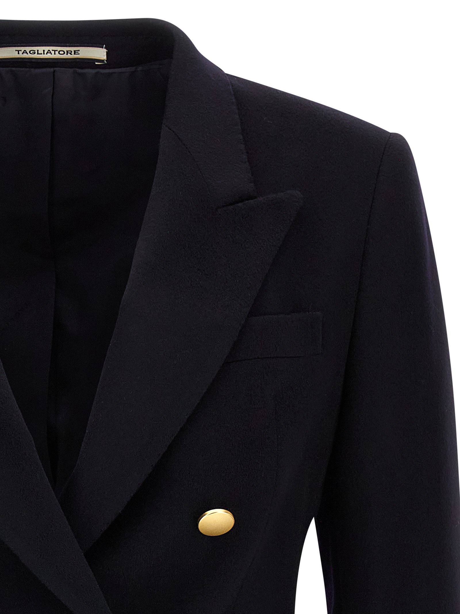 ‘Parigi’ double-breasted cashmere blazer with front metal button closure, peak lapels, breast pocket, flap pockets, structured shoulder straps, long sleeves, back split, monogram cupro lining.